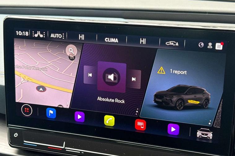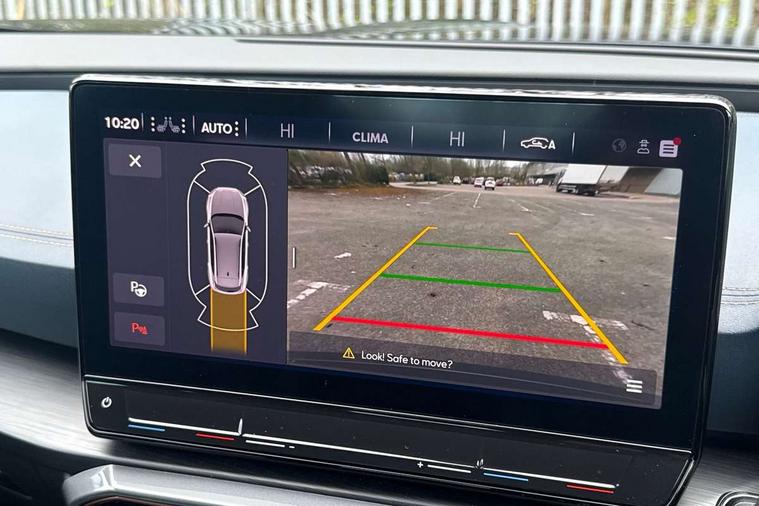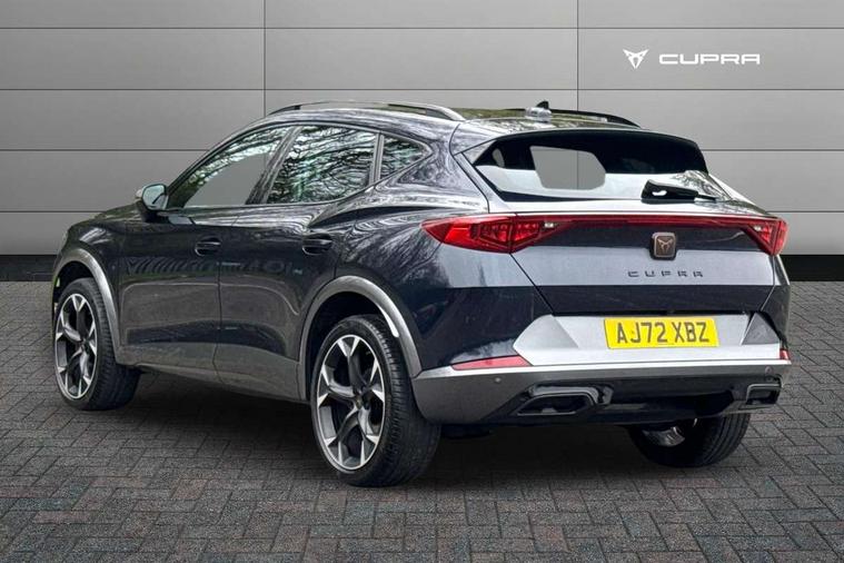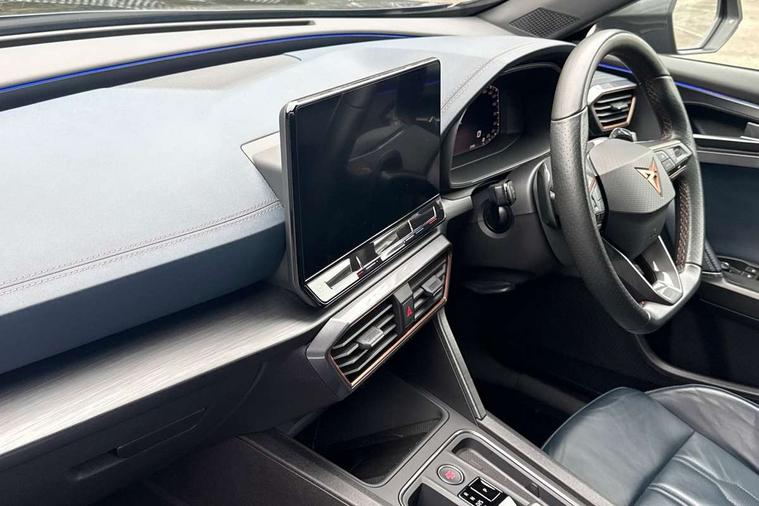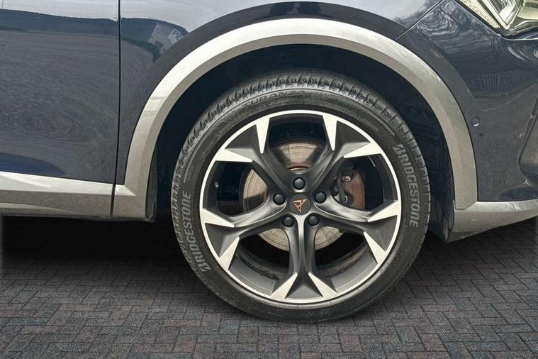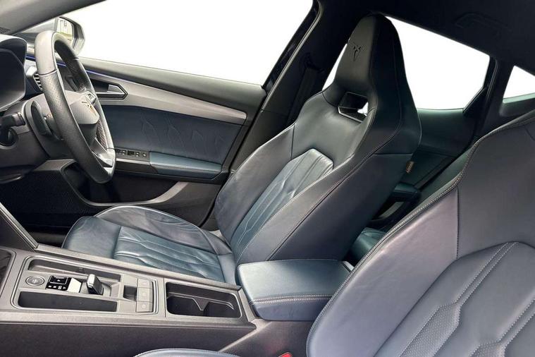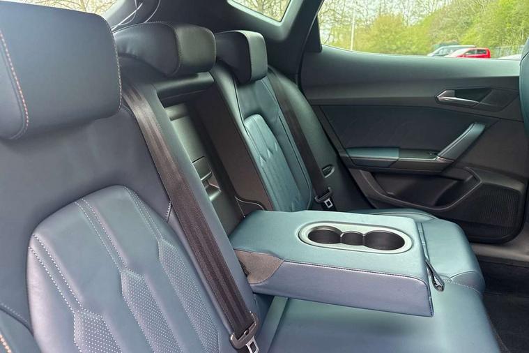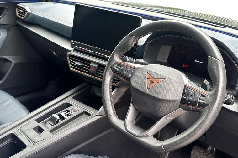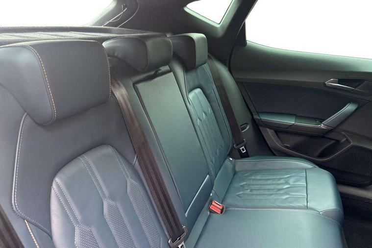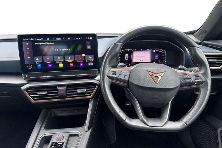 Digital cockpit and configurable dashboard, Driver alert system, Driving profile selection, Forward collision warning with automatic braking, Lane assist, Navigation system with 12'' Touchscreen Display, Park assist (inc front/rear parking sensors), PAS, Predictive adaptive cruise control with speed limiter, Rear view camera, RPM, trip computer, outside temp gauge, instrument light brightness, low fuel warning light, lights on reminder, gearshift indicator, Service interval indicator, Start/stop system with regenerative braking, Voice control system, Wireless apple carplay, Wireless phone charger, Electronic locking differential and dynamic traction support, Standard suspension, 2 front and 2 rear USB type C sockets, Auxiliary input socket, DAB radio, Auto dimming rear view mirror, Body colour door handles, Body coloured bumpers, Dark grey wing mirror, Daytime running light with automatic headlight control and coming home feature, Dynamic headlight range control, Electric front/rear windows, Electrically adjustable heated and folding door mirrors with memory function, Front fog lamps with cornering function, Gloss black roof rails and window surrounds, LED Headlights, LED Taillights with dynamic indicator, Rain sensing wipers, Rear diffuser with black simulated exhaust pipes, Rear side wing doors, Rear wash/wipe, Third brake light, Tinted rear windows, Welcome lights, 12v power supply in centre console, 12V socket, 12v socket in loadspace, 2 front and 2 rear reading lights, 230V socket, 3 seat bench in 2nd row, 60/40 split rear bench seat with armrest and mechanical seat release, Black headlining, Dust/pollen filter, Front and rear head restraints, Front centre armrest, Height/reach adjust steering wheel, Illuminated interior front door sills, Illuminated sunvisor with mirror, Isofix, Leather multi function heated steering wheel with gear shift paddles, Luggage tie-down hooks, Single front passenger seat, Three zone climate control with control panel in rear, Variable luggage/load compartment floor, Wraparound lighting, Genuine Nappa leather Pack - Cupra, 3 point seatbelts on all rear seats, ABS, Brake control system - ESC and brake booster, Child proof door locks, Driver and front passenger airbags with front passenger airbag de-activation, Electronic parking brake, Front and rear disc brakes, Front side curtain airbags, Hill hold control, Public e-call, Seat belt reminder for front and rear seats, Tyre pressure monitoring system, Anti theft alarm system, Keyless entry and start system (KESSY), Locking wheel bolts, Copper and aluminium interior detailing, 19" 'Exclusive' machined sport matte black and silver alloy wheels,