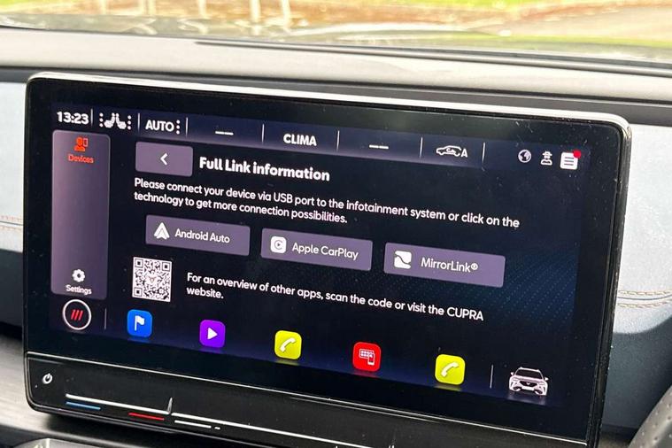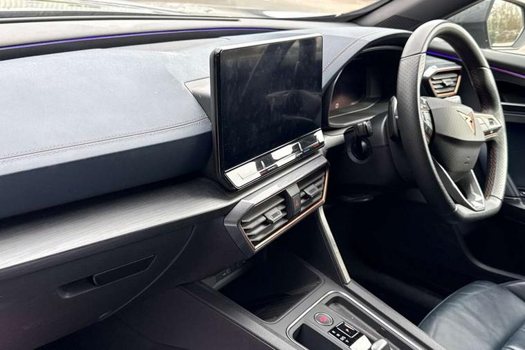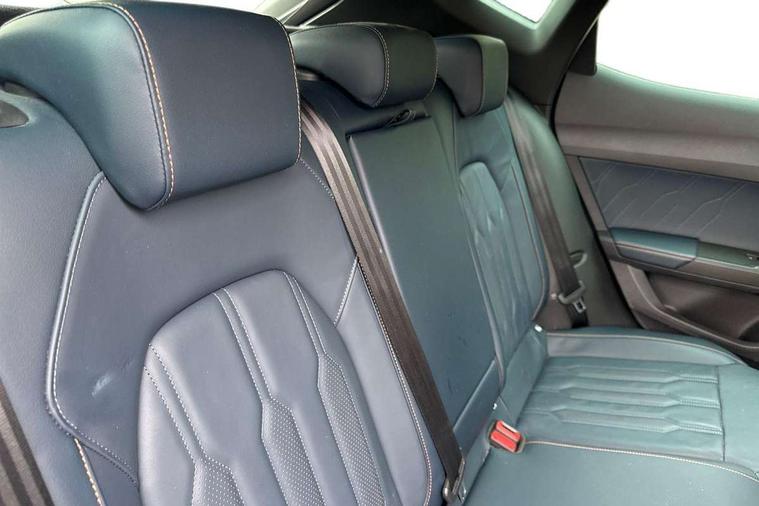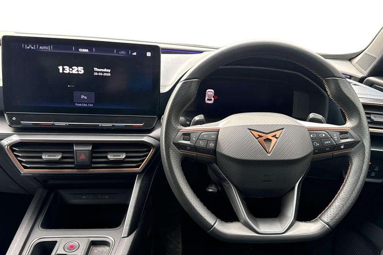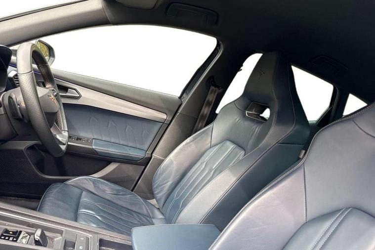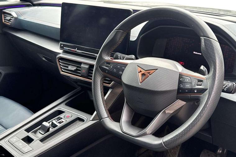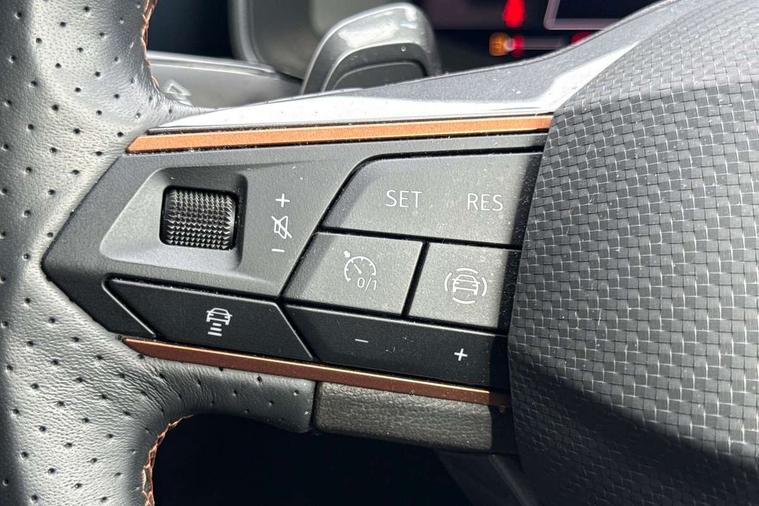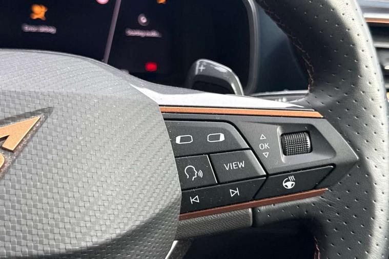 Digital cockpit and configurable dashboard, Driver alert system, Driving profile selection, Forward collision warning with automatic braking, Lane assist, Navigation system with 12'' Touchscreen Display, Park assist (inc front/rear parking sensors), PAS, Predictive adaptive cruise control with speed limiter, Rear view camera, RPM, trip computer, outside temp gauge, instrument light brightness, low fuel warning light, lights on reminder, gearshift indicator, Service interval indicator, Start/stop system with regenerative braking, Voice control system, Wireless apple carplay, Wireless phone charger, Electronic locking differential and dynamic traction support, Standard suspension, 2 front and 2 rear USB type C sockets, Auxiliary input socket, DAB radio, Auto dimming rear view mirror, Body colour door handles, Body coloured bumpers, Dark grey wing mirror, Daytime running light with automatic headlight control and coming home feature, Dynamic headlight range control, Electric front/rear windows, Electrically adjustable heated and folding door mirrors with memory function, Front fog lamps with cornering function, Gloss black roof rails and window surrounds, LED Headlights, LED Taillights with dynamic indicator, Rain sensing wipers, Rear diffuser with black simulated exhaust pipes, Rear side wing doors, Rear wash/wipe, Third brake light, Tinted rear windows, Welcome lights, 12v power supply in centre console, 12V socket, 12v socket in loadspace, 2 front and 2 rear reading lights, 230V socket, 3 seat bench in 2nd row, 60/40 split rear bench seat with armrest and mechanical seat release, Black headlining, Dust/pollen filter, Front and rear head restraints, Front centre armrest, Height/reach adjust steering wheel, Illuminated interior front door sills, Illuminated sunvisor with mirror, Isofix, Leather multi function heated steering wheel with gear shift paddles, Luggage tie-down hooks, Single front passenger seat, Three zone climate control with control panel in rear, Variable luggage/load compartment floor, Wraparound lighting, Genuine Nappa leather Pack - Cupra, 3 point seatbelts on all rear seats, ABS, Brake control system - ESC and brake booster, Child proof door locks, Driver and front passenger airbags with front passenger airbag de-activation, Electronic parking brake, Front and rear disc brakes, Front side curtain airbags, Hill hold control, Public e-call, Seat belt reminder for front and rear seats, Tyre pressure monitoring system, Anti theft alarm system, Keyless entry and start system (KESSY), Locking wheel bolts, Copper and aluminium interior detailing, 19" 'Exclusive' machined sport matte black and silver alloy wheels,
