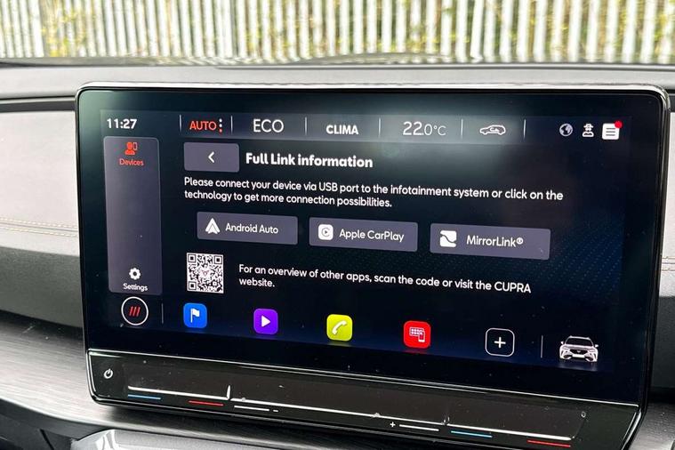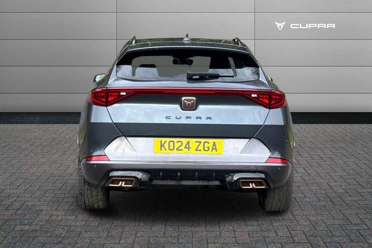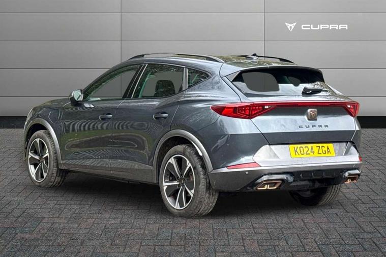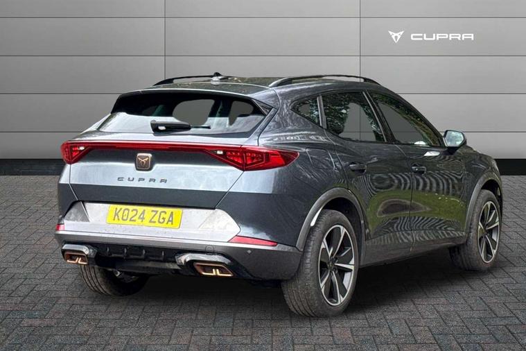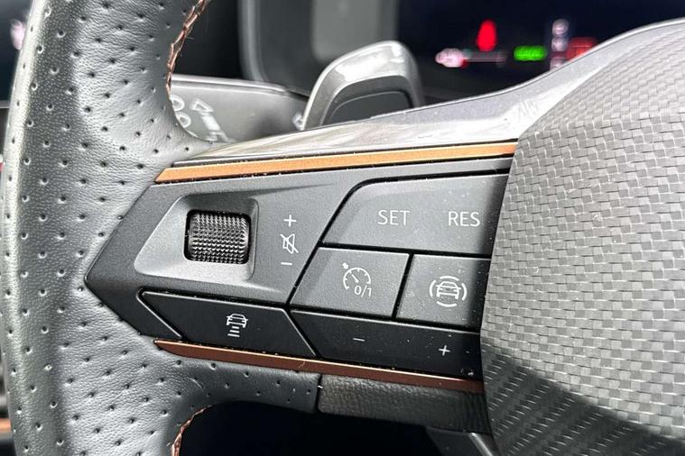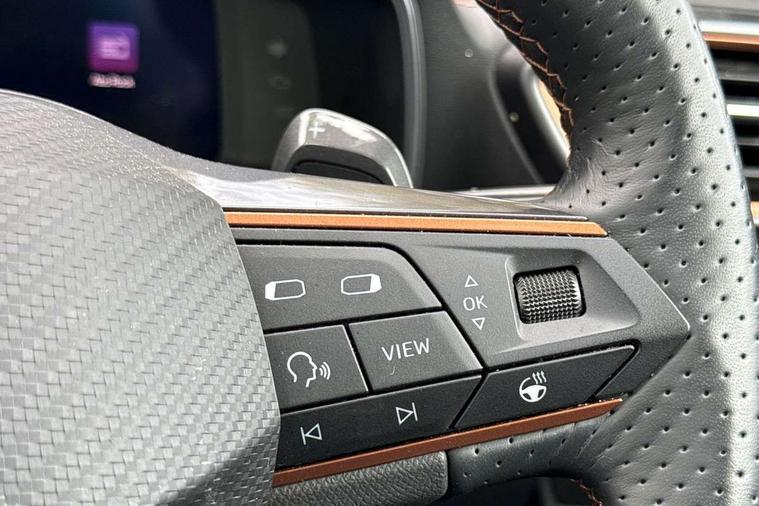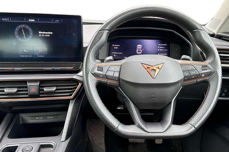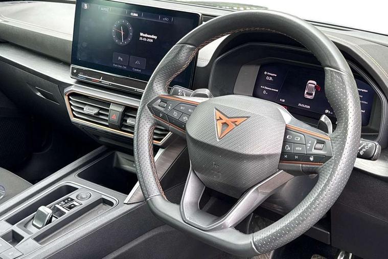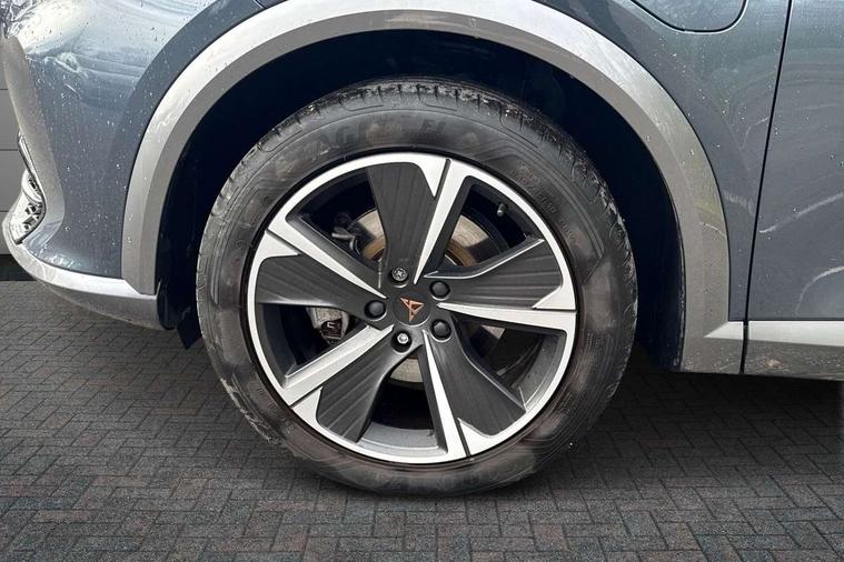 Digital cockpit and configurable dashboard, Driver alert system, Driving profile selection, Forward collision warning with automatic braking, Lane assist, Navigation system with 12'' Touchscreen Display, PAS, Predictive adaptive cruise control with speed limiter, Rear parking sensors, RPM, trip computer, outside temp gauge, instrument light brightness, low fuel warning light, lights on reminder, gearshift indicator, Service interval indicator, Start/stop system with regenerative braking, Voice control system, Wired Android Auto, Wireless apple carplay, Wireless phone charger, 10 amp mode 2 charging cable, 16 amp mode 3 charging cable, 3.6 kw On-board charger, Electronic locking differential and dynamic traction support, Standard suspension, 2 front and 2 rear USB type C sockets, DAB radio, Auto dimming rear view mirror, Body colour door handles, Body coloured bumpers, Dark grey wing mirror, Daytime running light with automatic headlight control and coming home feature, Dynamic headlight range control, Electric front/rear windows, Electrically adjustable, heated and folding door mirrors, Front fog lamps with cornering function, Gloss black roof rails and window surrounds, LED Headlights, LED Taillights with dynamic indicator, Rain sensing wipers, Rear diffuser with black simulated exhaust pipes, Rear side wing doors, Rear wash/wipe, Third brake light, Tinted rear windows, Welcome lights, 12V socket, 2 front and 2 rear reading lights, 3 seat bench in 2nd row, 60/40 split rear bench seat with armrest and mechanical seat release, Dust/pollen filter, Front and rear head restraints, Front centre armrest, Height/reach adjust steering wheel, Illuminated interior front door sills, Illuminated sunvisor with mirror, Interior ambient lighting, Isofix, Leather multi function heated steering wheel with gear shift paddles, Manually adjustable height and lumbar support for front seats, PVC/Cloth upholstery with copper stitching + Sport seats, Single front passenger seat, Three zone climate control with control panel in rear, Safety and driving pack (M) - Formentor, 3 point seatbelts on all rear seats, ABS, Brake control system - ESC and brake booster, Child proof door locks, Driver and front passenger airbags with front passenger airbag de-activation, Electronic parking brake, Front and rear disc brakes, Front side curtain airbags, Hill hold control, Public e-call, Seat belt reminder for front and rear seats, Tyre pressure monitoring system, Anti theft alarm system, Keyless entry and start system (KESSY), Locking wheel bolts, Copper and aluminium interior detailing, Tyre repair kit,