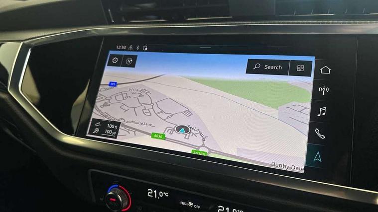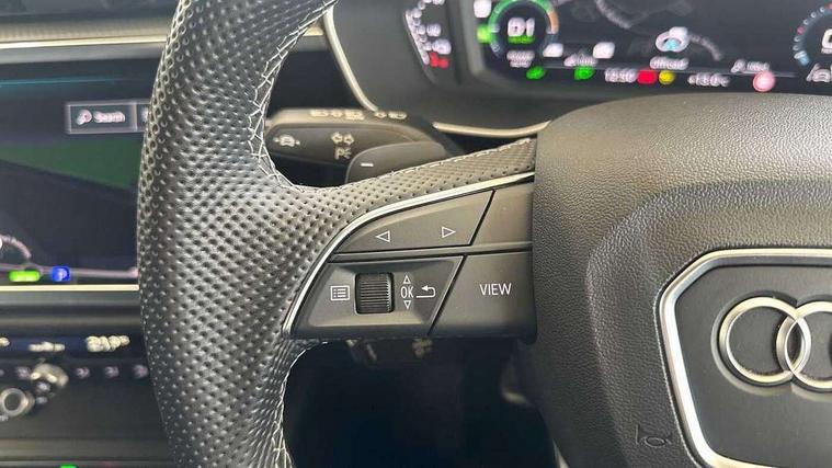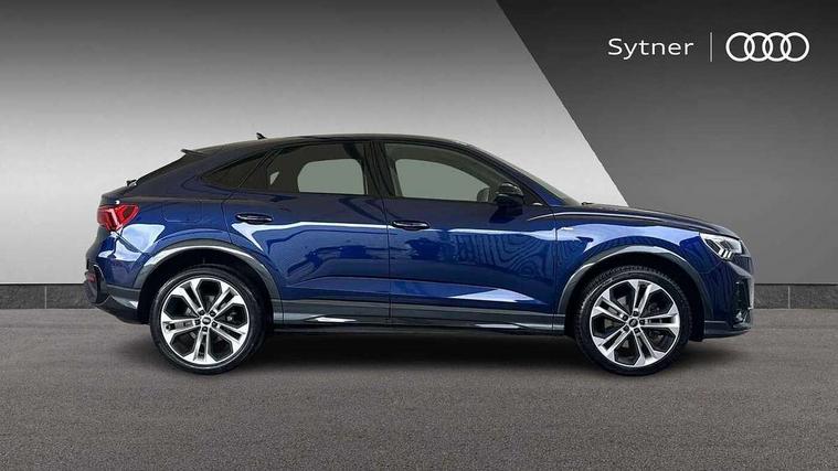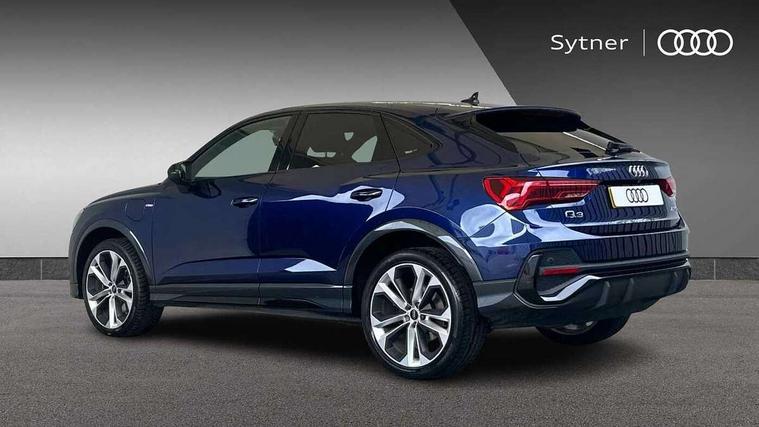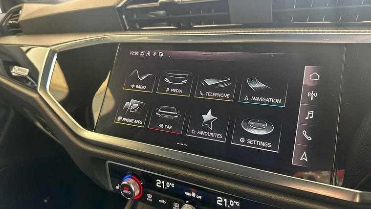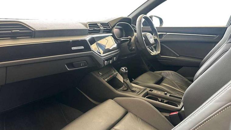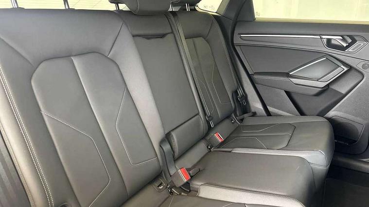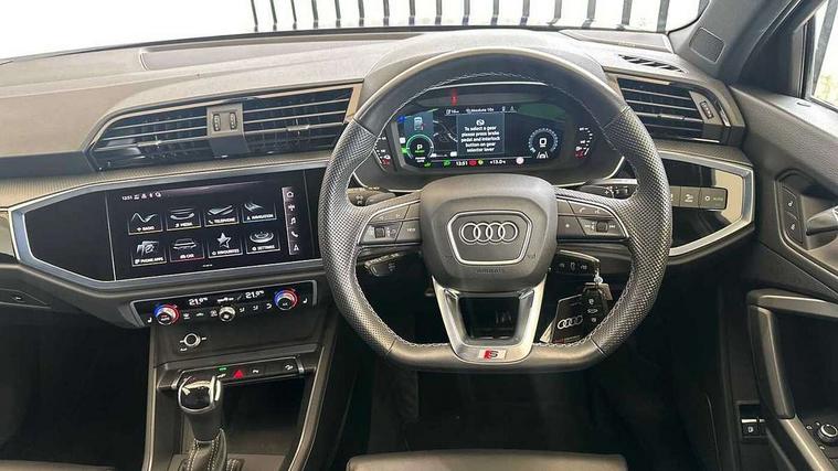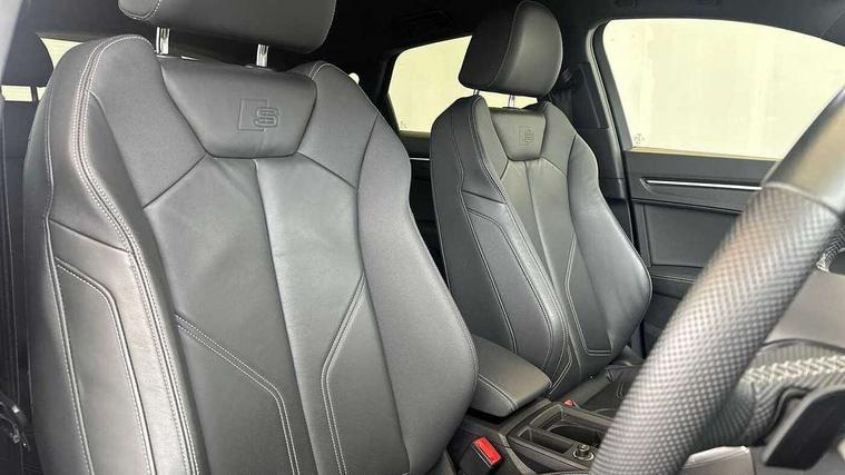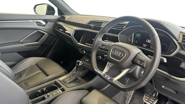 Audi connect safety and service (e-call), Audi drive select, Audi lane departure warning, Audi side assist, Audi smartphone interface includes wireless Apple carplay/Android Auto, Audi virtual cockpit plus, Bluetooth interface, Camera based traffic sign recognition, MMI Navigation Plus with high resolution 10.1 inch touchscreen colour display, Power operated tailgate, Progressive steering, Service interval indicator, Start stop system with recuperation, Voice control system with natural language interaction, Sports suspension, 1 x USB type C and 1 USB type A charging points, 6 passive loudspeakers, DAB digital radio module, Acoustic windscreen, Audi Beam uses LEDs to project the Audi Sport logo, Auto dimming frameless rear view mirror, Diffuser grille in grained matt black, Diffuser trim in selenite silver, Electrically folding, adjustable and heated door mirrors with integrated LED side indicators and kerb view function for passenger side, Front and rear electric windows, Front fog lights, Front underbody protection in manhattan grey paint finish, Grille surround in aluminium silver matt, Headlight washers, High gloss black finish B and C pillars, Matrix LED headlights with LED rear lights and dynamic front and rear indicator, Privacy glass dark tinted rear and rear-side windows (from B-pillar backwards), Rain and light sensors, Rear underbody protection in matt black, Side skirt insert in matt Platinium grey, 12V socket in rear centre console, 3 spoke flat bottomed high multi-function leather sport steering wheel with gearshift paddles, 4 way electric lumbar support for driver and front passenger, 40:20:40 folding with manual adjustment for 60:40 forwards/backwards position and backrest angle, Adjustable rear seat bench/backrest with centre armrest and cupholder, Black cloth headlining, Dual zone electronic climate control, Electrically adjustable front seats, Front and rear black floor mats with contrast stitching, Front and rear headrests, Front and rear roof module including reading lights, Front centre armrest, Glove compartment lighting, Heated front seats, Height and reach adjustable steering wheel, Illuminated door sill trims with S logo, ISOFIX child seat mounting for front passenger with airbag deactivation and outer rear seat including top tether attachment point for outer rear seats, Luggage compartment light, Perforated leather gearknob, Stainless steel luggage compartment sill finisher, Stainless steel pedals, Black styling pack - Q3, Multi coloured extended ambient interior lighting pack - Q3, Non smoking pack - Q3, 3x3 point rear seatbelts, 6 airbags - Driver, front passenger, curtain and side windows, Audi pre-sense front with pedestrain and cyclist recognition, Electrically operated child locks on rear doors, Electromechanical parking brake, Electronic stabilisation control including ABS, ASR and EDL, Hill descent control, Hill hold assist, Pre sense basic, Seatbelt monitoring, Tyre pressure warning, Warning triangle and first aid kit, Anti theft alarm, Anti theft wheel bolts, Remote central locking, Dark matt brushed aluminium inlay, Detail dashboard around MMI touch colour display in glass look, black with surround in aluminium look, Leatherette door armrest,