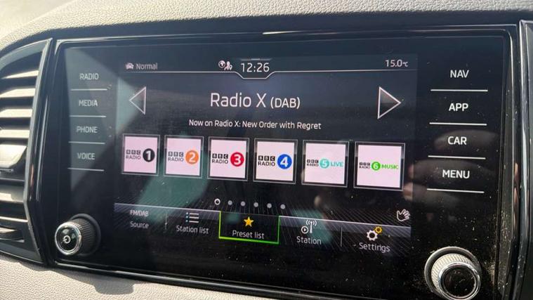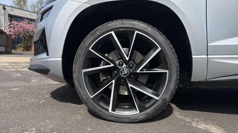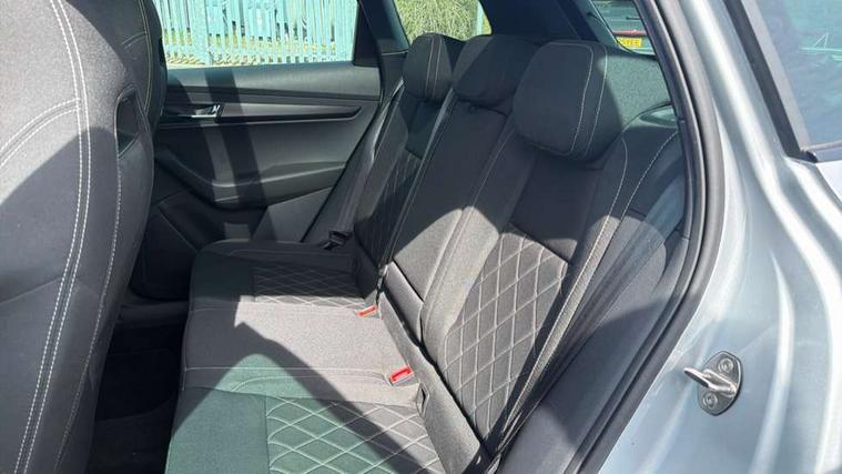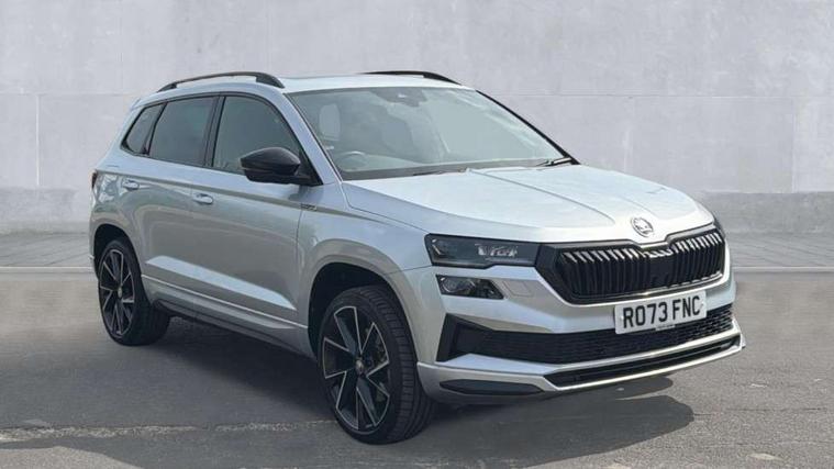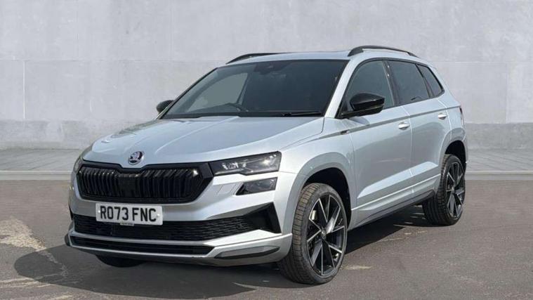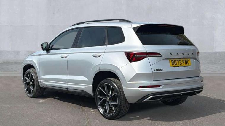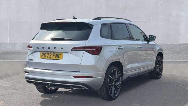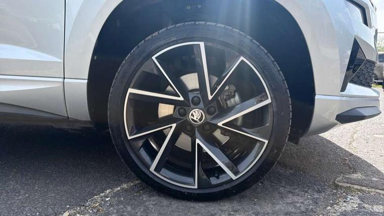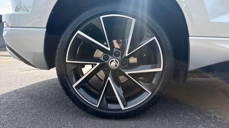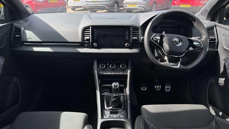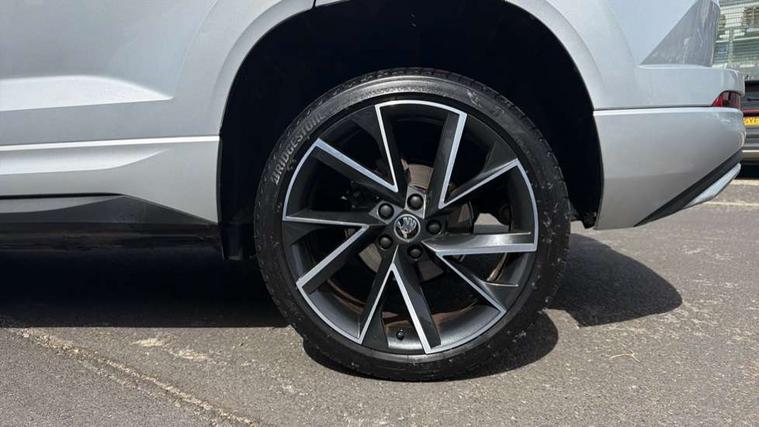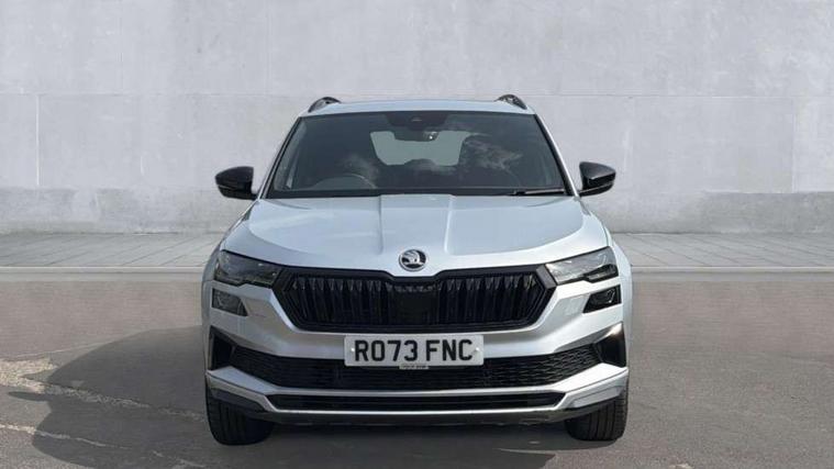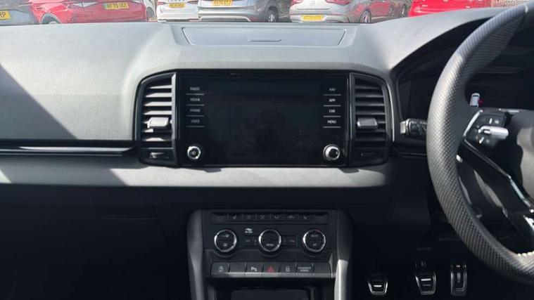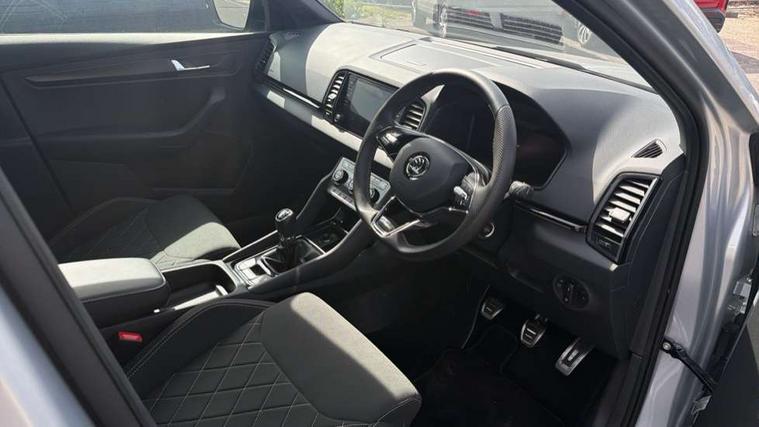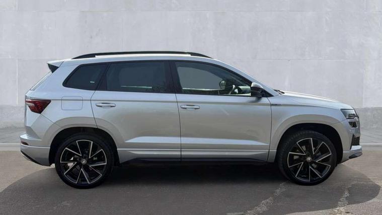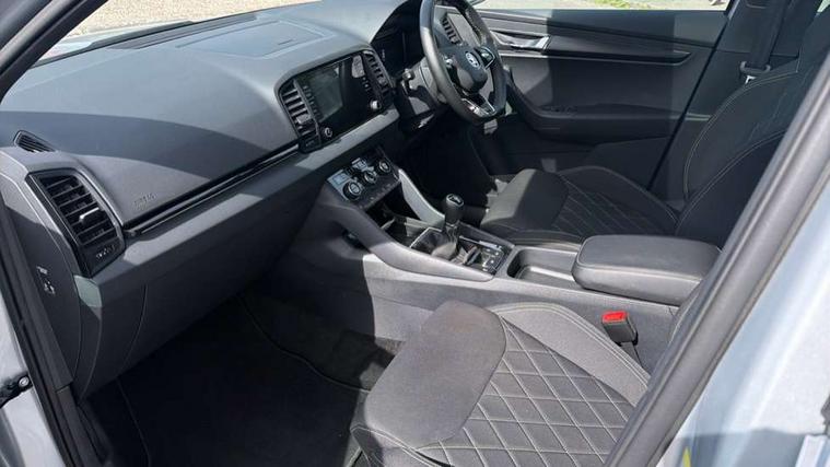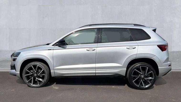 8" Digital display, Care connect, Driver fatigue sensor, Emergency services call system, Outside temperature gauge, Service interval indicator, SmartLink wireless for Apple and wired for Android, Start/stop system with regenerative braking, USB C Port x 2 in front centre console, Virtual cockpit, Virtual pedal with electrically operated boot door, 8 Speakers, DAB radio with Bluetooth, USB connection, Wireless charging without wireless aerial connection, Acoustic glass, Aero front windscreen wipers with intermittent function, Auto dimming rear view mirror with light and rain sensors, Black door mirrors, Black electric window control buttons, Black radiator grille, Black roof rails, Body colour door handles, Electric front and rear windows with child proof lock, Front door steps with SportLine logo, Heated rear windscreen, LED daytime running lights, LED rear lights with high functionality welcome effect and dynamic indicators, Light assistant (coming/leaving home/tunnel light), Panoramic sliding sunroof, Plastic scuff plates, Privacy glass, Protective door side sills in body colour, Rear diffuser, Rear side wing doors, Rear spoiler, Rear window wiper with washer system and intermittent control, Safety reflectors on front doors, Skoda lettering on tailgate in black, Sportline badge on front fender, Sportline decorative inserts with badging, Sports front and rear bumpers, 1.5 litre bottle holders in driver and front passenger door panels, 12V socket in boot, 12v socket in front centre armrest with storage compartment and rear air vents, 3 rear height adjustable headrests, 3 seat bench in 2nd row, 3 spoke leather sports multifunction steering wheel and silver stitching, 4 foldable roof handles with rear coat hooks, Black floor carpet, Black roof headlining, Chrome inner door handles, Double sided boot floor, Foldable hooks in the boot, Front head restraints, Height adjustable front three point seats belts with tensioners, Height/reach adjust steering wheel, Ice scraper, Illuminated glovebox, Illuminated luggage compartment, Isofix child seat preparation outer rear, Manual lumbar support for front seats, Pen holder, Pollen filter, Rear boot cover, Rear reading lights, Rear seats fixed folding and divided 60:40, Rubbish bin door, Safety vest holder, Single front passenger seat, Storage box in upper central dashboard closed, Sunvisors with illuminated vanity mirrors, Textile floor mats, Ticket holder, Titan black interior ceiling, Welcome animation with sportline logo, Boot pack - Karoq, Light Pack - Karoq, Parking pack - Karoq, Automatic door unlocking in case of crash, Automatic fuel cut off in case of crash, Child locks on rear doors, Driver airbag, Electronic parking brake with auto hold function, Emergency rear braking signal, ESC including ABS, MSR, ASR, EDS, HBA, DSR, RBS, MKB and traction control, Front side airbags, Hill hold control, Knee airbags, Passenger airbag with switch-off function, Pedestrian monitor, Seatbelt reminder signalisation and pretensioner for all seats, Three point seatbelts rear, Two tone horn, Tyre pressure display, Tyre pressure monitor, Alarm with interior monitoring, back up horn and tilt sensor with safe function, Electronic engine immobiliser, Keyless entry and start/stop, Remote central locking with 2 remote folding keys, Black air vent surround, Black centre console, Satin black dashboard, Satin black door trim, 19" Sagitarius anthracite alloy wheels with matt black aero inserts, Anti-theft wheel bolts protection, Matt black aero hub caps, Storage on wheel cover, Tool kit,