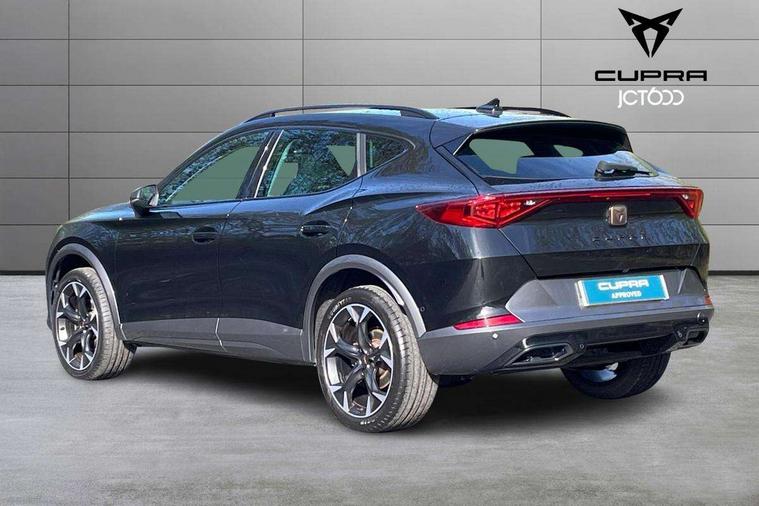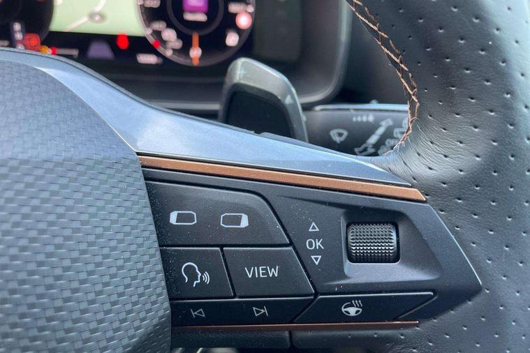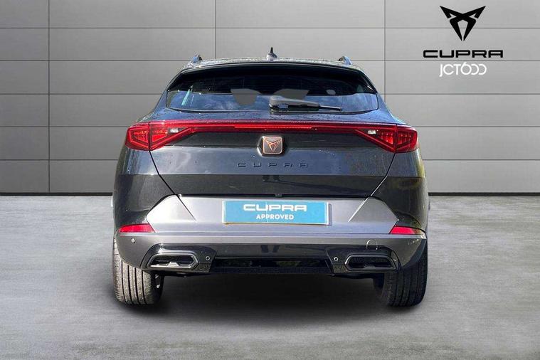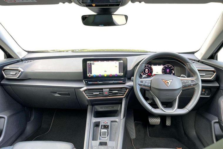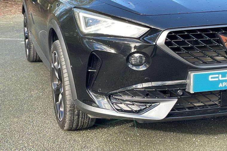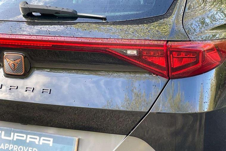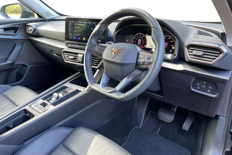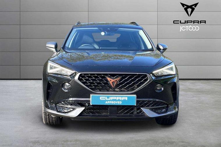 Digital cockpit and configurable dashboard, Driver alert system, Driving profile selection, E-call, Forward collision warning with automatic braking, Lane assist, Park assist (inc front/rear parking sensors), PAS, Predictive adaptive cruise control with speed limiter, Rear view camera, RPM, trip computer, outside temp gauge, instrument light brightness, low fuel warning light, lights on reminder, gearshift indicator, Service interval indicator, Start/stop system with regenerative braking, Wireless apple carplay, Wireless phone charger, Electronic locking differential and dynamic traction support, Standard suspension, 2 front and 2 rear USB type C sockets, Auxiliary input socket, DAB radio, Auto dimming rear view mirror, Body colour door handles, Body coloured bumpers, Dark grey wing mirror, Daytime running light with automatic headlight control and coming home feature, Dynamic headlight range control, Electric front/rear windows, Electrically adjustable heated and folding door mirrors with memory function, Front fog lamps with cornering function, Gloss black roof rails and window surrounds, LED Headlights, LED Taillights with dynamic indicator, Rain sensing wipers, Rear diffuser with black simulated exhaust pipes, Rear side wing doors, Rear wash/wipe, Third brake light, Tinted rear windows, Welcome lights, 12v power supply in centre console, 12V socket, 12v socket in loadspace, 2 front and 2 rear reading lights, 230V socket, 3 seat bench in 2nd row, 60/40 split rear bench seat with armrest and mechanical seat release, Dust/pollen filter, Front and rear head restraints, Front centre armrest, Height/reach adjust steering wheel, Illuminated interior front door sills, Illuminated sunvisor with mirror, Isofix, Leather multi function heated steering wheel with gear shift paddles, Luggage tie-down hooks, Single front passenger seat, Three zone climate control with control panel in rear, Variable luggage/load compartment floor, Wraparound lighting, Genuine Nappa leather Pack - Cupra, Navigation system pack with 10" navigation system - Formentor, 3 point seatbelts on all rear seats, ABS, Brake control system - ESC and brake booster, Child proof door locks, Driver and front passenger airbags with front passenger airbag de-activation, Electronic parking brake, Front and rear disc brakes, Front side curtain airbags, Hill hold control, Seat belt reminder for front and rear seats, Tyre pressure monitoring system, Anti theft alarm system, Keyless entry and start system (KESSY), Locking wheel bolts, Copper and aluminium interior detailing, 19" 'Exclusive' machined sport matte black and silver alloy wheels,