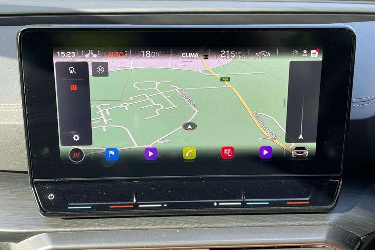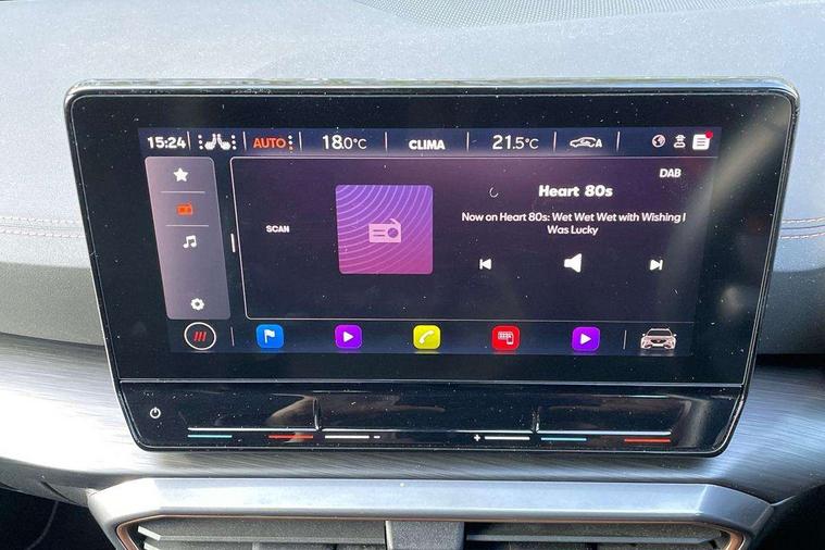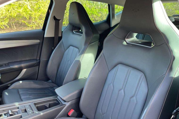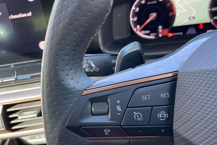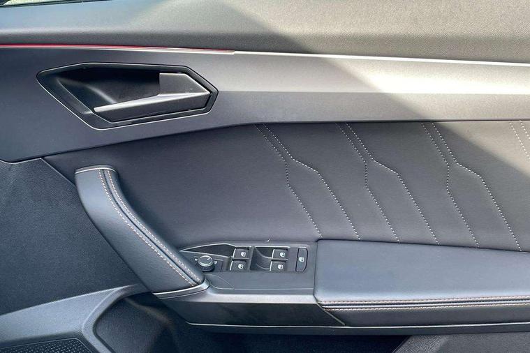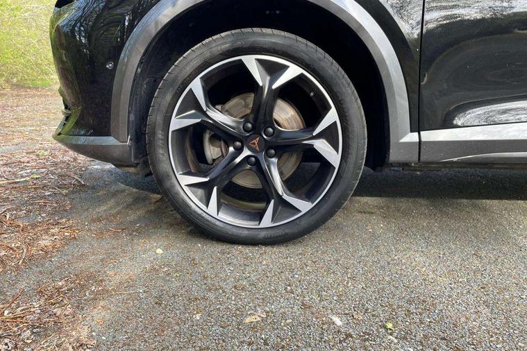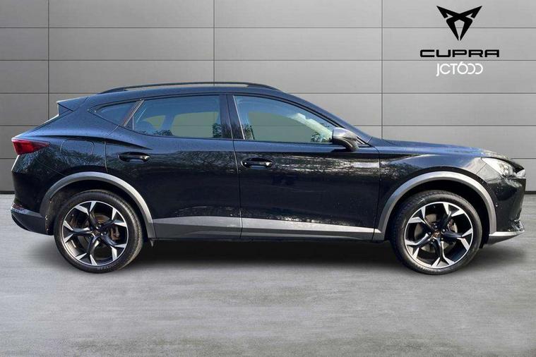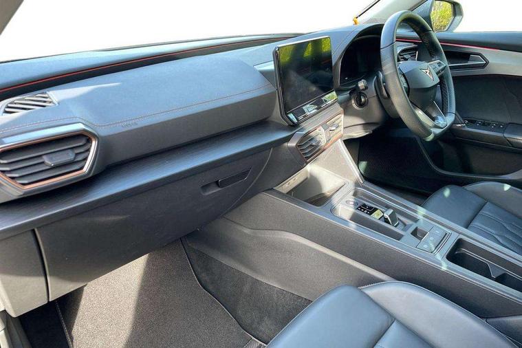 Digital cockpit and configurable dashboard, Driver alert system, Driving profile selection, E-call, Forward collision warning with automatic braking, Lane assist, Park assist (inc front/rear parking sensors), PAS, Predictive adaptive cruise control with speed limiter, Rear view camera, RPM, trip computer, outside temp gauge, instrument light brightness, low fuel warning light, lights on reminder, gearshift indicator, Service interval indicator, Start/stop system with regenerative braking, Wireless apple carplay, Wireless phone charger, Electronic locking differential and dynamic traction support, Standard suspension, 2 front and 2 rear USB type C sockets, Auxiliary input socket, DAB radio, Auto dimming rear view mirror, Body colour door handles, Body coloured bumpers, Dark grey wing mirror, Daytime running light with automatic headlight control and coming home feature, Dynamic headlight range control, Electric front/rear windows, Electrically adjustable heated and folding door mirrors with memory function, Front fog lamps with cornering function, Gloss black roof rails and window surrounds, LED Headlights, LED Taillights with dynamic indicator, Rain sensing wipers, Rear diffuser with black simulated exhaust pipes, Rear side wing doors, Rear wash/wipe, Third brake light, Tinted rear windows, Welcome lights, 12v power supply in centre console, 12V socket, 12v socket in loadspace, 2 front and 2 rear reading lights, 230V socket, 3 seat bench in 2nd row, 60/40 split rear bench seat with armrest and mechanical seat release, Dust/pollen filter, Front and rear head restraints, Front centre armrest, Height/reach adjust steering wheel, Illuminated interior front door sills, Illuminated sunvisor with mirror, Isofix, Leather multi function heated steering wheel with gear shift paddles, Luggage tie-down hooks, Single front passenger seat, Three zone climate control with control panel in rear, Variable luggage/load compartment floor, Wraparound lighting, Genuine Nappa leather Pack - Cupra, Navigation system pack with 10" navigation system - Formentor, 3 point seatbelts on all rear seats, ABS, Brake control system - ESC and brake booster, Child proof door locks, Driver and front passenger airbags with front passenger airbag de-activation, Electronic parking brake, Front and rear disc brakes, Front side curtain airbags, Hill hold control, Seat belt reminder for front and rear seats, Tyre pressure monitoring system, Anti theft alarm system, Keyless entry and start system (KESSY), Locking wheel bolts, Copper and aluminium interior detailing, 19" 'Exclusive' machined sport matte black and silver alloy wheels,