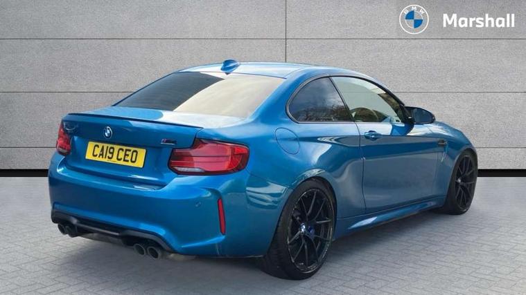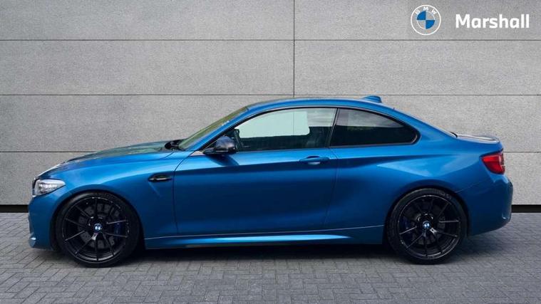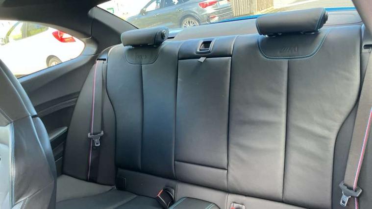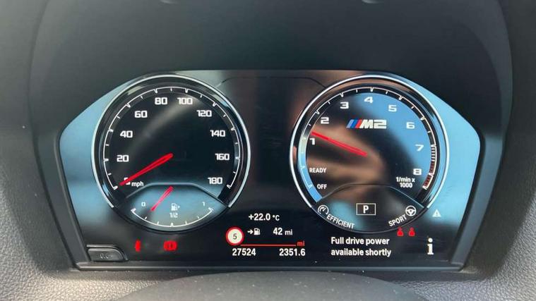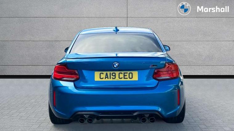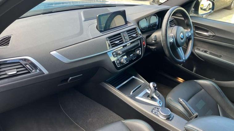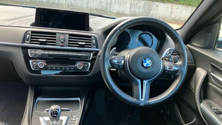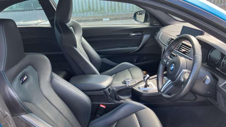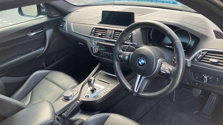 Auto start-stop, BMW Online services, BMW remote services, BMW Teleservices, Cruise control with braking function, Door/boot open warning, Front and rear Brake pad wear indicator, Front/rear Parking distance control, Instrument cluster with speedometer with miles per hour read out, tachometer and fuel gauge, Lights on warning by audio warning signal when ignition is switched off, M Servotronic power steering, Oil sensor for level and grade, warning by check control system, Oil temperature display via on board computer in instrument cluster, On board computer - average speed+fuel consumption, service interval, clock/date, odometer/trip meter, outside temperature display and ice warning, Optimum shift indicator, Personal Profile - automatic lock when driving away selectable, Real time traffic information, Speed limiter, Battery age recognition function, Drive performance control with ECO PRO comfort + sport mode, Engine cover with BMW roundel twin power turbo designation, M sport suspension, Oil dipstick, DAB Digital radio, 2 speed adjustable intermittent wipers with wash/wipe function, Automatic headlight beam throw control, Automatically dimming rear view mirror, Black chrome exhaust, Body colour bumpers, Body colour door handles, Body colour mirror caps, Body colour roof mouldings, Clear lenses direction indicator lights, Darkened rear lights with LED light bars, Daytime driving lights, Direction indicator side lights integrated exterior mirrors, Dual dark chrome exhaust tailpipes, Dynamic brake lights, Electric windows - front and rear, with open/close fingertip control, anti-trap facility and comfort closing, Electrically adjustable and heated M specific exterior mirrors, Follow me home headlights, Front apron with large air inlets, Green tinted heat protection glazing, Headlight range control, Heated windscreen washer jets, High gloss black kidney grille with M double rod vertical slats and M2 badging, High gloss black M side strakes with M2 designation, High gloss shadow line, High level third brake light, LED rear lights, LED welcome home lights, M rear spoiler, M2 specific aerodynamic body styling with unique kidney grille, front bumper, rear bumper and side skirts, Rain sensor with automatic headlight activation, Rear bumper with high gloss black finish, Rear fog lights, Reversing light in rear light cluster, Shark fin roof aerial, Visible VIN plate, Welcome lighting, 12V power socket in centre console, 12V power socket in passenger footwell, 4 grab handles, Anthracite headlining, Anthracite Velour floor mats, Automatic two zone climate control air conditioning, Conditioned based service, Dakota leather upholstery, Driver and front passenger lumbar support, Driver and front passenger seat heating, Folding rear seat head rests, Folding storage compartment with glasses holder + coin tray, Front and rear side armrests integrated into door trim, Front door sill finishers with M designation, Front door storage bins, Front head restraints, Front sliding armrest, Glove box handle with chrome surround, Isofix child seat for two outer rear seats, Leather gearknob, Leather handbrake lever, Luggage compartment access via BMW roundel, M multifunction nappa leather steering wheel, M Sports seats, Manually adjustment steering wheel column, Rear coat hooks, Rear folding head restraints, Storage compartment in rear centre console, Two cupholders with sliding cover and inlay mat, Two extra lashing eyes in luggage compartment, Interior comfort pack - 2 Series/M2, Media pack - Professional - 2 Series/M2, Active differential brake (ADB), electronic differential lock in DSC-OFF mode, Airbag - Front driver and passenger, front and rear head, front side, curtain head protection, manual deactivation of front passenger airbag possible, Anti lock braking system (ABS) with brake assist, Automatic Stability Control (ASC), Battery safety cut-off, BMW emergency call, Brake drying, Brake energy regeneration, Braking readiness, Cornering brake control (CBC), Crash sensor activating central locking release with hazard warning lights and interior lighting + battery safety cut-off, Dynamic brake control, Dynamic stability control + (DSC+), Dynamic Traction Control - DTC, Front pyrotechnic belt tensioners and belt force limiter, rear coaded belt buckles, Hill start assist, M dynamic mode, M Sport seatbelts, Seat belt security check for driver and front passenger, Side impact protection, Twin horns, Tyre pressure monitoring with 3 level warning strategy, Warning triangle and first aid kit, Central locking switch for all doors, fuel filler cap and luggage compartment, Check control system for monitoring of lights and door/luggage compartment open warning, Drive away door locking, Locking wheel bolts, Remote control including integrated key with blue insert, Thatcham category 1 alarm system with remote control and engine immobiliser, Carbon fibre interior trim with black high gloss finish, BMW mobility system, Reduced rolling resistance tyres,