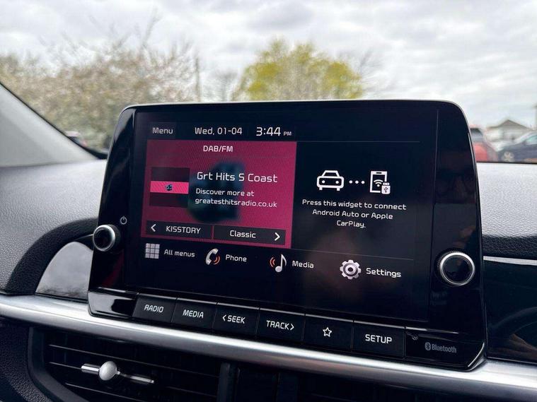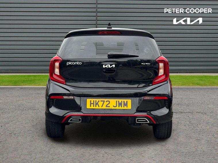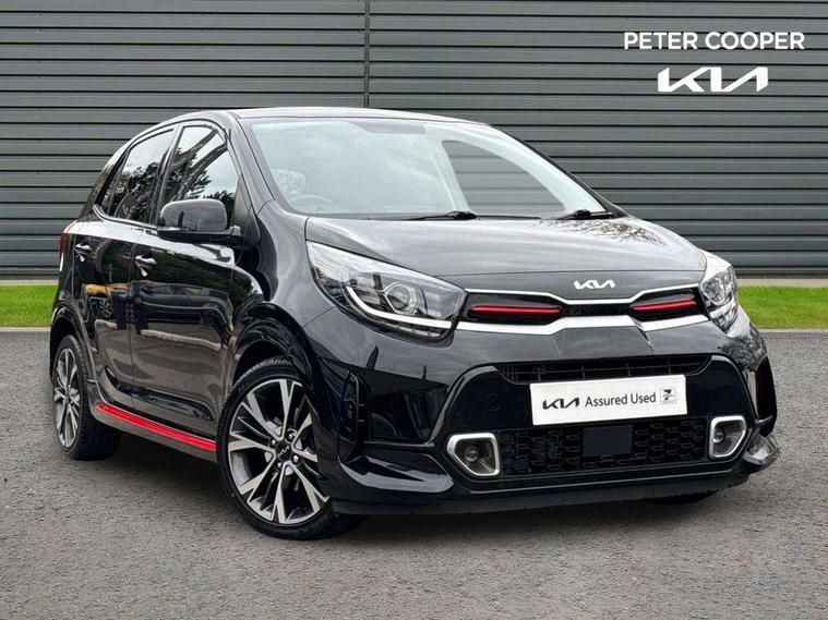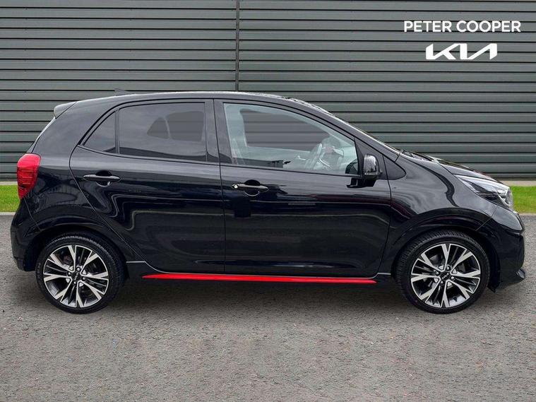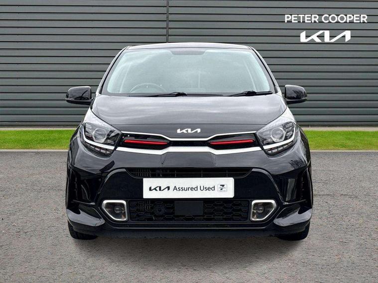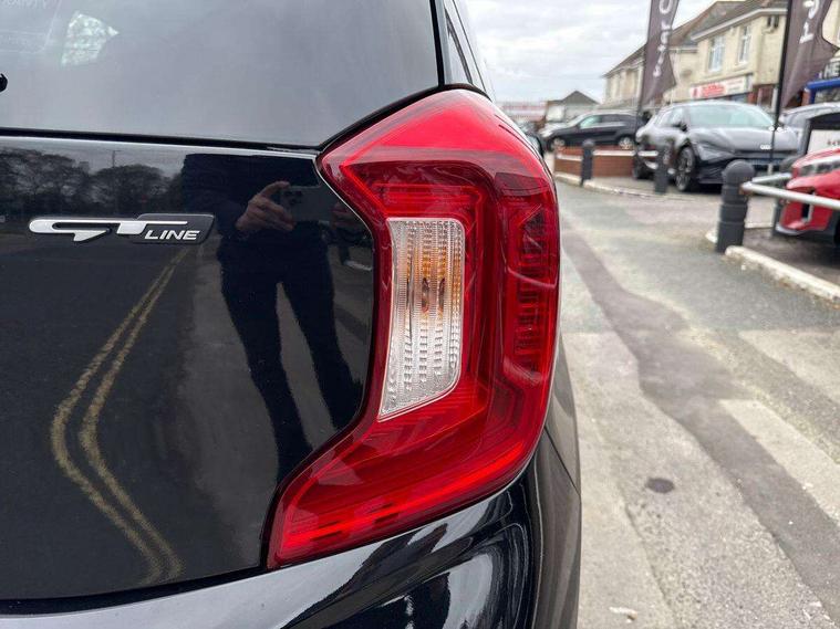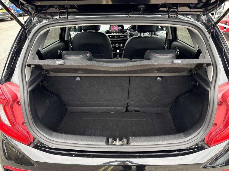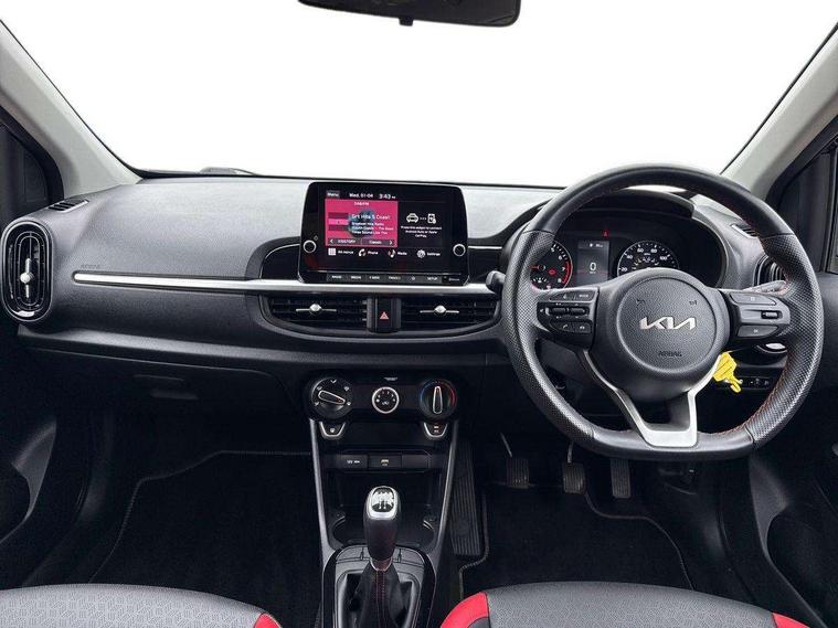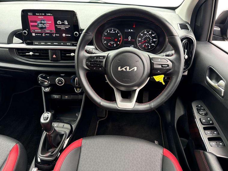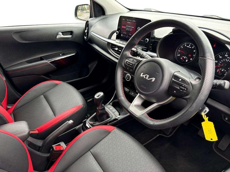 8" touchscreen display with RDS and DAB, Apple car play/Android Auto with voice control, Emergency call service, Emergency stop signalling system, External temperature gauge, Motor driven power steering, Reversing camera system with dynamic guidelines (Integrated into centre fascia screen), Tachometer, Trip computer, 6 speaker audio system, Bluetooth with music streaming, Steering wheel mounted controls, USB ports for connection of a media device, Automatic headlight control system, Bi-function projection headlights, Black beltline mouldings, Black grille with silver surround, Body colour B pillars, Body colour bumpers, Body colour mirrors and door handles, Body colour side sill mouldings, Day/night rear view mirror, Electric adjustable/heated/folding door mirrors with LED indicators lights, Front and rear electric windows with drivers's auto up/down function, Front fog lights, Headlamp levelling, Heated rear window, High mount brake light, LED daytime running lights, LED rear fog lights, Privacy glass - Rear windows and tailgate, Rain sensor, Rear side wing doors, Rear wash/wipe, Speed variable front wipers, Sports front and rear bumpers with gloss black skid plates twin exhaust, Tinted glass, Visible VIN plate, Welcome and follow-me home light functionality, 1 x rear coat hook, 12V power point front, 2 seat bench in 2nd row, 3 x passenger assist grips, 60/40 split/folding 2nd row of seats, All round height adjustable headrests, Black and red accents front door armrest, Centre Console with Storage Box and Sliding Armrest, Cupholders in centre console, D-cut steering wheel with red stitching, Driver and front passenger sunvisor with vanity mirror, Driver seat height adjust, Faux leather upholstery, Front cabin lights, Glovebox, High gloss lower centre fascia trim, door armrest and air vents, ISOFIX Child seat top tethers and anchor fixings, Leather trimmed steering wheel and gearshift, Luggage area light, Luggage area parcel shelf, Manual air conditioning, Passenger front seatback pockets, Satin chrome interior door handles, Single front passenger seat, Slide/reclining front seats, Tilt adjustable steering wheel, Advanced Driver Assistance Pack - Picanto, 2 x 3-point rear seatbelts, ABS/EBD, Automatic unlocking of doors in case of impact, Dual front airbags, ESC + BAS + VSM + HAC, Front passenger airbag cut-off switch, Front seatbelt height adjusters, Front seatbelt pretensioners + load limiters, Hill hold control, Knee airbags, Rear child proof door locks, Seatbelt warning, Side impact protection, Torque vectoring brake based and straight line stability (SLS), Traction control, Twin curtain airbags, Twin front side airbags, Tyre pressure monitoring system, Anti theft alarm, Engine immobiliser, Folding key, Locking wheel nuts, Remote central door locking, 16" alloy GT-Line wheels, Tyre mobility kit,