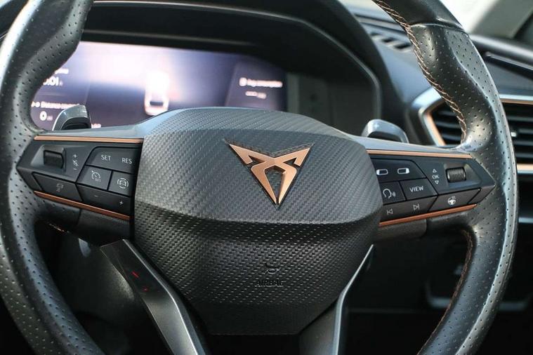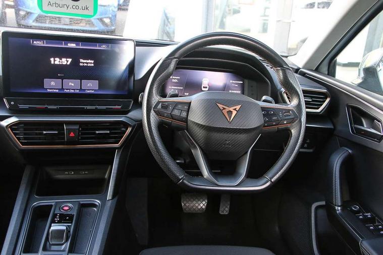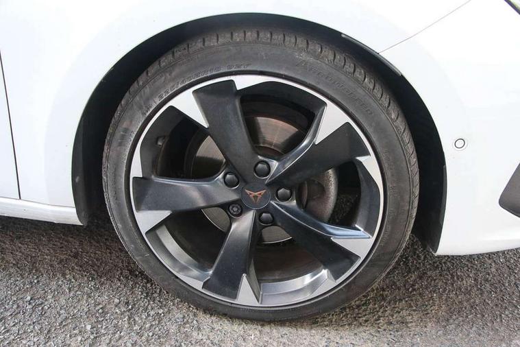 CUPRA drive profile selection with 4 modes (Comfort/Cupra/Sport/Individual), throttle response and gearshift mode, Digital cockpit, E-call, Electro mechanical speed sensitive power steering, Four x USB Type C ports, Front assist with forward collision warning braking reaction to vehicles, pedestrians and cyclists, Full link smartphone integration with Mirror Link, wireless Apple CarPlay and wired Google Android Auto, Lane assist, Lockable tailgate, Park assist (inc front/rear parking sensors), Rear view camera, RPM, trip computer, outside temp gauge, instrument light brightness, low fuel warning light, lights on reminder, gearshift indicator, Service interval indicator, Start/stop system with regenerative braking, Wireless phone charger, Sports suspension, 7 speakers, Auxiliary input socket, Auto dimming rear view mirror, Body colour door handles, Body coloured bumpers, Cupra sports bumpers, Dark tinted rear windows, Electric front/rear windows, Electrically adjustable, heated and folding door mirrors, LED front fog lamps with cornering function, LED headlights with dynamic turn signals, tail lights, rear fog lights with rear coast to coast lighting, Rain sensing wipers, Rear diffuser with twin exhaust pipe on each side, Rear side wing doors, Rear wash/wipe, Separate daytime running light with automatic headlight control and coming home feature, Third brake light, 12v power supply in centre console, 12v socket in loadspace, 3 seat bench in 2nd row, 5 headrests, 60/40 split rear bench seat with armrest, Ambient lighting with glovebox, footwell and single monocolour, CUPRA Leather flat bottomed, heated, perforated steering and gearshift paddles, Driver/passenger manual seat height adjustment, Front and rear reading lights X 4, Front centre armrest, Front seats manual lumbar adjustment, Grey headlining, Height/reach adjust steering wheel, Illuminated interior front door sills, ISOFIX points in outer rear seats with top tether anchorage points, Jack and tool kit, PVC/Cloth upholstery with copper stitching, Single front passenger seat, Sliding boot cover, Sports seats, Storage pockets on rear of front seats, Sunvisors with illuminated mirror, Three zone climate control, Media system plus with navigation pack - Leon Cupra, Safety and driving pack (M) - Cupra leon, 3 point seatbelts on all rear seats, ABS, Brake control system - ESC and brake booster, Child proof door locks, Cupra black brake calipers, Driver and front passenger airbags with front passenger airbag de-activation, front side and curtain airbags, Electronic parking brake, Extended safety system - seat belt tensioner, window closure and hazard lights, Hill hold control, Rear disc brakes, Seat belt reminder for front and rear seats, Tiredness recognition system, Tyre pressure monitoring system, Anti theft alarm system with interior monitoring in cab, backup horn and towing protection, KESSY Advanced - Keyless start, keyless entry, Locking wheel bolts, Chrome and copper interior detailing, 18" Machined sport black and silver alloy wheels with 92Y tyres,
