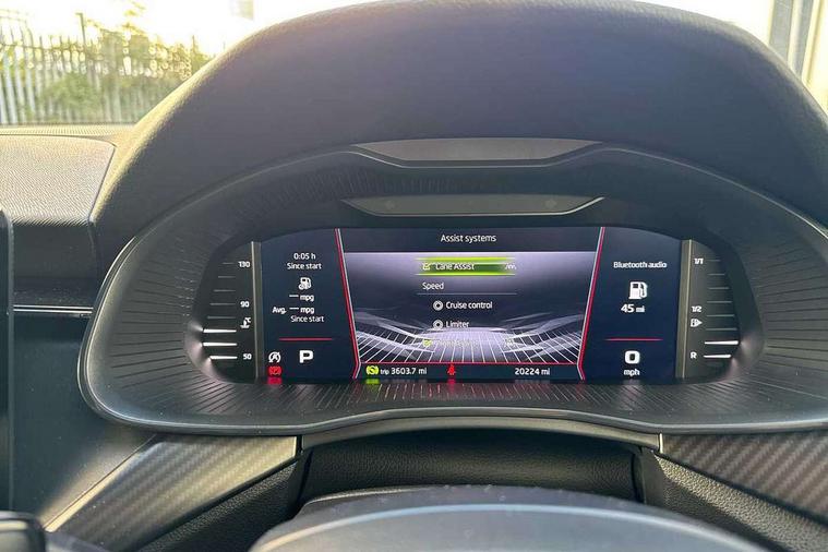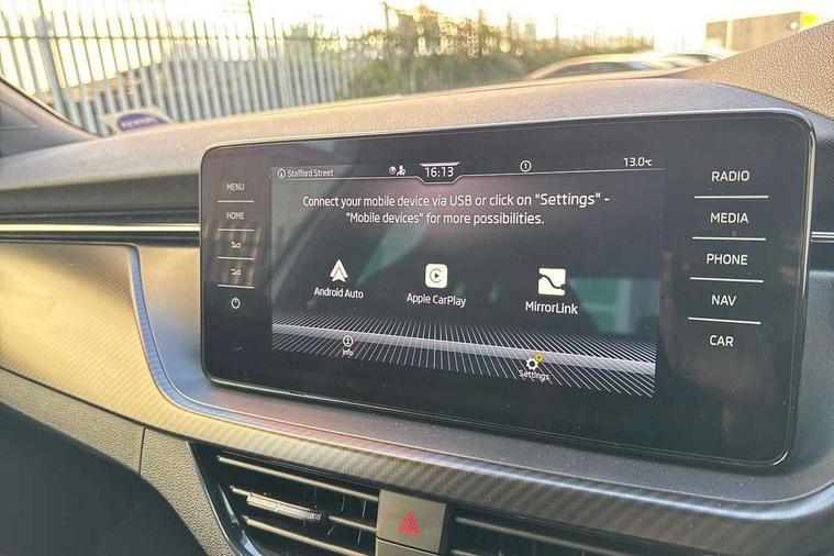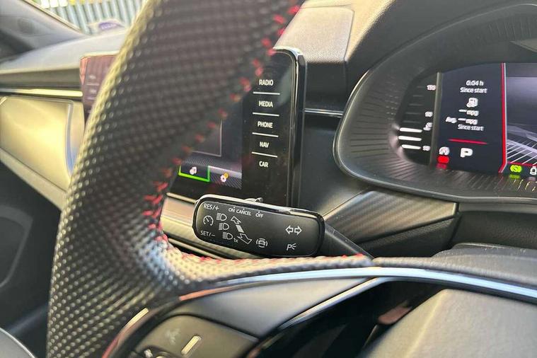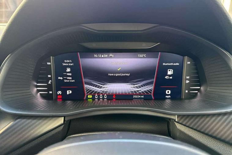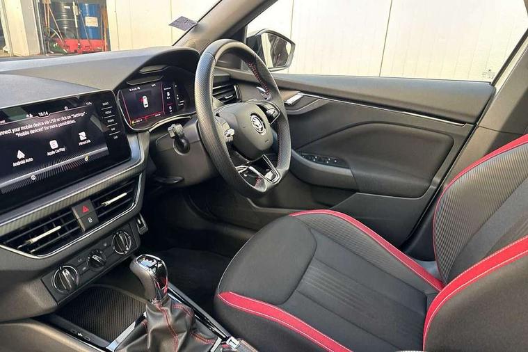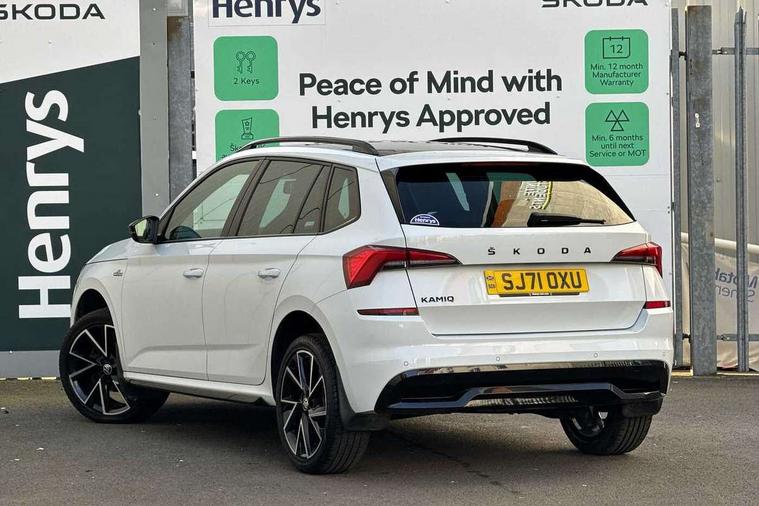 Amundsen satellite navigation with 9.2" touchscreen display, voice control, virtual cockpit and web radio, Bluetooth system, E-call, Front assist system, Gesture control, PAS, Service indicator, Speed limiter, Virtual cockpit with 10.25" display, Wireless SmartLink for apple car play, android auto and mirrorlink, 8 Speakers, Auxiliary input socket, DAB Digital radio, Black door mirrors, Black radiator grille, Black rear diffuser, Body colour bumpers, Body colour door handles, Body colour roof spoiler, Boot lettering in black, Chrome grille surround, Dimming rear view mirror with black surround, Electrically adjustable and heated door mirrors, Fixed panoramic sunroof with black roof rails, Front and rear electric windows, Front sport bumper, Full LED headlights with adaptive front light system, dynamic indicators, cornering function and fog lights, Headlight range control, Heated rear window, High functionality rear led lights with dynamic indicators, KAMIQ Door sills, Light sensors, Monte carlo plaque, Privacy glass, Rear fog lights, Rear side wing doors, Rear wiper, 12V Accessory socket in centre console, 3 seat bench in 2nd row, Aluminium pedals, Black ceiling for black/beige interior, Chrome inner door handles, Cloth upholstery, Front head restraints, Glove compartment with illumination, Ice scraper, Isofix child seat fittings on outer rear seats, ISOFIX on front passenger seat, Leather gear lever, Manual lumbar support for front seats, Rake/reach adjustable steering wheel, Reading lights, Single front passenger seat, Sports seats, Sun visors with illumination on front passenger, Textile floor mats, Third rear headrest, Top tether for front passenger seat, Umbrella in driver's door, 3x3 point rear seatbelts, Airbags - driver and front passenger, ESP, Front passenger airbag deactivation switch, Front side airbags with curtain airbags, Hill hold control, Manual parking brake, Manual rear child locks, One tone horn, Rear disc brakes, Seatbelt reminder for driver an co-driver, Traction control, Tyre pressure monitor, Anti-theft alarm system with interior monitoring, backup horn, towing protection and remote central locking with SAFE system, Anti-theft wheel bolts, Electronic engine immobilizer, Chrome air vent surrounds, 18" Vega alloy wheels in black,