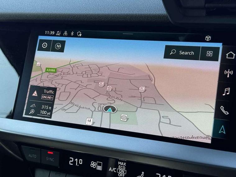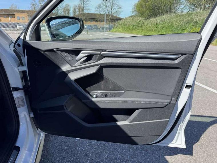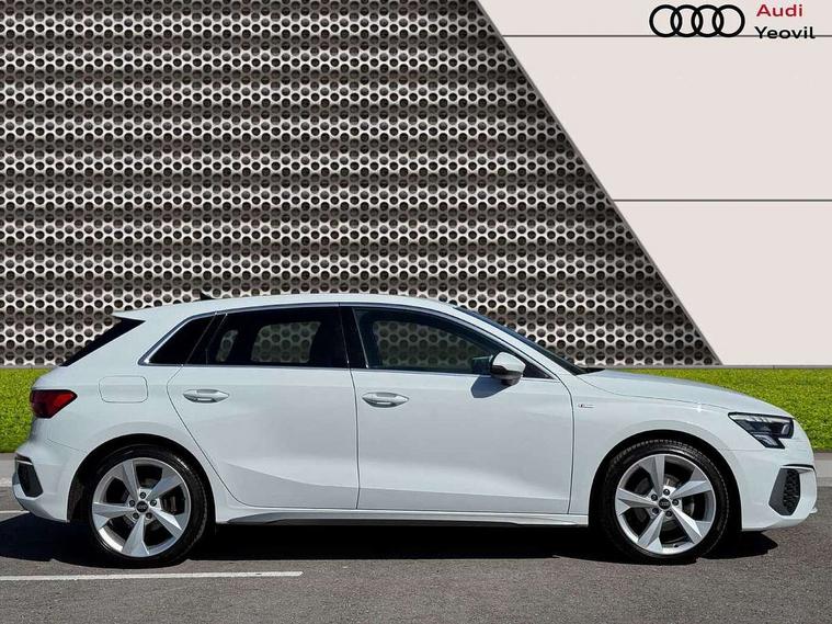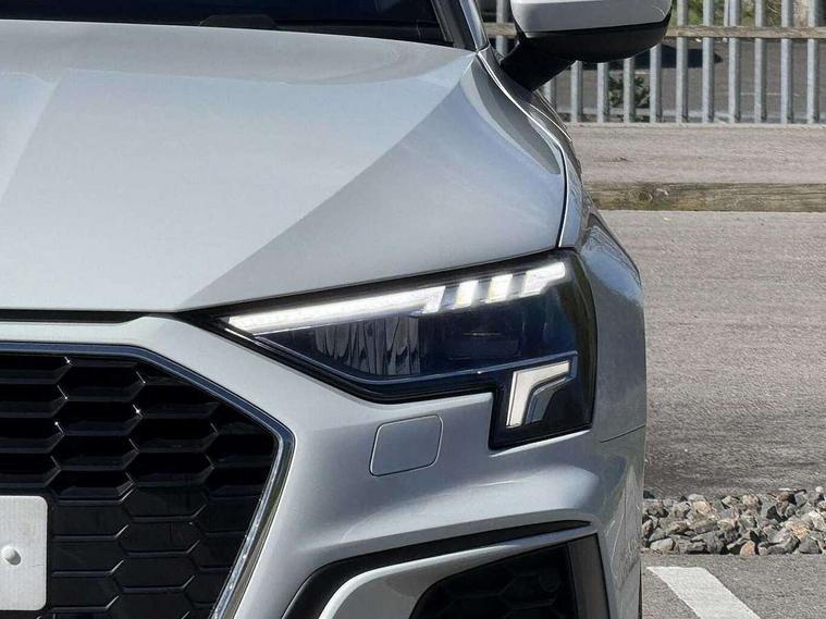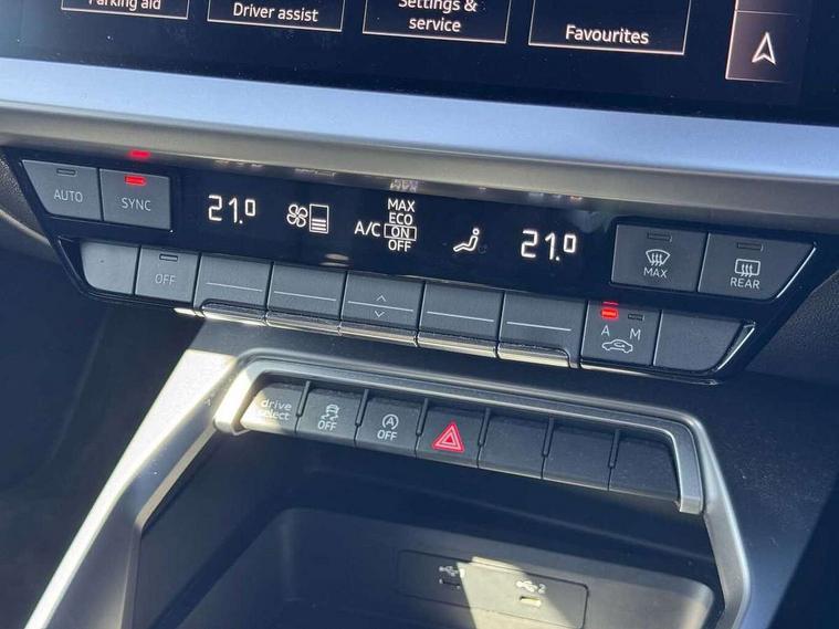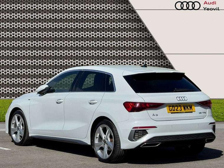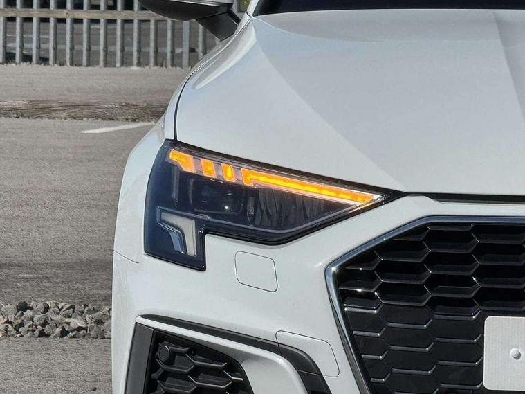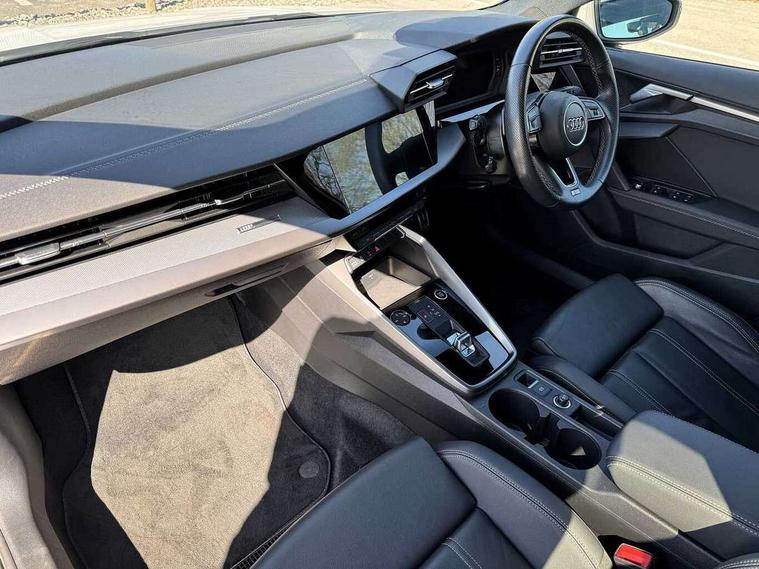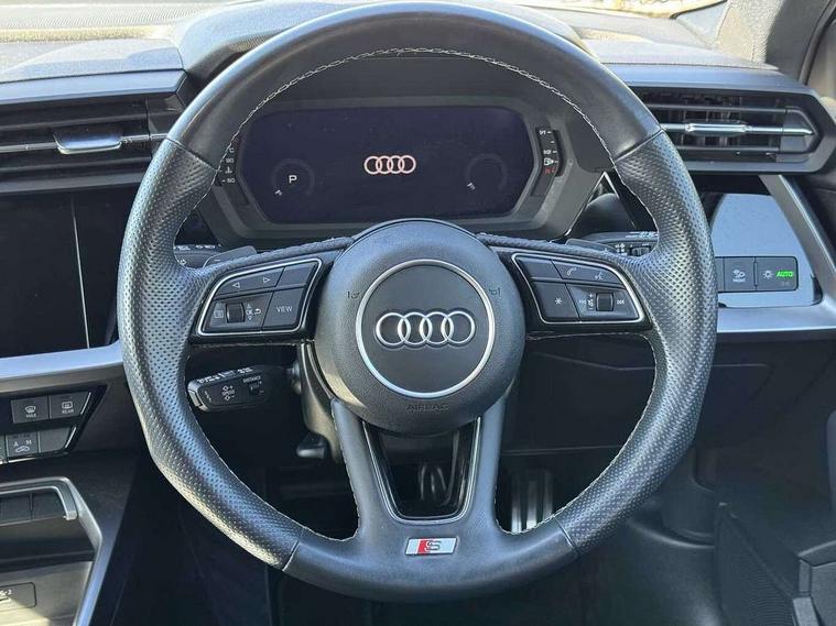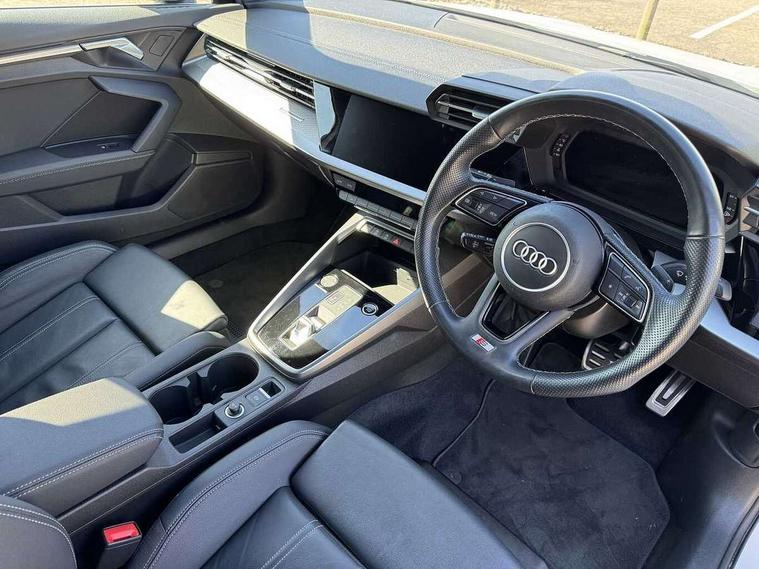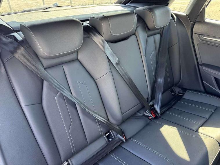 Audi drive select (Auto, Comfort, Dynamic, Efficiency and Individual), Audi smartphone interface, Audi Virtual Cockpit - 10.25" digital and colour instrument cluster, Automatic start/stop system with recuperation, Bluetooth interface, Camera based traffic sign recognition, Collision avoidance assistant, e-Call (emergency call), Electromechanical power speed sensitive steering, Lane departure warning system, MMI Navigation Plus with high resolution 10.1" colour touch screen display, Service indicator, Trip computer, Voice control system with natural language interaction, Sports suspension, 2xUSB-C connection with data and charging functions, 6 passive loudspeakers, DAB Digital radio, 3rd brake light, Acoustic glass windscreen, Aluminium window trim, Auto dimming frameless rear view mirror, Body colour exterior mirrors, Electrically adjustable/heated/folding/dimming door mirrors with kerb view includes integrated LED indications + kerb view function for passenger side, Front electric windows, Illuminated aluminium inserts front door sills with S logo, LED daytime running lights, LED headlights with LED rear lights and dynamic rear indicators, Light and rain sensors, Privacy glass - dark tinted rear window, rear door and side windows, Rear electric windows, Rear side air outlets in grained matt black, Rear side wing doors, Rear wiper, S line bumpers, S roof spoiler, 12V socket and storage compartment in front centre console, 3 seat bench in 2nd row, 3 spoke leather multifunction steering wheel with paddle shift, 4 way electrically adjustable lumbar support for driver and front passenger, 60/40 split folding rear seat bench, Black cloth headlining, Dual zone electronic climate control, Front and rear centre armrest in leather, Front and rear headrests, Front/rear floor mats, Height and reach adjustable steering wheel, Interior lighting - glove compartment light and right hand side, Luggage compartment floor covering, Manual boot compartment lid, Manually adjustable front seats, Seat side bolsters, Single front passenger seat, Stainless steel pedals and front footrest in black, Twin leather upholstery with front sports seats S embossed logo, Aluminium interior elements pack - A3 Sportback, LED interior lighting pack - A3 Sportback, S line styling pack - A3 Sportback, 3x3 point rear seat belts, Driver and front passenger airbag with passenger airbag deactivation, Electronic Stabilisation Control (ESC) including ABS, ASR and EDL, First aid kit with warning triangle and 2 safety vests, Front side airbags with head airbags and interaction airbag, Pre-sense front with pedestrian and cyclist detection, Seatbelt monitoring, Tyre pressure loss indicator, Anti theft alarm, Anti-theft wheel bolts, Electronically operated child lock, Immobiliser, Remote control central locking, Dark spectrum aluminium inlays, accent surfaces in the dashboard and centre console in platinum grey silk effect paint finish,