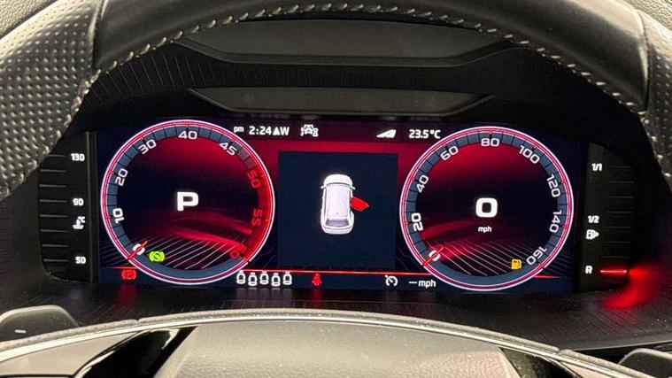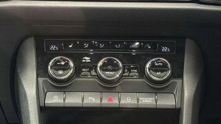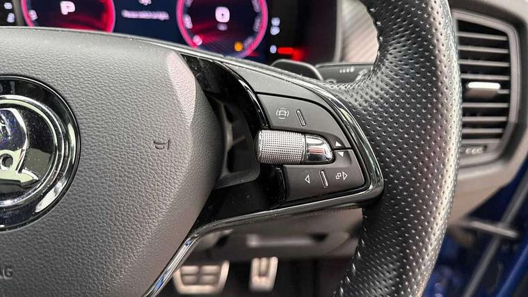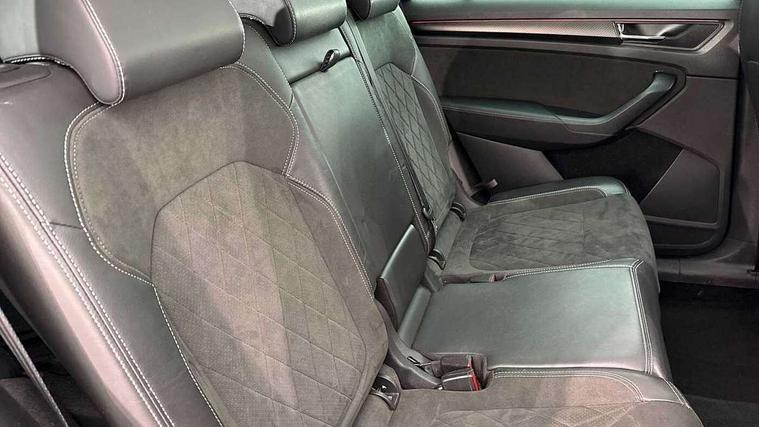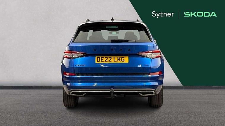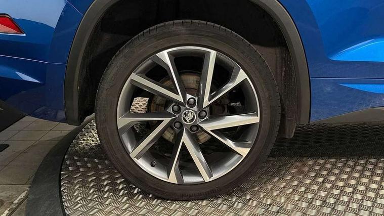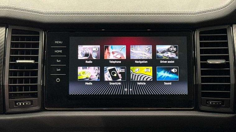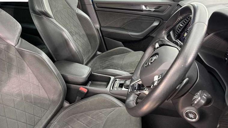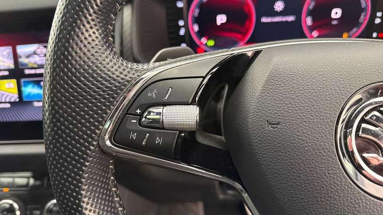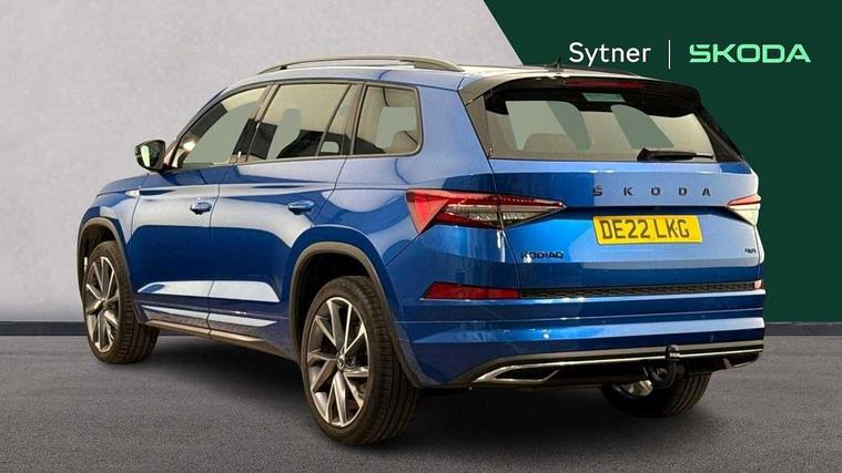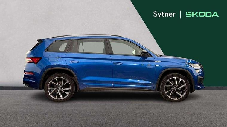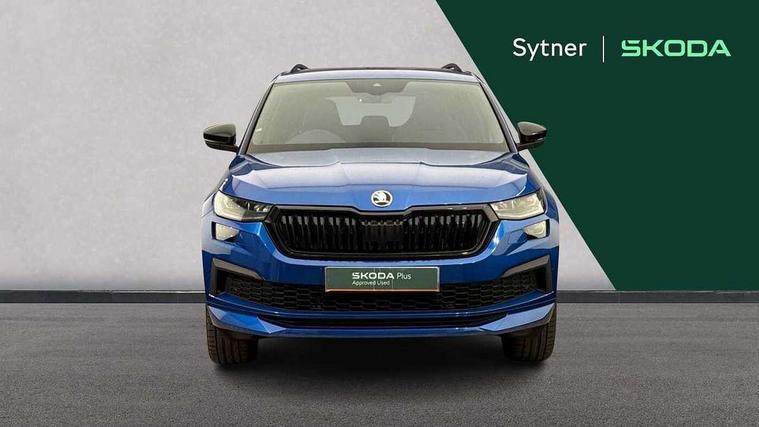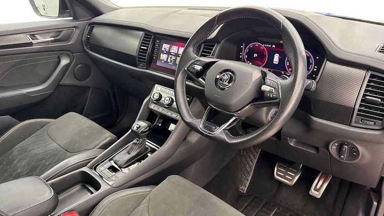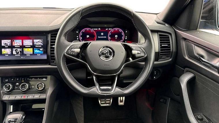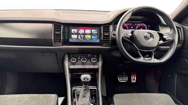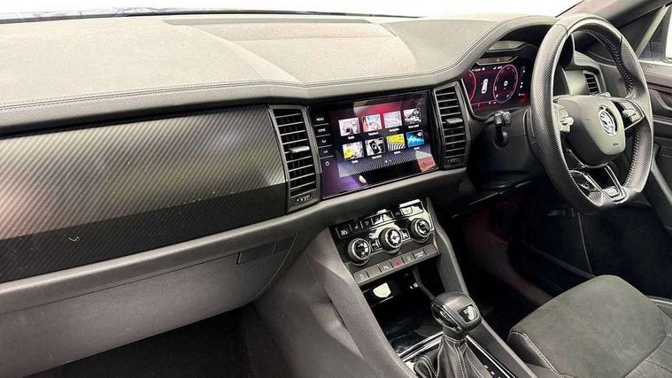 Bluetooth system, Columbus satellite navigation with 9.2" touchscreen, integrated Wi-Fi, web radio, Digital voice enhancement, E-call, ECO Stop/start function, Exterior temperature indicator, Progressive steering, Rear view camera, Smartlink wireless for apple carplay and wired for android auto, Speed limiter, USB C Port x 2 in front centre console, Wireless charging, 8 speakers, DAB Digital radio, Aero front windscreen wipers with intermittent function, Aero rear window wiper, Auto dimming rear view mirror, Black roof rails, Black sports styling including front grille and window surrounds, Black wheel arch surrounds, Body colour bumpers, Body colour door handles, Electric adjustable/heated/folding door mirrors, driver side auto dimming with boarding sports and memory function, Electric front and rear windows, Extended rear spoiler with finlets in gloss black, Front fog lights, Full LED matrix headlights with AFS (adaptive front light system), cornering function and AWL (all weather lighting system), Gloss black door mirrors, Headlight washers, Heated rear window, Invisible tailpipe, LED daytime running lights, LED rear fog light, LED third brake light in rear spoiler, Light assistant (coming/leaving home/tunnel light), Off-road style lower front bumper element, Privacy glass, Rain and light sensors, Rear diffuser, Rear LED lights (high functionality) with welcome effect and dynamic indicators, Rear side wing doors, Safety reflectors on front and rear doors, Sportline badge on front fender, Sports front and rear bumpers including lower rear chrome strip, Tailgate lettering in Black, Window control switches with black trim, Without engine designation, 12V socket in boot, 2 rails with 2 hooks, 2 seat bench in 3rd row, 3 seat bench in 2nd row, 4 foldable roof handles with rear coat hooks, 60:40 foldable rear seat with sliding adjustment and backrest angle adjustment, Aluminium pedals, Black roof headlining, Bottle holders in door panel in the 1.5 litre front and 1 litre rear, Cargo storage compartments, Chrome headlight control button, Chrome interior door handles, Coat hooks on B pillar, Covered storage compartment on driver side, Front centre armrest with storage compartment, cup holder and 12V socket, Front courtesy lights, Gear shift lever with chrome frame and black gloss insert, Grey stitching in front and rear armrests and door armrests + door inserts, Height adjustable front headrests, Illuminated and cooled glovebox, Illuminated luggage compartment, Isofix child seat fittings in outer rear seats with top tether, Manually adjustable steering column, Microsuede door panels, Net programme in boot (1x horizontal Net, 2x vertical Nets), Overhead glasses storage compartment, Pollen filter, Rear centre armrest with cupholders, Single front passenger seat, Sliding trunk cover, Small Bags on the inner sides of the front backrests, Sports seats, Sunvisors with illuminated vanity mirrors, Three rear height adjustable headrests, Ticket holder on A Pillar, Umbrella in door panel, Variable boot floor, LED Interior light pack - Kodiaq, Auto door release and activation of warning lights, Child locks on rear doors, Driver and front passenger airbag with knee airbag and front passenger airbag deactivation, Electronic parking brake with hill start assist, Emergency rear braking signal, ESC (incl. ABS+MSR+ASR+EDS+HBA+DSR+RBS+MKB), Front assist with autonomous emergency braking, Front side airbags with curtain airbags, Fuel cut off safety device, Height adjustable front 3 point seatbelts + pretensioners, Hill hold control, Rear disc brakes, Safety vest holder in door, Seat belt reminder for all seats, Tailgate unlocking from outside, Three point rear seat belts, Two tone horn, Tyre pressure monitor, Alarm with interior monitoring and tilt sensor with safe function, Anti-theft wheel bolts, Immobiliser, Keyless entry and start system (KESSY), Remote central locking with 2 keys, Black air vent surround, Carbon finish dashboard and door inserts, Grey stitching in dashboard, 20" Vega Anthracite alloy wheels, Temporary spare wheel (space saver),