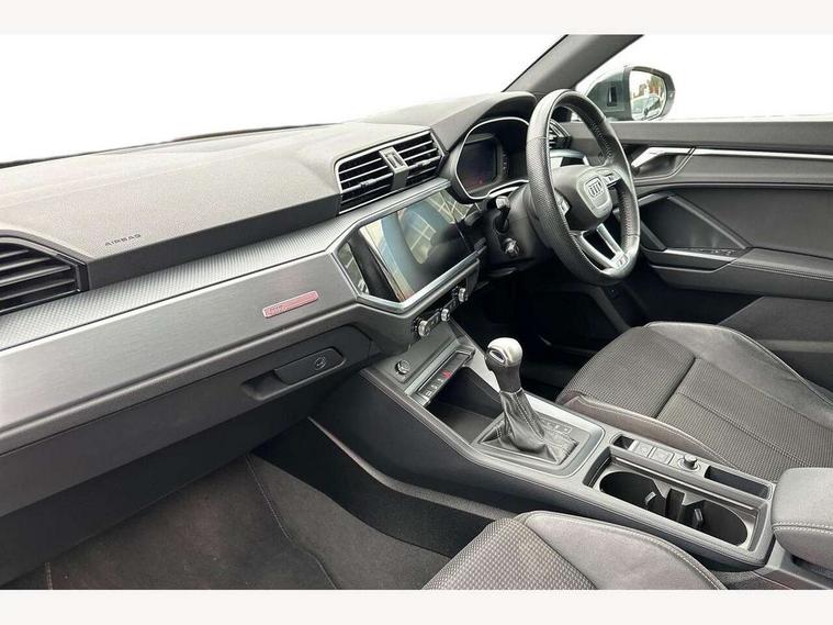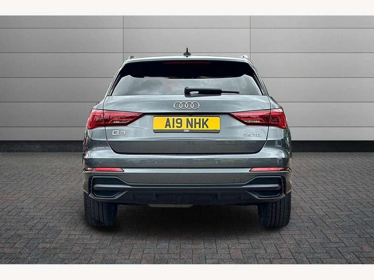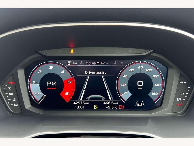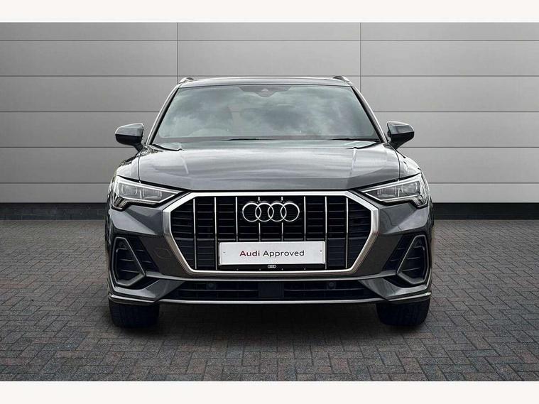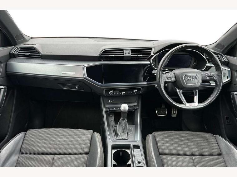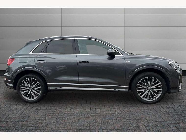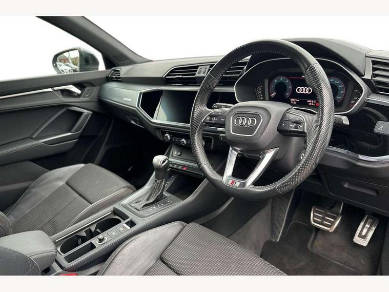 Audi connect safety and service (e-call), Audi drive select, Audi lane departure warning, Audi side assist, Audi smartphone interface, Audi Virtual Cockpit - 10.25" display, Bluetooth interface, MMI navigation plus with MMI touch, Power opening/closing tailgate, Progressive steering, Service interval indicator, Stop/start system, Voice control system, Diesel particulate filter, DAB digital radio module, Acoustic windscreen, Aluminium roof rails, Aluminium window trim, Auto dimming rear view mirror, Body colour door mirrors, Body coloured bumpers, Diffuser in matt Platinum grey, Electrically adjustable and heated door mirrors with integrated LED side indicators, Front and rear electric windows, Front fog lights, Front side air inlets in matt platinum grey, Front spoiler blade in matt platinum grey, Grille vertical bars in aluminium silver/Matt, High gloss black finish B and C pillars, Privacy glass, Rain and light sensors, Rear diffuser strip in selenite silver, S Line badge on wings, S Line front and rear bumpers, Side skirt insert in matt Platinium grey, Titanium black radiator grille, 12V socket in rear centre console, 40:20:40 split folding rear bench seat, Adjustable rear seat bench/backrest with centre armrest and cupholder, Aluminium door sill trims, Black cloth headlining, Dual zone climate control, Front and rear black floor mats with contrast stitching in rock grey, Front and rear headrests, Front centre armrest with storage compartment and angle adjustment, Illuminated door sill trims with S logo, ISOFIX child seat mounting and Top Tether with front passenger airbag deactivation, Perforated leather gearknob, Stainless steel luggage compartment sill finisher, Stainless steel pedals, Non smoking pack - Q3, 3x3 point rear seatbelts, 6 airbags - Driver, front passenger, curtain and side windows, Audi pre-sense front with pedestrain and cyclist recognition, Electronic stabilisation control including ABS, ASR and EDL, Hill hold assist, Pre sense basic, Seatbelt monitoring, Tyre pressure warning, Warning triangle and first aid kit, Anti theft alarm, Anti theft wheel bolts, Remote central locking, Dark matt brushed aluminium inlay, MMI touch colour display in gloss black with aluminium surround,