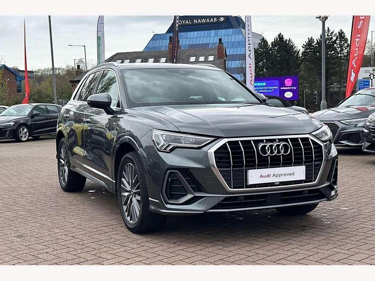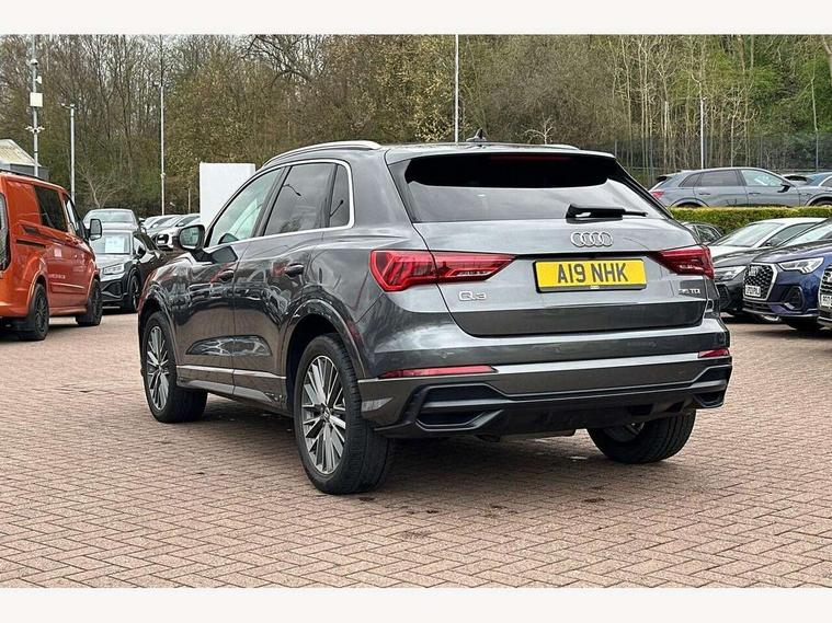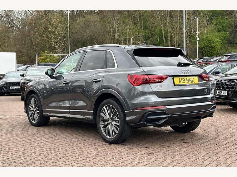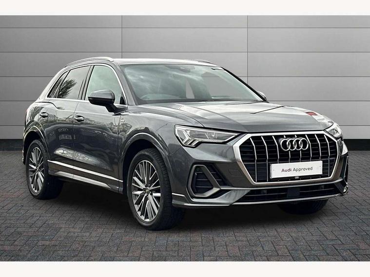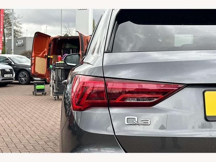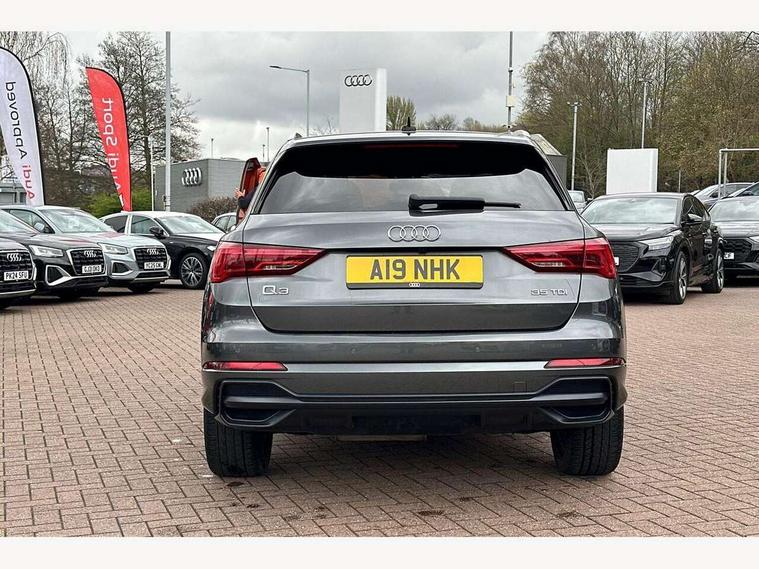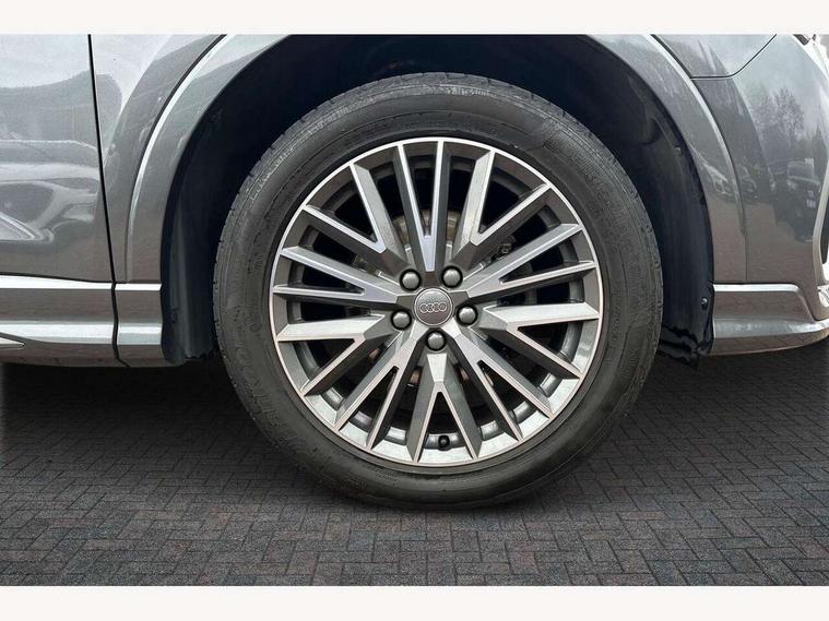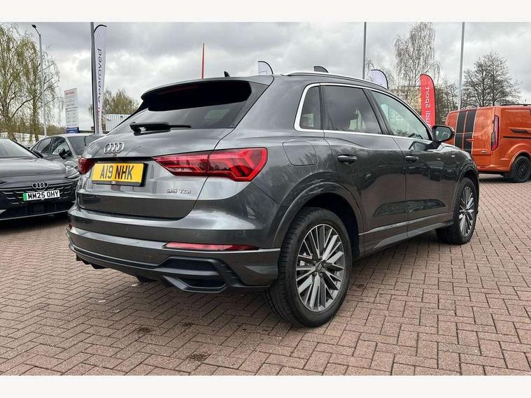 Audi connect safety and service (e-call), Audi drive select, Audi lane departure warning, Audi side assist, Audi smartphone interface, Audi Virtual Cockpit - 10.25" display, Bluetooth interface, MMI navigation plus with MMI touch, Power opening/closing tailgate, Progressive steering, Service interval indicator, Stop/start system, Voice control system, Diesel particulate filter, DAB digital radio module, Acoustic windscreen, Aluminium roof rails, Aluminium window trim, Auto dimming rear view mirror, Body colour door mirrors, Body coloured bumpers, Diffuser in matt Platinum grey, Electrically adjustable and heated door mirrors with integrated LED side indicators, Front and rear electric windows, Front fog lights, Front side air inlets in matt platinum grey, Front spoiler blade in matt platinum grey, Grille vertical bars in aluminium silver/Matt, High gloss black finish B and C pillars, Privacy glass, Rain and light sensors, Rear diffuser strip in selenite silver, S Line badge on wings, S Line front and rear bumpers, Side skirt insert in matt Platinium grey, Titanium black radiator grille, 12V socket in rear centre console, 40:20:40 split folding rear bench seat, Adjustable rear seat bench/backrest with centre armrest and cupholder, Aluminium door sill trims, Black cloth headlining, Dual zone climate control, Front and rear black floor mats with contrast stitching in rock grey, Front and rear headrests, Front centre armrest with storage compartment and angle adjustment, Illuminated door sill trims with S logo, ISOFIX child seat mounting and Top Tether with front passenger airbag deactivation, Perforated leather gearknob, Stainless steel luggage compartment sill finisher, Stainless steel pedals, Non smoking pack - Q3, 3x3 point rear seatbelts, 6 airbags - Driver, front passenger, curtain and side windows, Audi pre-sense front with pedestrain and cyclist recognition, Electronic stabilisation control including ABS, ASR and EDL, Hill hold assist, Pre sense basic, Seatbelt monitoring, Tyre pressure warning, Warning triangle and first aid kit, Anti theft alarm, Anti theft wheel bolts, Remote central locking, Dark matt brushed aluminium inlay, MMI touch colour display in gloss black with aluminium surround,