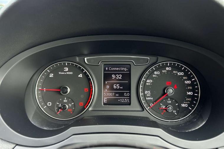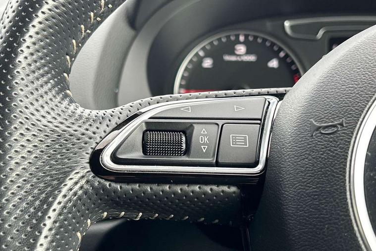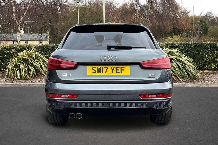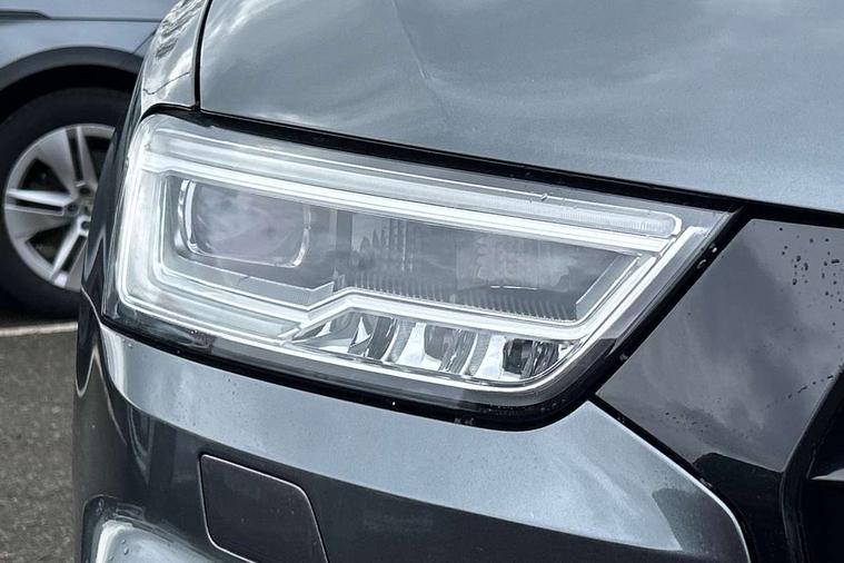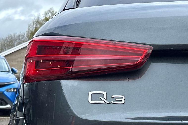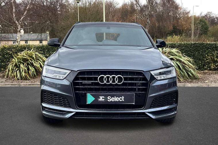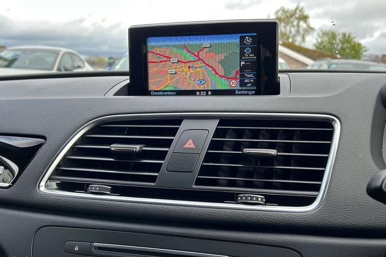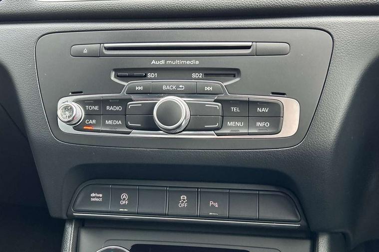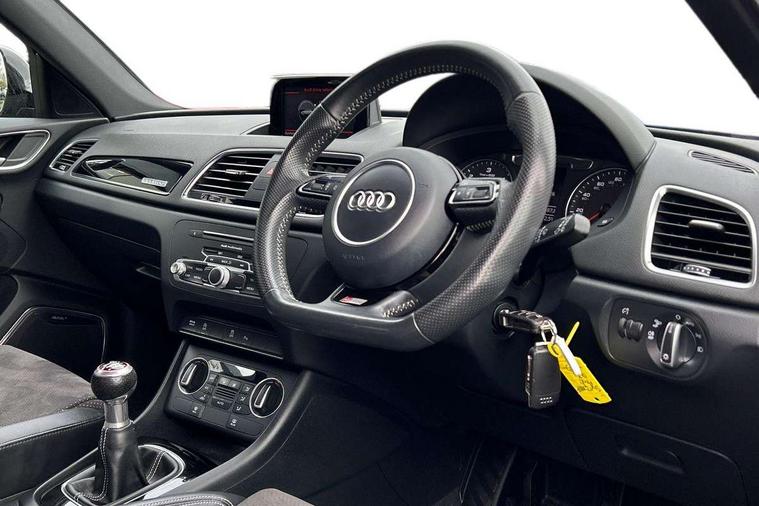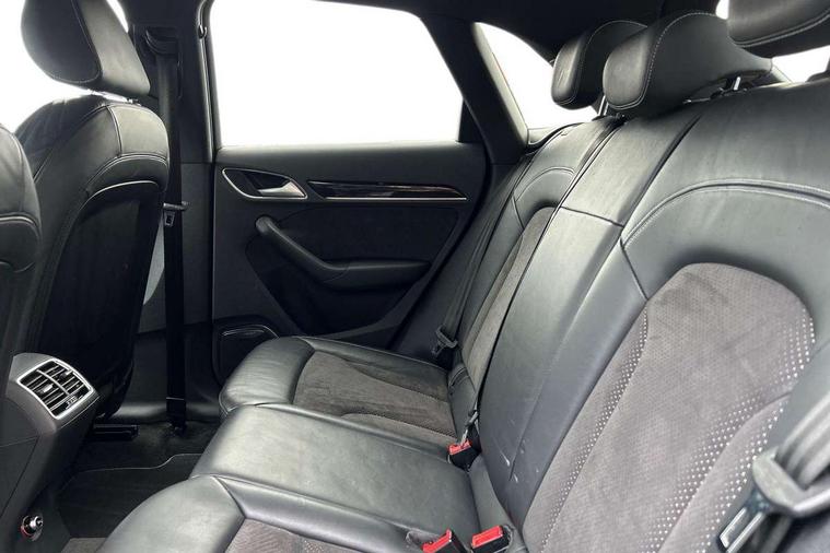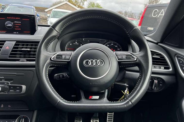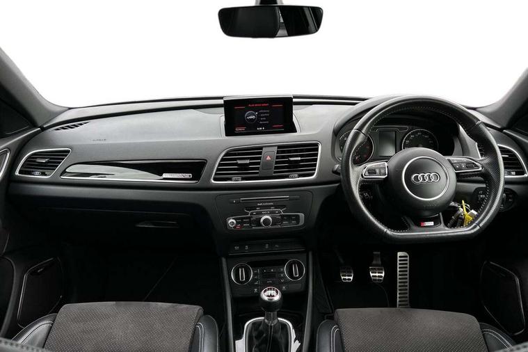 6.5" colour display screen, Audi drive select, Cruise control, Electro-mechanical PAS, Low washer fluid indicator, MMI - Multi Media Interface control system, On board computer, Remote electric boot opening/closing, Service interval indicator, Voice control system, Diesel particulate filter, Sports suspension, Audi music interface, BOSE sound system, DAB digital radio module, Acoustic windscreen, Aluminium window surround, Auto dimming rear view mirror, Black exhaust tailpipes, Black high gloss door mirrors, Black roof rails, Body coloured bumpers, Chrome fog light surround, Chrome grille, Coming home function, Door mirror integrated indicators, Front and rear electric windows, Front lip spoiler, Heated windscreen washer jets, High Gloss Black Contrast Bumpers, High Gloss Black rear spoiler, LED daytime running lights, LED headlights with headlight washers, LED rear lights, Light and rain sensor for auto activation of lights and windscreen wipers, Loading sill protector in stainless steel, Privacy glass, Rear diffuser with platinum insert, Rear wiper, S Line body styling, Sunband for windscreen, 12V socket in rear centre console, 3 spoke flat bottom multi-function perforated leather steering wheel with contrast stitching, Aluminium door sill trims, Aluminium gear knob, Aluminium pedals, Black cloth headlining, Dual zone climate control, Electric front lumbar adjustment, Front and rear headrests, Front and rear velour floor mats, Front centre armrest with storage compartment and angle adjustment, Front sports seats, Height/reach adjust steering wheel, ISOFIX on front passenger and rear outer seats, Jack and tool kit, Retractable luggage cover, Reversible boot floor, Split fold rear seat, Storage compartment and 12V socket, Under floor storage in luggage area, Audi Exclusive black styling pack - Q3, LED interior light pack - Q3, 3x3 point rear seatbelts, ABS+Electronic Brake force Distribution, Curtain airbags, Driver and passenger airbags, Driver and passenger side airbags, EDL + ASR, Electrically operated child locks on rear doors, Electromechanical parking brake, ESP, First aid kit, Front passenger airbag deactivation, Head airbags, Seatbelt warning light, Tyre pressure monitoring system, Warning triangle, Locking wheel bolts, Remote central locking, Thatcham category 1 alarm + immobiliser, Piano black finish inlay,