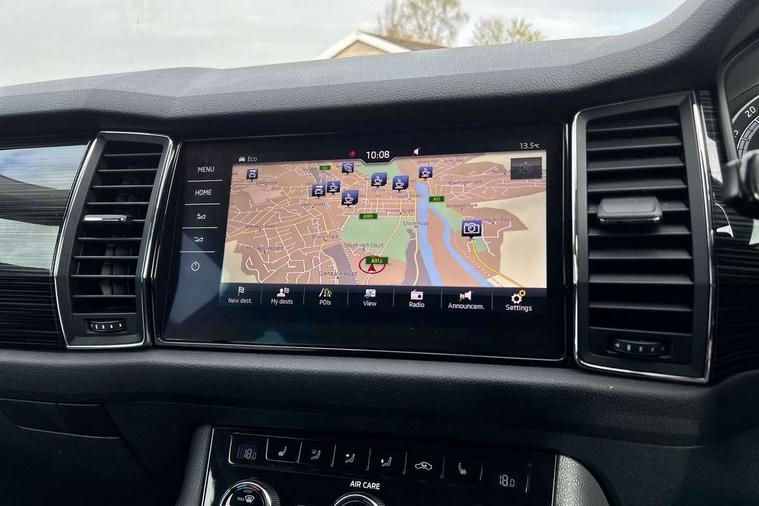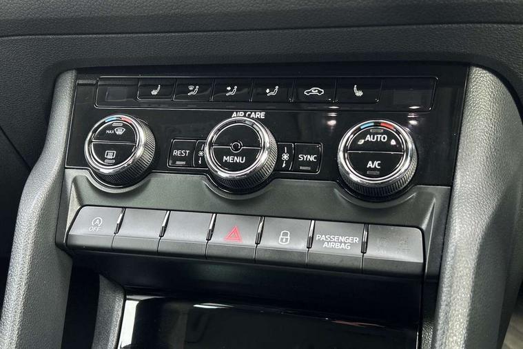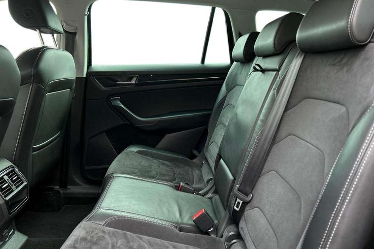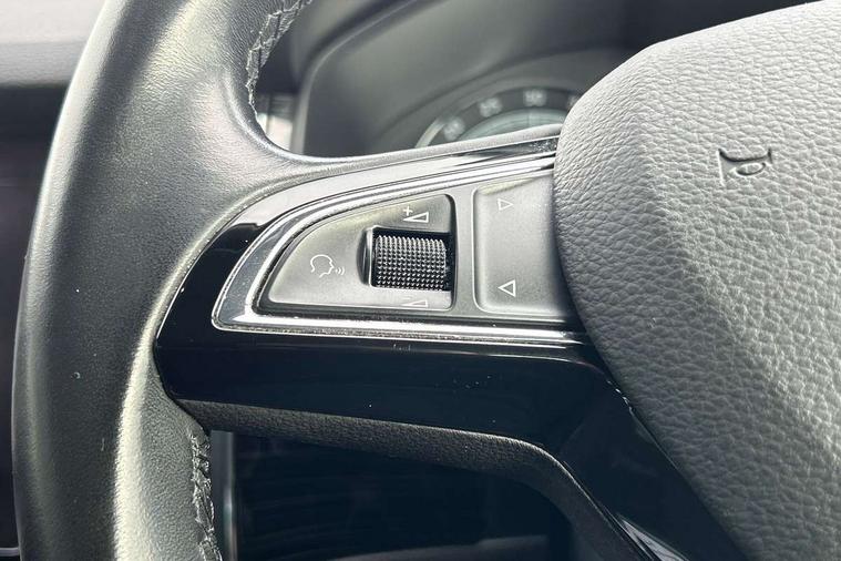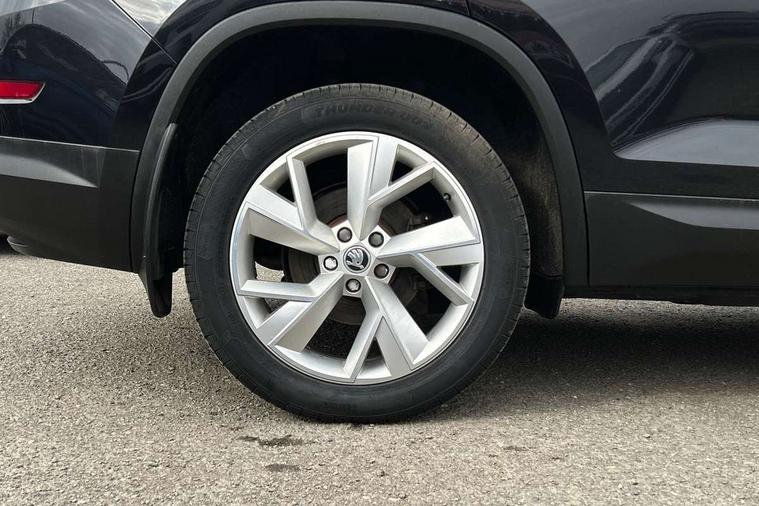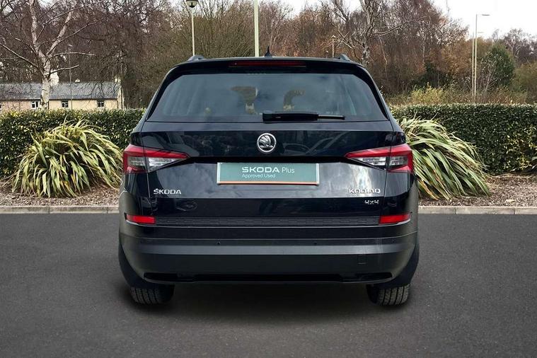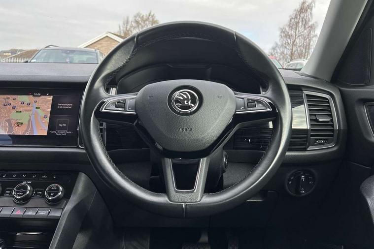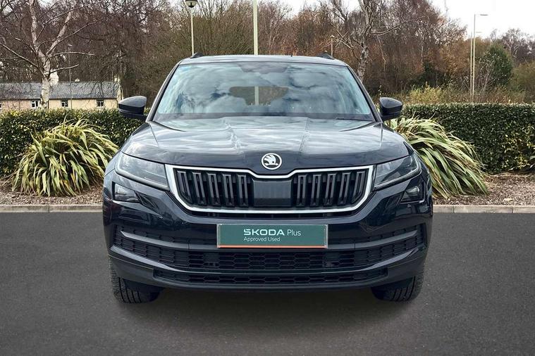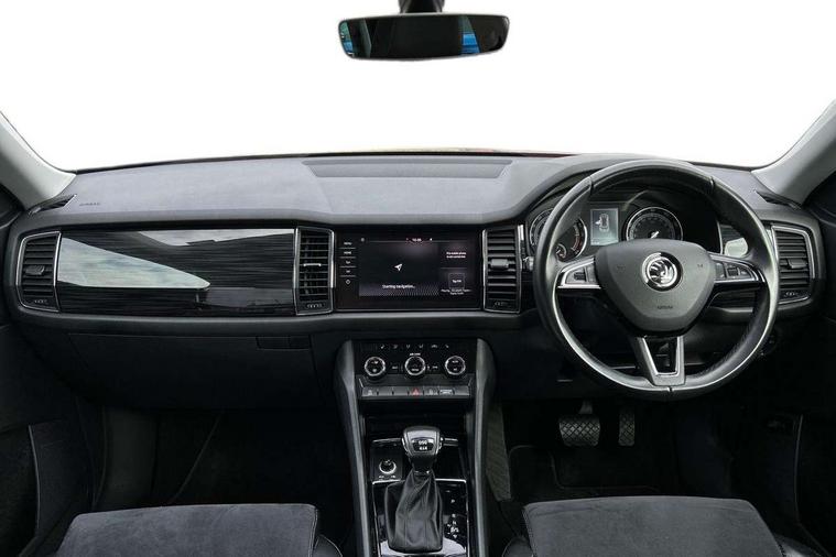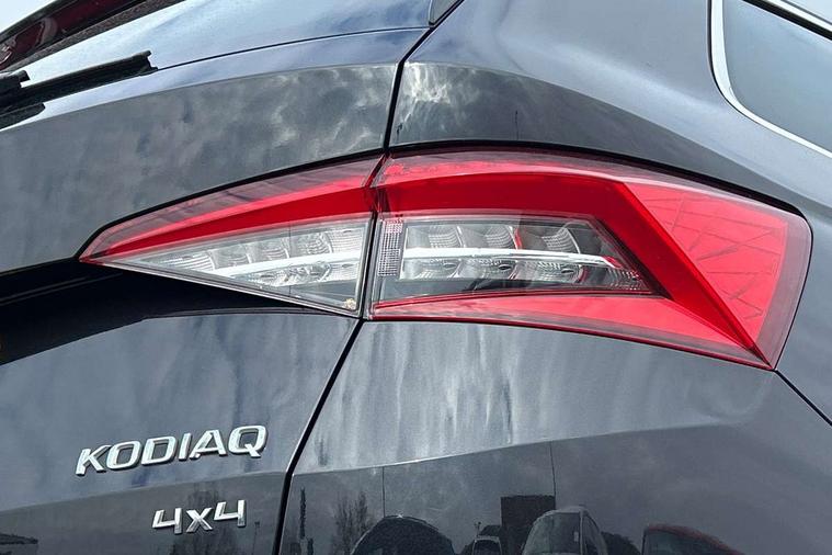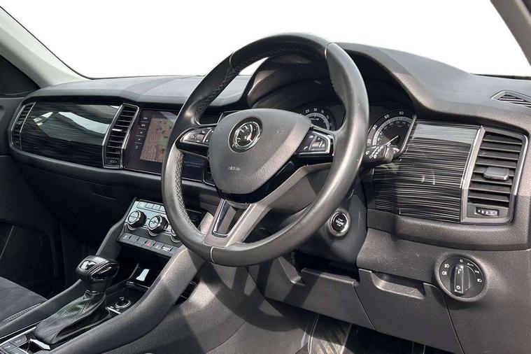 Bluetooth system, Columbus satellite navigation with 9.2" touch screen and integrated Wi-Fi, Drive mode selector, Exterior temperature gauge, Power tailgate, SmartLink, Speed limiter, Bolero Radio, DAB Digital radio, DVD System, SD card slot, USB connection, Adaptive front lighting system, Aero wiper + intermittent function, Auto dimming door mirrors, Auto dimming rear view mirror, Automatic activation of hazard warning lights, Body colour bumpers, Body colour door mirrors and handles, Electric adjustable/heated/folding door mirrors, Electric front windows, Electric rear windows, Front and Rear door steps, Headlight washers, Heated rear window, High gloss black grille with chrome inserts, LED daytime running lights, LED front fog lights with static cornering light function, LED Headlights, Light assistant (coming home/tunnel light), Rain and light sensors, Rear spoiler, Rear wiper, Sunset privacy glass, Tinted windows, 12V Accessory socket in centre console, 12V power point in luggage area, 3 rear height adjustable headrests, 4 lashing points on luggage floor, 60/40 split fold rear seat back, Boot storage compartments, Centre console with storage/cupholders, Chrome gear shift lever, Chrome inner door handles, Driver + front passenger lumbar support, Driver's glovebox with lid, Driver's storage box, Folding grab handles with rear coat hooks, Front and rear bottle holders, Front centre armrest with storage compartment, Front/rear courtesy lights, Height adjustable front seats, Height/tilt adjustable front headrests, Illuminated air conditioned glovebox, Illuminated luggage compartment, Isofix system on outer rear seats, Luggage compartment cover, Luggage nets in boot, Manually adjustable steering column, Passenger side net compartment on centre console, Pollen filter, Rear centre armrest with cupholders, Removable LED light in boot, Storage compartment under front seats, Sunglasses storage, Sunvisors with illuminated vanity mirrors, Ticket holder, Chrome pack - Kodiaq, 3 point front/outer rear seatbelts+pre-tensioners, ABS + EDL + ASR + MSR + ESC, Automatic unlocking of doors in case of impact, Driver and passenger airbags, Drivers knee airbag, Electromechanical parking brake, Front assist including city emergency braking, Front side airbags, Fuel cut off safety device, Head airbags, Hill hold control, Hydraulic Brake Assist (HBA), Passenger airbag deactivate switch, Seatbelt warning, Two tone horn, Tyre pressure monitor, Alarm with interior monitoring and tilt sensor, Anti-theft wheel bolts, Immobiliser, Keyless entry and keyless start, Remote central locking,