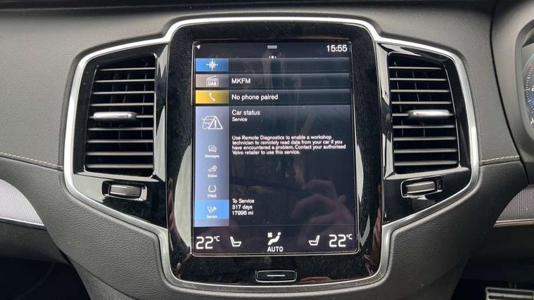 12.3" Active TFT crystal driver's instrument display, 9" centre console portrait touch screen, Adjustable steering wheel force, Bluetooth hands free telephone connection, Drive mode settings, Driver alert control with lane keeping aid, Driver assistance (pilot assist and adaptive cruise control), Driver awareness - Blind spot information system with steer assist, cross traffic alert with autobrake and rear collision warning and mitigation, Emergency call service, Front and rear park assist, Handsfree power tailgate opening and closing, Oncoming Lane Mitigation, Remote engine start, Sensus navigation with European mapping and traffic information, Service interval indicator, Speed limiter, Speed sensitive steering, Trip computer, Voice activated control for key functions, Volvo on call, 8 speed automatic transmission with start/stop + manual change functions, All wheel drive system, Touring chassis, DAB Radio (Digital Audio Broadcasting), Steering wheel remote infotainment controls, Adaptive brake lights with high level LED brake lights, Auto dimming interior + exterior mirrors, Automatic headlight levelling system, Automatic LED Headlights + Active high beam incorporating daytime running lights, Body colour bumpers, Dark tinted windows for rear side windows and cargo area, Dual integrated exhaust pipes with high gloss black surround, Electric folding and heated door mirrors, Front and rear power windows, Heated washer nozzles, High gloss black Deco lower front bumper, High gloss black door mirrors, High gloss black lower rear valance, High gloss black mesh front grille with surround, High gloss black window surround, Home safe and approach lighting, Integrated roof rails in high gloss black, Puddle lights, Rain sensor with automatic windscreen wiper activation, Rear side wing doors, Rear wash/wipe with intermittent wipe setting, Roof antenna, Roof spoiler, Visible VIN plate, 12V socket front tunnel console, rear passenger compartment and cargo area, 2 seat bench in 3rd row, 3 seat bench in 2nd row, A-pillar parking ticket holder, Ambient door and instrument panel lighting, B Pillar ventilation, Bright metal luggage threshold, Cargo divider with grocery bag holder, Centre console cupholders and storage, Charcoal headlining, Driver's side lower dashboard storage compartment, Front and rear door pocket and front cupholder illumination, Front footwell and side step illumination, Front headrests, Front seat cushion extensions, Heated front seats, Height/reach adjustable steering column, Illuminated front and rear tread plates, Illuminated luggage compartment, Illuminated tailgate, Illuminated vanity mirrors + ticket holder, Illumination lockable glovebox compartment, Integrated sun curtains in rear doors, Load protection net, Lower dashboard, tunnel console, Lower door panel in blond, Multicolour theatre lighting, Outboard armrest with cupholder and storage for third row passengers, Power driver seat with multi directional lumbar support and memory for seat and exterior mirrors, Power folding 2nd row headrests, Power passenger seat with multi directional lumbar support and memory, Rear footwell and side step illumination, Rear headrests, Semi automatic load cover, Single front passenger seat, Sports floor mats, Sports leather gear knob, Sports pedals, Underfloor cargo storage, 7 three point seatbelts, City safety includes pedestrian, cyclist and large animal detection and front collision warning with full auto brake, Drivers knee airbag, Dual stage driver/passenger airbags, First aid kit, Front seats SIPS airbags, Hill descent control, Hill start assist, IC (Inflatable Curtains) - Full Length, Passenger airbag cut-off switch, Power parking brake with auto hold function, Road sign information display, Run off Road Mitigation, Run off Road Protection, Seatbelt reminder and pretensioners for all seats, SIPS (Side Impact Protection System), Slippery road and hazard light alert, Stability and Traction Control with Spin control, Engine Drag Control and Corner Traction Control, Tyre pressure monitoring system, Vehicle deceleration control with Anti-lock Brake System, Electronic Brake Distribution and Emergency Brake Assist, Warning triangle, WHIPS whiplash protection system - front, Anti-theft alarm including immobiliser/volume sensor + level sensor, Care key with user defined top speed, Key integrated remote control central locking + fuel flap with deadlocking system and auto open/close power windows, Keyless drive (includes keyless entry and keyless start) with remote tag, Locking wheel nuts, Private locking for glovebox and tailgate, Metal mesh inlays, Tailored Instrument Panel and Door Tops with Contrast Stitching, Tempa spare wheel and jack,