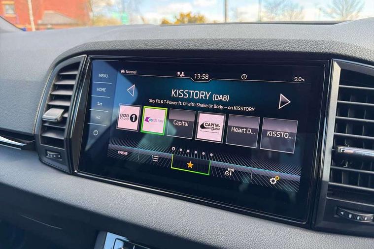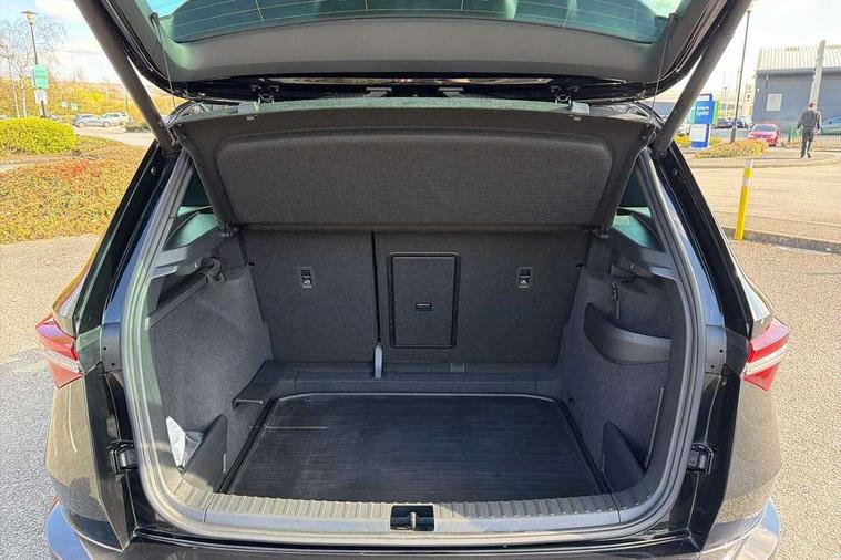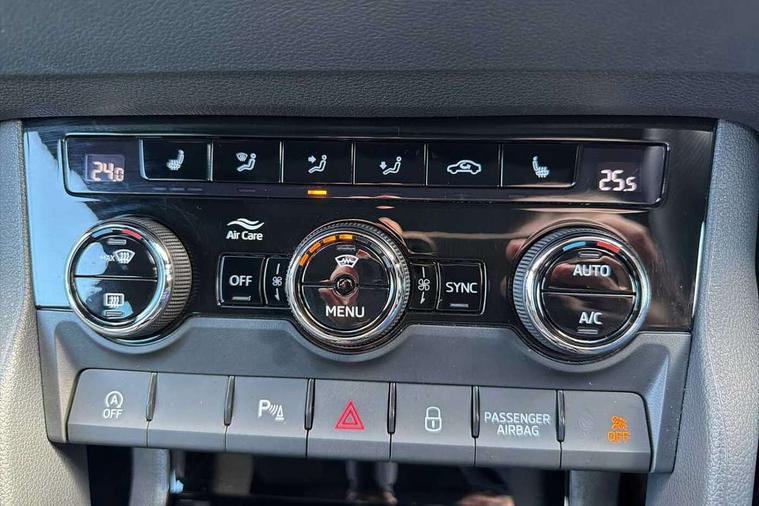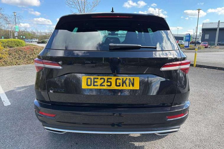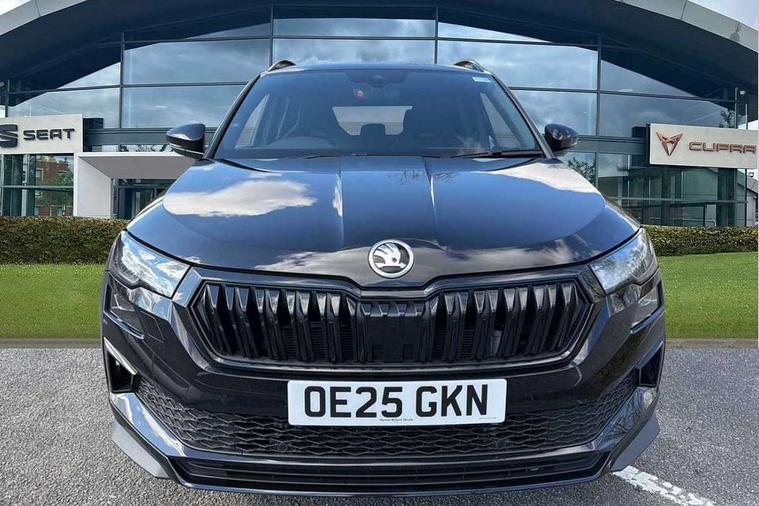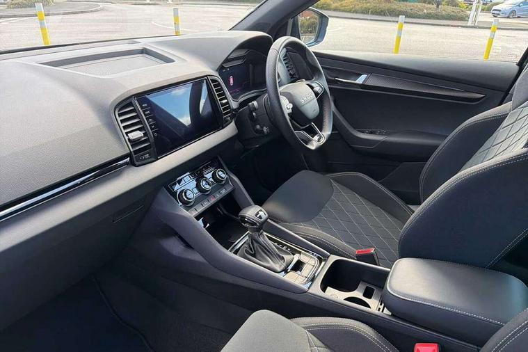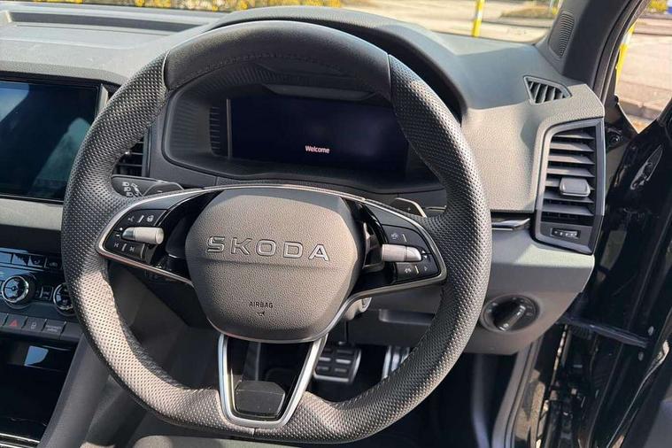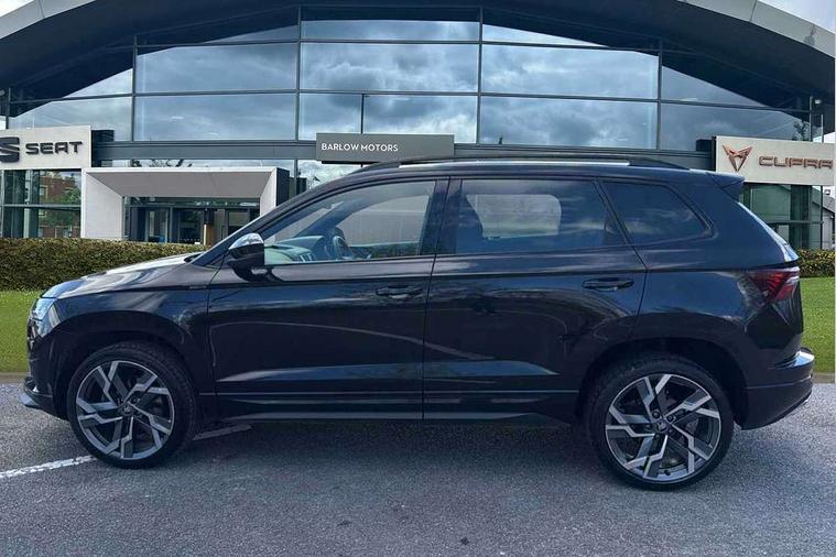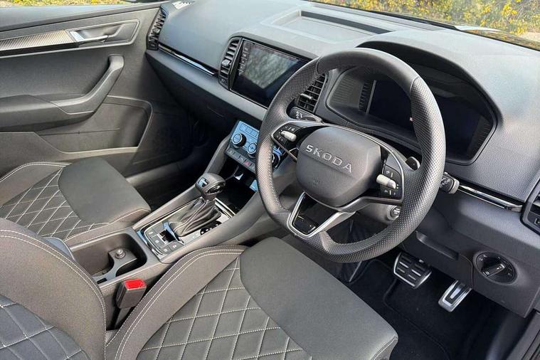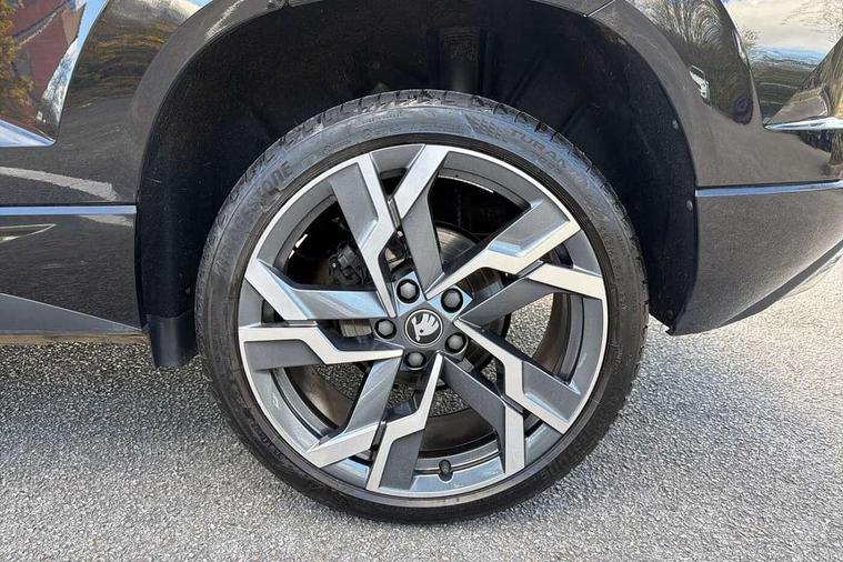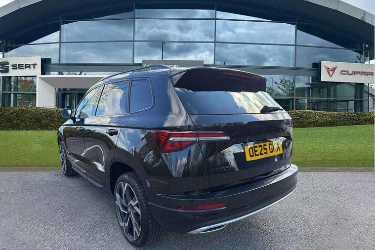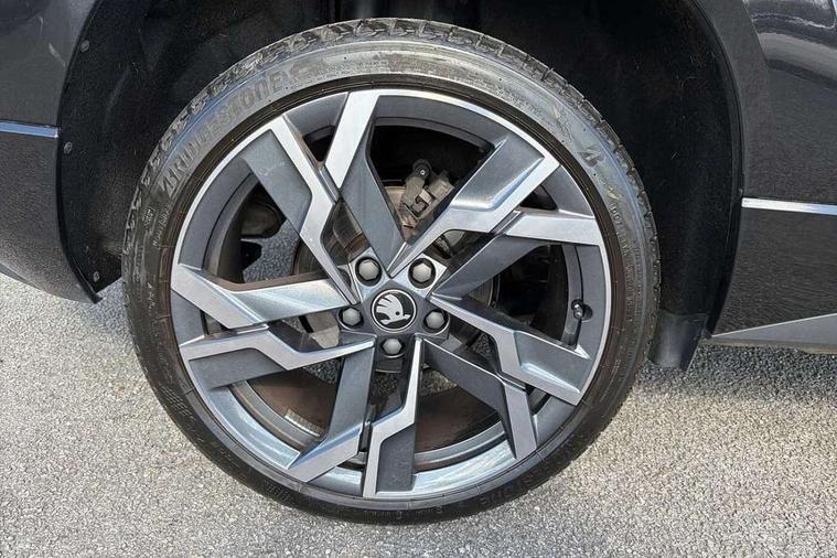 Advanced driver attention and drowsiness monitor, Emergency services call system, Outside temperature gauge, Sensor for driver assistance systems, Service interval indicator, SmartLink wireless for Apple and wired for Android, Start/stop system with regenerative braking, Traffic sign recognition, USB C Port x 2 in front centre console, Virtual Cockpit - 10.25" digital display, Virtual pedal with electrically operated boot door, Wireless smartphone charging, DAB radio with Bluetooth, USB connection, Acoustic glass, Aero front windscreen wipers with intermittent function, Auto dimming rear view mirror with light and rain sensors, Black door mirrors, Black electric window control buttons, Black radiator grille, Black roof rails, Body colour door handles, Electric front and rear windows with child proof lock, Extended rear roof spoiler, Front door steps with SportLine logo, Heated rear windscreen, LED daytime running lights, LED rear lights with high functionality welcome effect and dynamic indicators, Light assistant (coming/leaving home/tunnel light), Panoramic sliding sunroof, Plastic scuff plates in door apertures, Privacy glass, Protective door side sills in body colour, Rear diffuser, Rear side wing doors, Rear window wiper with washer system and intermittent control, Safety reflectors on front doors, Skoda lettering on tailgate in black, Sportline badge on front fender, Sports front and rear bumpers, Third brake light, Unique dark chrome design logo on alloy wheels, 1.5 litre bottle holders in driver and front passenger door panels, 12V socket in boot, 12v socket in front centre armrest with storage compartment and rear air vents, 2 x Tablet holder, 3 rear height adjustable headrests, 3 seat bench in 2nd row, 3 spoke sports leather heated multifunction steering wheel with DSG paddles, 4 foldable roof handles with rear coat hooks, Black floor carpet, Cargo elements in boot, Chrome inner door handles, Foldable hooks in the boot, Front head restraints, Height adjustable front three point seats belts with tensioners, Height/reach adjust steering wheel, Ice scraper, Illuminated glovebox, Illuminated luggage compartment, Isofix child seat preparation for front passenger seat, Isofix child seat preparation outer rear, Manual lumbar support for front seats, Pen holder, Pollen filter, Rear backrest release from boot, Rear boot cover, Rear package tray, Rear reading lights, Rear seats fixed folding and divided 60:40, Rubbish bin door, Safety vest holder, Single front passenger seat, Skoda lettering on steering wheel, Sportline decorative inserts, Storage box in upper central dashboard closed, Sunvisors with illuminated vanity mirrors, Textile floor mats, Ticket holder, Titan black interior ceiling, Umbrella under passenger seat, Under passenger seat storage compartment, Columbus pack - Karoq, LED Interior lighting pack with Skoda welcome logo - Karoq, Light Pack - Karoq, Non Smokers pack, Performance pack - Karoq, Winter plus pack with heated front and rear seats - Karoq, Automatic door unlocking in case of crash, Automatic fuel cut off in case of crash, Driver airbag, Electronic parking brake with auto hold function, Emergency rear braking signal, ESC (incl. ABS+MSR+ASR+EDS+HBA+DSR+RBS+MKB), Front side airbags, Head airbags, Hill hold control, Knee airbags, Passenger airbag with switch-off function, Pedestrian monitor, Seatbelt reminder signalisation and pretensioner for all seats, Three point seatbelts rear, Two tone horn, Tyre pressure monitor, Alarm with interior monitoring, back up horn and tilt sensor with safe function, Electronic engine immobiliser, Keyless entry and start/stop, Remote central locking with 2 remote folding keys, Black air vent surround, Black centre console, carbon door decor, Satin black dashboard, Satin black door trim, 19" Sagittarius anthracite alloy wheels, Anti-theft wheel bolts protection, Breakdown and tool kit,