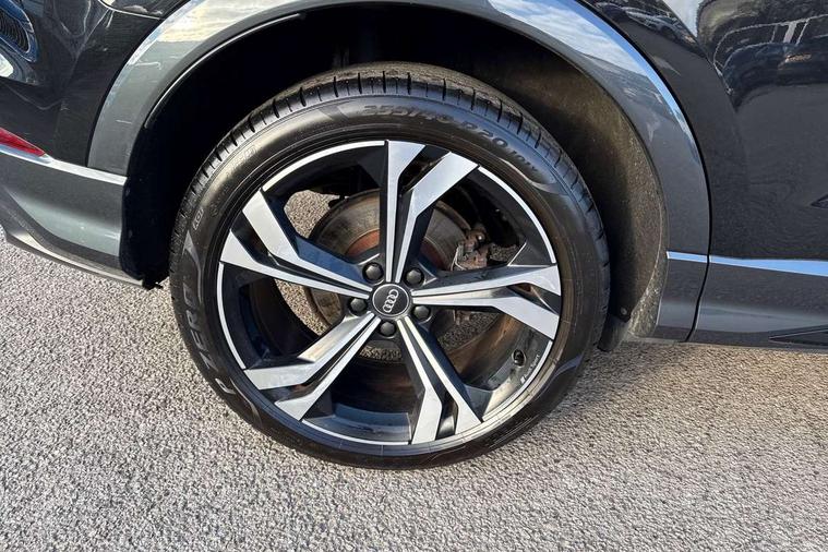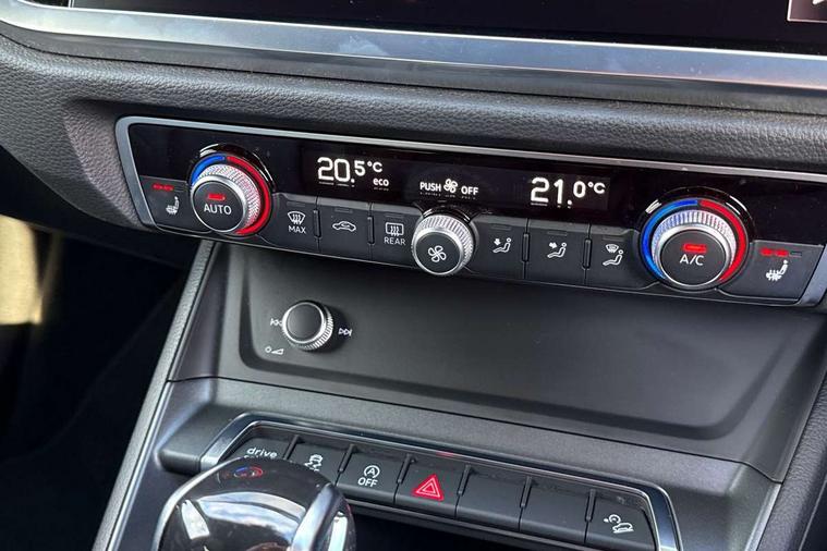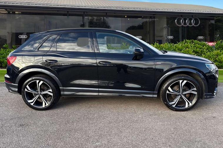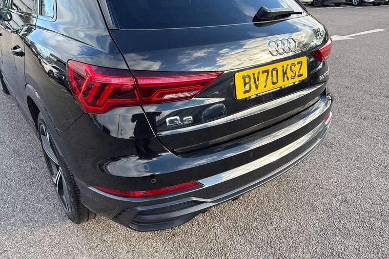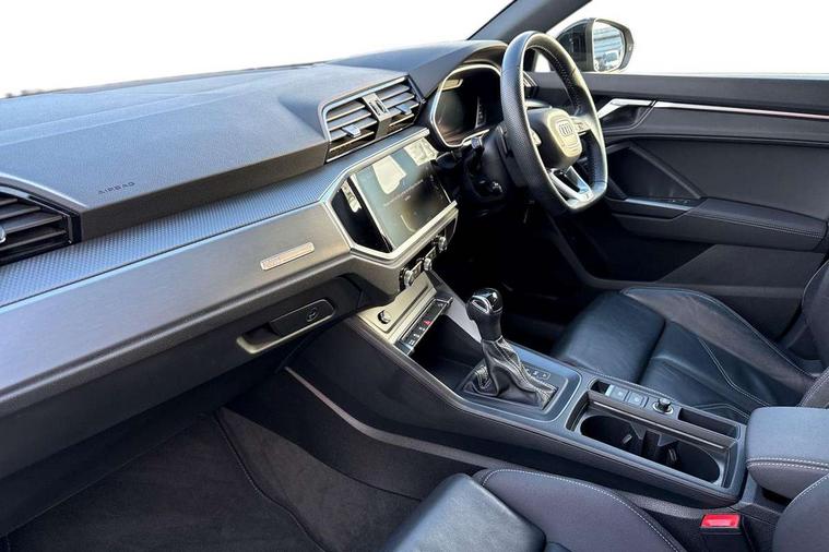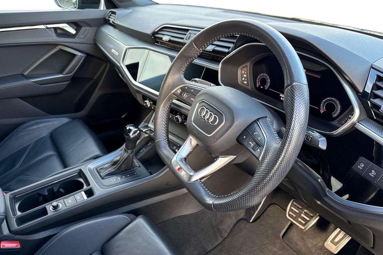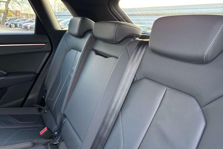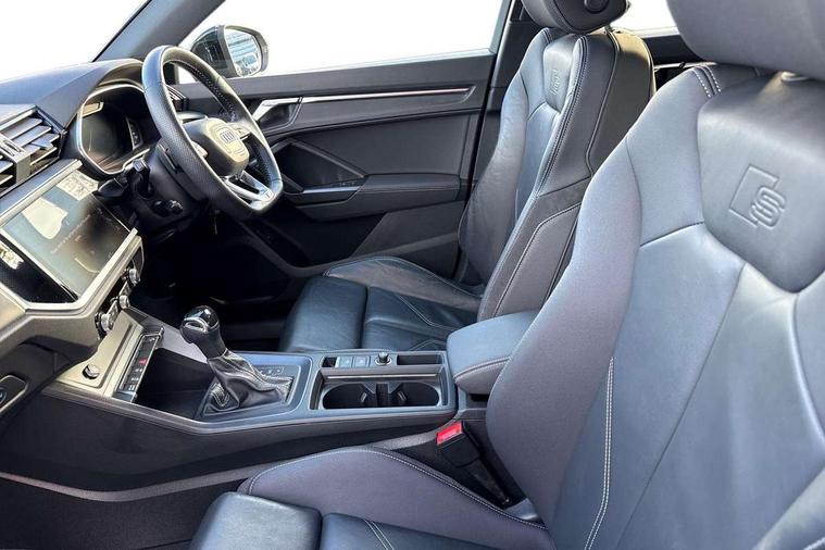 Audi connect safety and service (e-call), Audi drive select, Audi lane departure warning, Audi side assist, Audi smartphone interface includes wireless Apple carplay/Android Auto, Audi virtual cockpit plus, Bluetooth interface, Camera based traffic sign recognition, MMI Navigation Plus with high resolution 10.1 inch touchscreen colour display, Power operated tailgate, Progressive steering, Service interval indicator, Start stop system with recuperation, Voice control system with natural language interaction, 48V Mild hybrid technology, Sports suspension, 1 x USB type C and 1 USB type A charging points, 6 passive loudspeakers, DAB digital radio module, Acoustic windscreen, Audi Beam uses LEDs to project the Audi Sport logo, Auto dimming frameless rear view mirror, Black roof rails, Electrically folding, adjustable and heated door mirrors with integrated LED side indicators and kerb view function for passenger side, Front and rear electric windows, Front fog lights, Front spoiler blade in matt platinum grey, Grille vertical bars in aluminium silver/Matt, Headlight washers, High gloss black finish B and C pillars, Matrix LED headlights with LED rear lights and dynamic front and rear indicator, Privacy glass dark tinted rear and rear-side windows (from B-pillar backwards), Rain and light sensors, Rear diffuser strip in matt titanium black, S line bumpers in contrasting Manhattan grey, Side skirt insert in matt Platinium grey, Silver chrome grille surround, 12V socket in rear centre console, 3 spoke flat bottomed high multi-function leather sport steering wheel with gearshift paddles, 4 way electric lumbar support for driver and front passenger, 40:20:40 folding with manual adjustment for 60:40 forwards/backwards position and backrest angle, Adjustable rear seat bench/backrest with centre armrest and cupholder, Black cloth headlining, Dual zone electronic climate control, Electrically adjustable front seats, Front and rear black floor mats with contrast stitching in rock grey, Front and rear headrests, Front and rear roof module including reading lights, Front centre armrest, Glove compartment lighting, Heated front seats, Height and reach adjustable steering wheel, Illuminated door sill trims with S logo, ISOFIX child seat mounting for front passenger with airbag deactivation and outer rear seat including top tether attachment point for outer rear seats, Luggage compartment light, Perforated leather gearknob, Stainless steel luggage compartment sill finisher, Stainless steel pedals, Tool kit, Black styling pack - Q3, Multi coloured extended ambient interior lighting pack - Q3, Non smoking pack - Q3, 3x3 point rear seatbelts, 6 airbags - Driver, front passenger, curtain and side windows, Audi pre-sense front with pedestrain and cyclist recognition, Electrically operated child locks on rear doors, Electromechanical parking brake, Electronic stabilisation control including ABS, ASR and EDL, Hill descent control, Hill hold assist, Pre sense basic, Seatbelt monitoring, Tyre pressure warning, Warning triangle and first aid kit, Anti theft alarm, Anti theft wheel bolts, Remote central locking, Dark matt brushed aluminium inlay, Detail dashboard around MMI touch colour display in glass look, black with surround in aluminium look, Leatherette door armrest, Tyre repair kit,