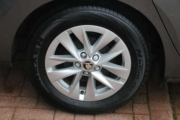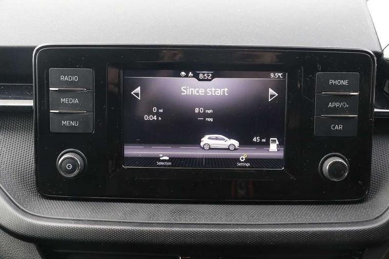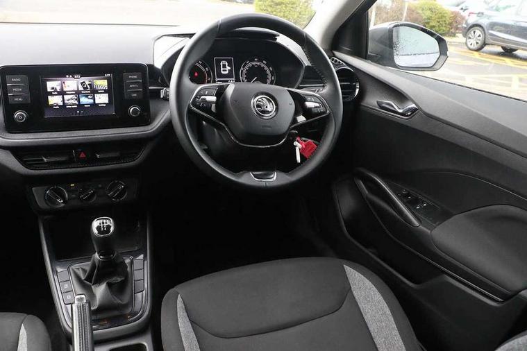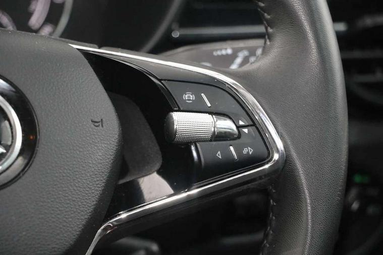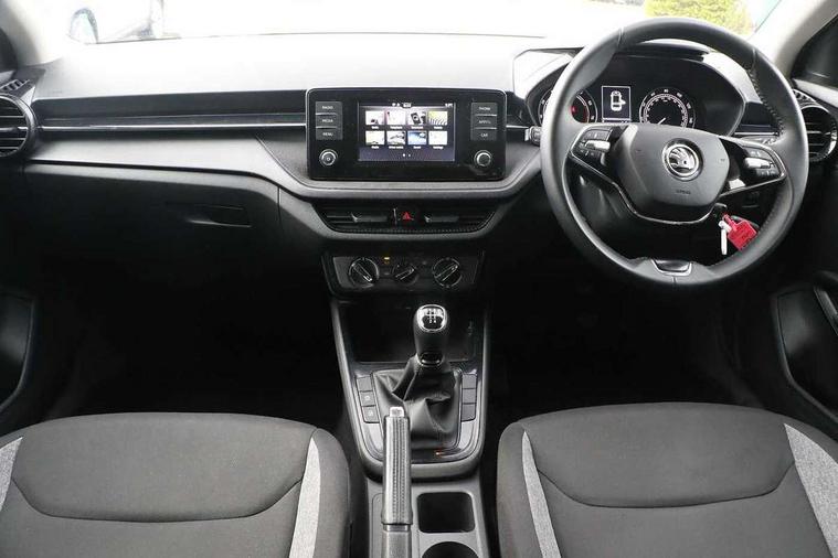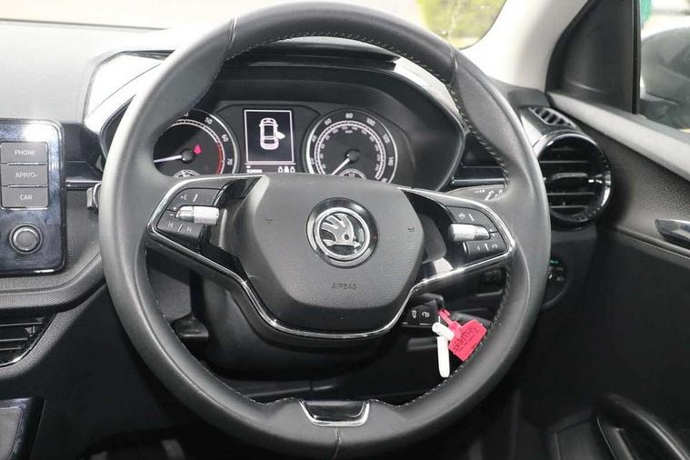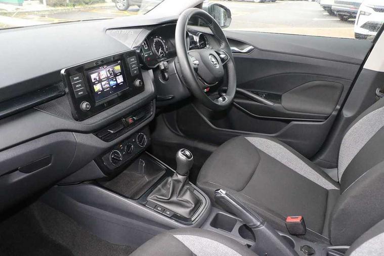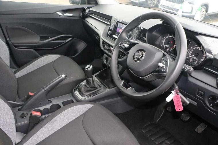 Bluetooth connection, Driver alert system - DAS, Electromechanical power steering, Exterior temperature gauge, Lane assist including road edge detection, Multifunction trip computer in black and white, Service interval indicator, Speed limiter, 2x USB-C in the front (for data transmission and charging), 4 speakers in front, Auxiliary socket for external MP3 player, DAB digital radio reception, Radio Swing with 6.5" colour display, Basic LED Headlights, Basic rear lights, Body colour door mirrors, Body coloured bumpers, Dimming rear view mirror with black frame, Door mirror integrated indicators, Electrically adjustable and heated door mirrors, Electrically adjustable front windows with function auto up/down, Front fog lights, Front window wiper intermittent control, Headlight range control - Automatic, Ice scraper in fuel cap, LED daytime running lights with coming and leaving home feature, Mechanical adjustable rear windows, Rain sensor, Rear LED fog light, Rear side wing doors, Rear window wiper with washing nozzles, Roof mounted spoiler, SKODA tailgate lettering in chrome, Third brake light, 2 reading lights in front and 2 reading lights in rear, 2 spoke leather multifunction steering wheel, 3 rear headrests, Backrest split and folding, Central console with fixed cup holder and storage box, Chrome handbrake release button, Fabric upholstery, Gearshift knob/handle in leather, Grain satin black interior door handles, Hand brake lever handle in leather, Height adjustable front headrests, Height adjustable front seats, Height adjustable steering wheel, ISOFIX and TopTether anchorage points to the outer rear seats, ISOFIX and TopTether on the front passenger seat, Luggage compartment lighting, Manual air conditioning, Manually adjustable lumbar support in front seats, Pollen filter, Rear seat bench unsplit, Single front passenger seat, Storm grey headlining, Sun visors with mirror and airbag label on passenger side, Ticket holder, 3-point height adjustable front seats belts with pretensioner and force limiter, Automatic warning lights in case of crash, Driver and passengers airbag with switch off function, e-Call+, ESC including ABS, MSR, ASR, EDS, HBA and XDS, Front and rear seat belt warning, FRONT ASSIST (AEB City and AEB Inter Urban), Front side airbags, Head airbags, One tone horn, Pedestrian protection, Three rear 3-points safety seat belts with pretensioner and force limiter including stop function for outer rear seat belts, Tyre pressure monitoring system, Anti-theft alarm system including immobiliser, interior monitoring, backup horn, and towing protection, Central locking with radio remote control, interior controls, SAFE function and 2 foldable keys, Black painted air vents, Glossy black decorative trim, Grain satin black central console cover, Grain satin black lower decorative trim, Satin black door and side trim panel in front, Anti-theft wheel bolts protection, Super-low rolling resistance tyres,