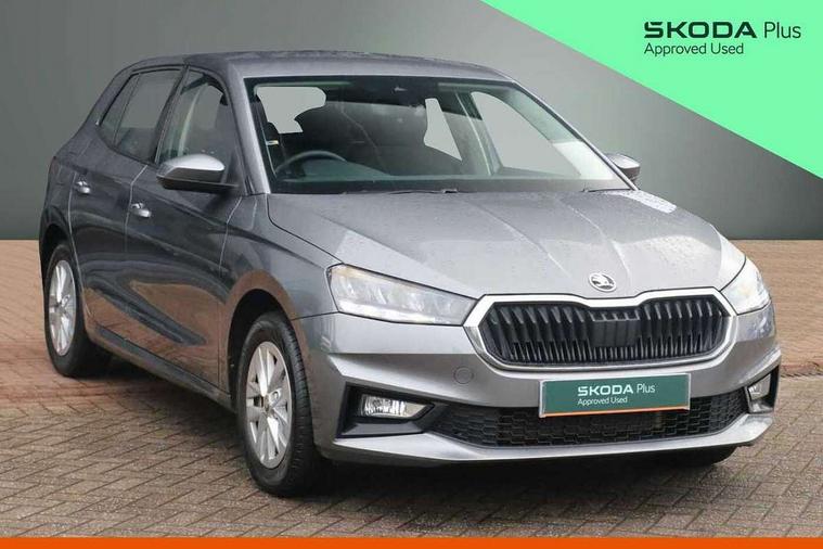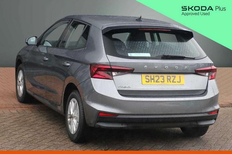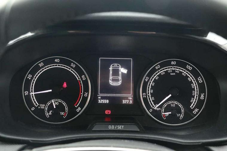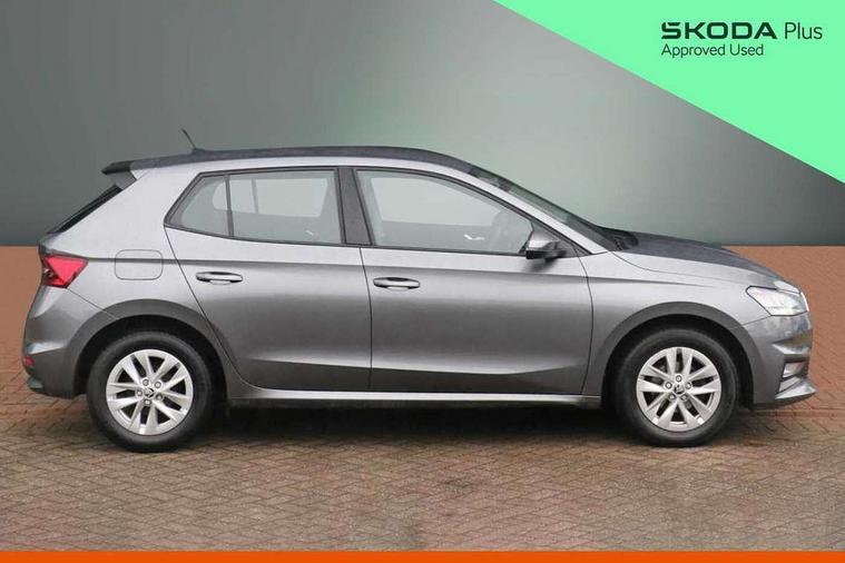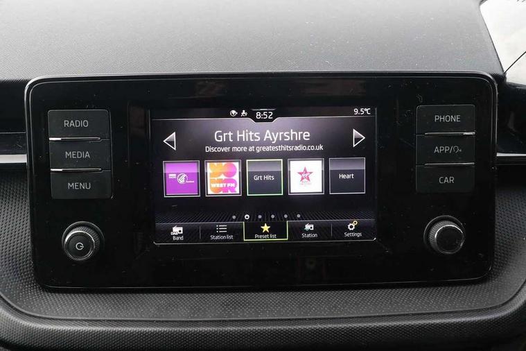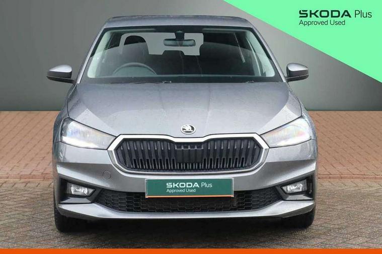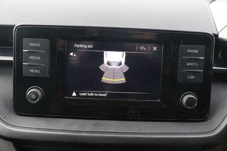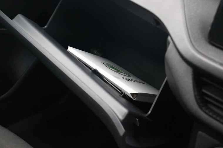 Bluetooth connection, Driver alert system - DAS, Electromechanical power steering, Exterior temperature gauge, Lane assist including road edge detection, Multifunction trip computer in black and white, Service interval indicator, Speed limiter, 2x USB-C in the front (for data transmission and charging), 4 speakers in front, Auxiliary socket for external MP3 player, DAB digital radio reception, Radio Swing with 6.5" colour display, Basic LED Headlights, Basic rear lights, Body colour door mirrors, Body coloured bumpers, Dimming rear view mirror with black frame, Door mirror integrated indicators, Electrically adjustable and heated door mirrors, Electrically adjustable front windows with function auto up/down, Front fog lights, Front window wiper intermittent control, Headlight range control - Automatic, Ice scraper in fuel cap, LED daytime running lights with coming and leaving home feature, Mechanical adjustable rear windows, Rain sensor, Rear LED fog light, Rear side wing doors, Rear window wiper with washing nozzles, Roof mounted spoiler, SKODA tailgate lettering in chrome, Third brake light, 2 reading lights in front and 2 reading lights in rear, 2 spoke leather multifunction steering wheel, 3 rear headrests, Backrest split and folding, Central console with fixed cup holder and storage box, Chrome handbrake release button, Fabric upholstery, Gearshift knob/handle in leather, Grain satin black interior door handles, Hand brake lever handle in leather, Height adjustable front headrests, Height adjustable front seats, Height adjustable steering wheel, ISOFIX and TopTether anchorage points to the outer rear seats, ISOFIX and TopTether on the front passenger seat, Luggage compartment lighting, Manual air conditioning, Manually adjustable lumbar support in front seats, Pollen filter, Rear seat bench unsplit, Single front passenger seat, Storm grey headlining, Sun visors with mirror and airbag label on passenger side, Ticket holder, 3-point height adjustable front seats belts with pretensioner and force limiter, Automatic warning lights in case of crash, Driver and passengers airbag with switch off function, e-Call+, ESC including ABS, MSR, ASR, EDS, HBA and XDS, Front and rear seat belt warning, FRONT ASSIST (AEB City and AEB Inter Urban), Front side airbags, Head airbags, One tone horn, Pedestrian protection, Three rear 3-points safety seat belts with pretensioner and force limiter including stop function for outer rear seat belts, Tyre pressure monitoring system, Anti-theft alarm system including immobiliser, interior monitoring, backup horn, and towing protection, Central locking with radio remote control, interior controls, SAFE function and 2 foldable keys, Black painted air vents, Glossy black decorative trim, Grain satin black central console cover, Grain satin black lower decorative trim, Satin black door and side trim panel in front, Anti-theft wheel bolts protection, Super-low rolling resistance tyres,
