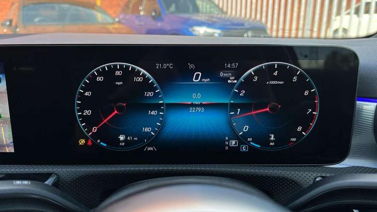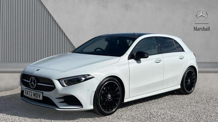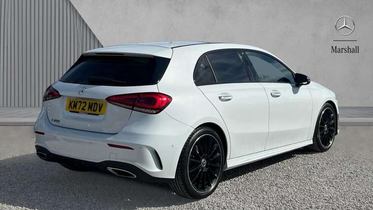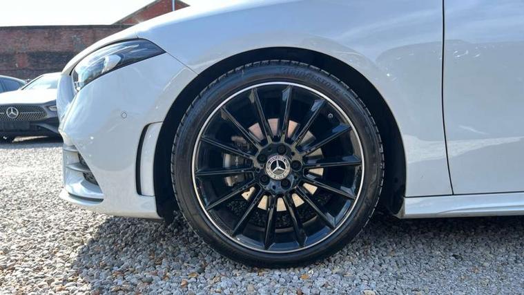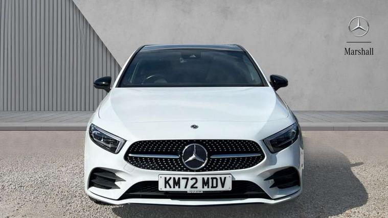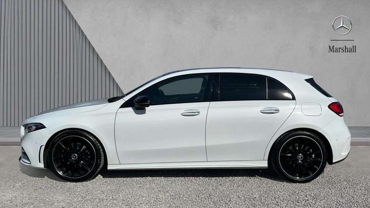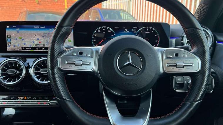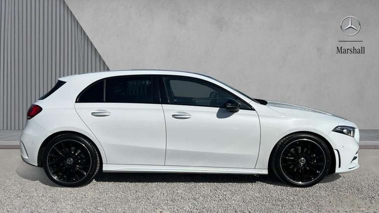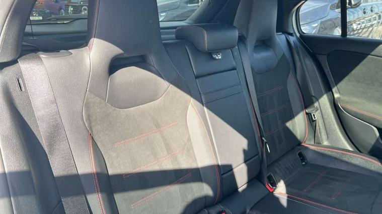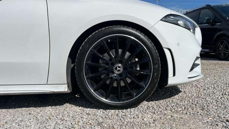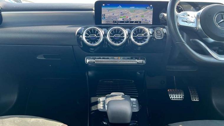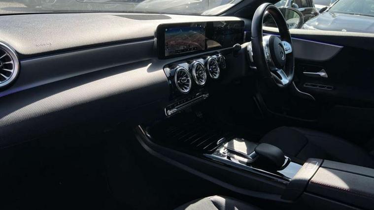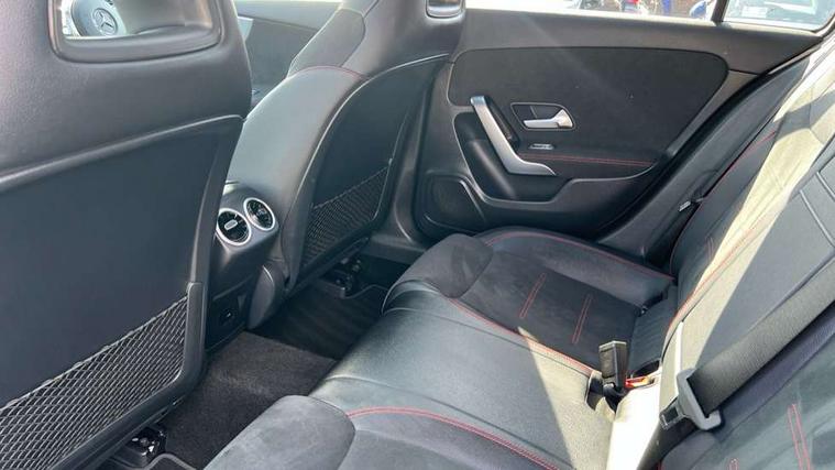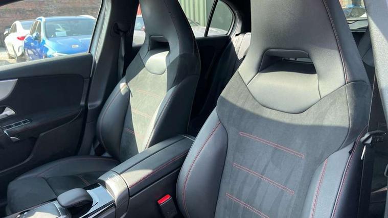 Ultrasonic sensors positioned in the front and rear bumpers, 10.25" Digital instrument cluster display screen, 10.25" media display, 180 degree rear view camera with parking guidelines, Active parking assist with visual and audible warning of detected obstacles, Attention assist, Brake pad wear indicator warning light, Car wash mode, Cruise control + speed limiter, Direct steering, Dual bluetooth interfaces, DYNAMIC SELECT with a choice of driving modes (ECO, Comfort, Sport and Individual), ECO start/stop function, Fluid level warning indicator for fuel, oil, coolant and washer fluid, Hard-disk navigation, Hey Mercedes Voice activation, Lamp failure indicator, Lane keeping system, Mercedes me connect including emergency call system, accident recovery, breakdown management and maintenance, Mercedes me remote services, Outside temperature gauge, Owners manual in English, Pre-installation for car sharing, Preinstallation for Mercedes Benz link, Service indicator (ASSYST), Smartphone integration with Apple CarPlay and Android auto, Speed limit assist, Speed sensitive power steering, Traffic sign assist, Trip computer, Lowered comfort suspension, Rear axle torsion beam, 2 USB ports (type C) in rear stowage compartment and one in front of center console, 6 speakers, DAB Digital radio, MBUX multimedia system with DAB digital radio and touchpad including satellite navigation, Mercedes-Benz sound system - 100W, 4 Electric Front and Rear windows, Adaptive brake lights, AMG bodystyling - Front apron with splitter in chrome, rear apron with chrome trim and chrome visible trim elements in tailpipe, Automatic headlights, Black weather strip, Body colour bumpers, Body colour door handles with chrome inserts, Body colour side skirt, Electric adjustable and heated door mirrors with integrated LED side indicators, Exclusive diamond radiator grille, Exhaust system - Twin visible tailpipes in polished stainless steel, Headlamp assist automatic headlamp activation, Heated glass rear windscreen + timer control, LED daytime running lights, LED High level third brake light, LED tail lamp, Multibeam LED headlights with adaptive highbeam assist plus, Panoramic sliding sunroof, Privacy glass, Radio aerial, Rain sensing windscreen wipers with two sensitivity settings, Rear fog lights, Rear side wing doors, Rear wiper, 3 seat bench in 2nd row, 3 Spoke flat bottom leather multi function steering wheel with perforated leather in grip area, 40:20:40 split folding rear seats, Artico man-made leather/Microfibre Dinamica upholstery with red contrast stitching, Auto Mercedes-Benz child seat recognition sensor, Black air vents with surround in silver chrome, Black roof lining, Brushed stainless steel sports pedals with rubber studs, Controller on centre console with chrome surround, Floor mats with AMG lettering, Front centre armrest with storage compartment, Front seat backs luggage nets, Galvanished gear shift paddles on steering wheel, Heated front seats, Height/reach adjustable steering column, Illuminated Mercedes Benz lettering front door sills with changeable cover, Interior lighting - 64 colour Ambient lighting, Interior mirror with reading lamps in black and frameless, ISOFIX and top tether child seat fixing points in two outer rear seats, Rear armrest with 2 cupholders, Rear head restraints, Seat occupancy sensor for front passenger seat, Single front passenger seat, Sports seats with integrated headrests, Stowage compartment in centre console with retractable cover, Sunvisors with illuminated vanity mirrors, Touchpad on center console, Twin front cupholders, Two zone thermotronic luxury automatic climate control, Light and sight pack - A Class, Mirror package - A Class, Night pack - A Class Saloon/Hatchback, Seat comfort pack - A Class, 3 rear 3 point seatbelts, ABS with Brake Assist, Active bonnet, Active brake assist includes forward collision warning system with autonomous braking, Adaptive brake assist with hold function and hill start assist, Black seatbelts, Childproof locks manually operated for rear doors and electrically operated for rear power windows, Crash responsive emergency lighting, Driver and passenger head and side airbags, Drivers knee airbag, Dual stage driver/passenger airbags, Electronic parking brake, ESP curve dynamic assist, ESP with ASR, Front and rear seatbelt reminder, Front brake callipers with Mercedes Benz lettering, Tyre pressure monitoring system, Warning triangle and first aid kit, Window airbags, Alarm system/interior protection/immobiliser, Keyless entry lock/unlock, Keyless Go, Remote central locking and crash sensor with emergency opening function, Urban guard vehicle protection system with immobiliser and interior protection, Matrix look light longitudinal grain aluminium trim element, 19" multi spoke light alloy wheels painted in black with a high sheen rim flange, Summer tyres, Tirefit sealant kit,