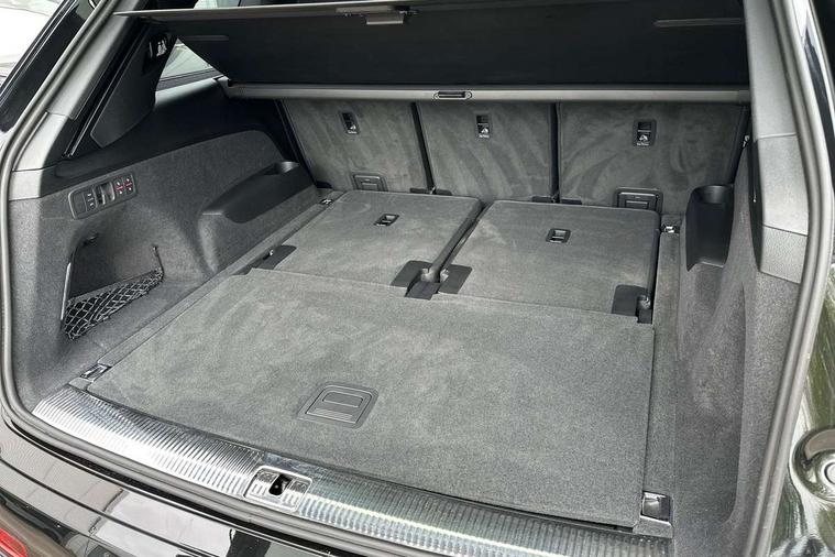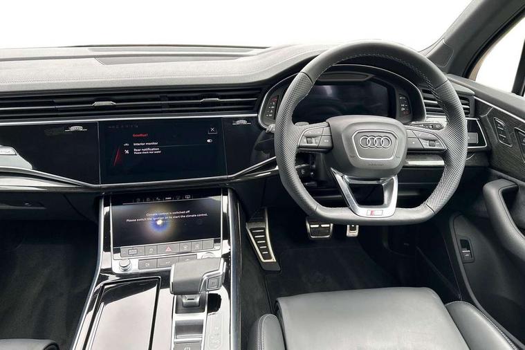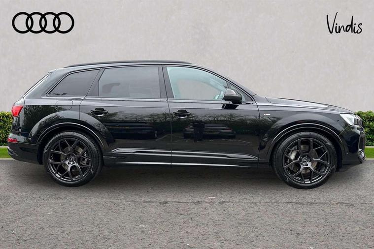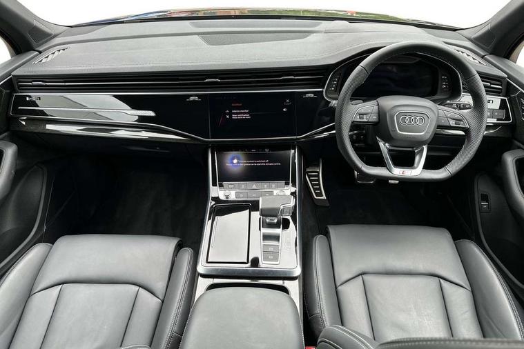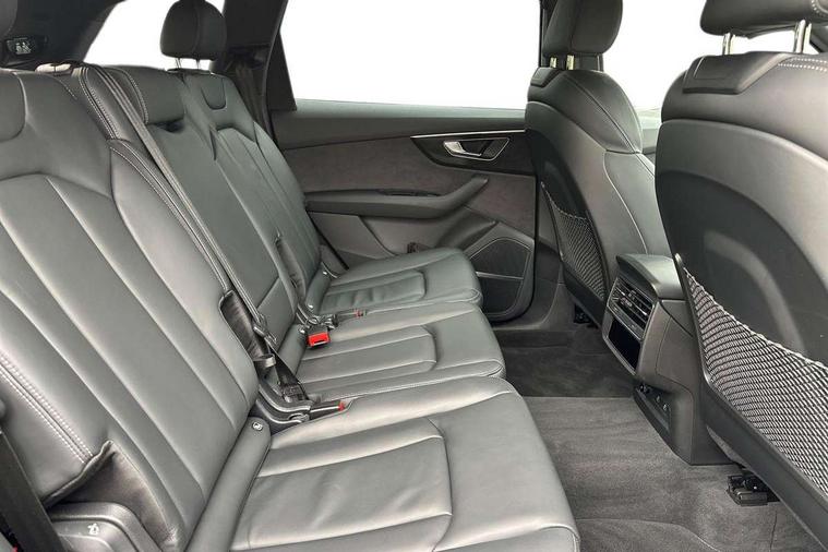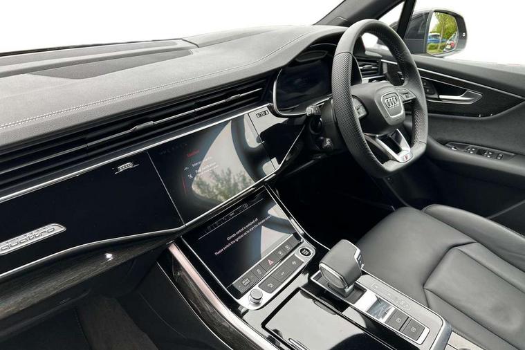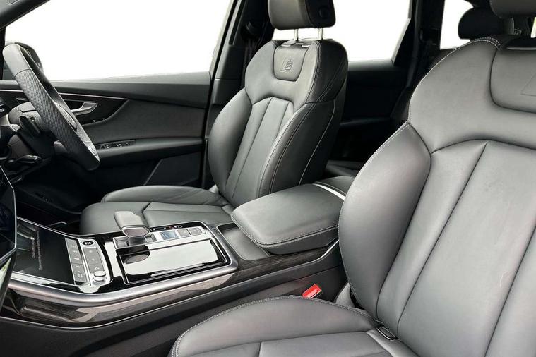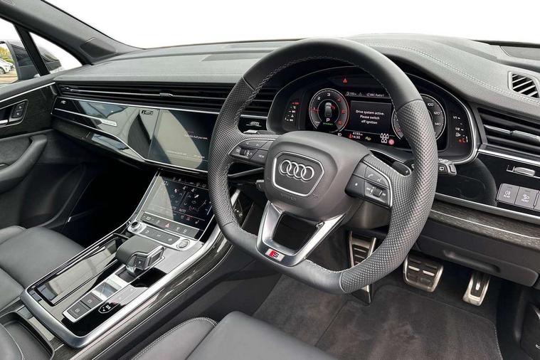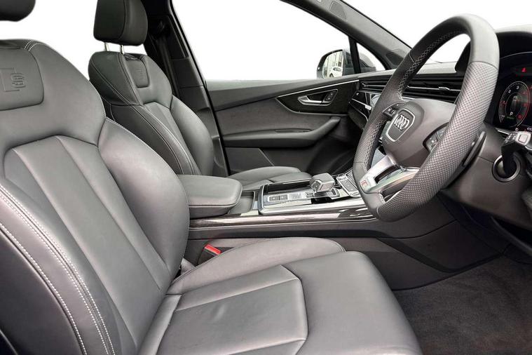 Audi connect safety and service (e-call), Audi connect with Amazon Alexa Integration, Audi drive select (Auto, Comfort, Dynamic, Efficiency, Individual, Off-road and All road), Audi phone box light with wireless charging, Audi virtual cockpit - 12.3" high-resolution LCD display with fully customisable instrument cluster, Bluetooth interface, Camera based traffic sign recognition, Electromechanical power steering, MMI navigation plus with MMI touch screens includes 10.1" and 8.6" screens with haptic feedback, Natural voice recognition, Operating buttons in Matte black, Parking system plus with 360 degree display (front, rear and side sensors) - acoustic and visual park assist system, Power operated tailgate, Rear view camera, Smartphone interface includes wireless Apple carplay/Android Auto, Start/stop system, 48V Mild hybrid technology, Adaptive air sports suspension, Quattro all wheel drive with self locking centre differential, Audi music interface - front 2 USB-C ports with charger and data functions, Audi sound system with 6 channel amplifier, 180 watt amplifying capacity and 10 loudspeakers including subwoofer, DAB digital radio module, Aluminium window trim, Audi Beam uses LEDs to project S emblem with red rhombus onto the ground when opening the side doors (front/rear), Auto dimming frameless rear view mirror, Black exhausts, Black roof rails, Electrically adj heated/folding + automatically dimming exterior mirrors with memory + automatic kerb side function for passenger side exterior mirror, Heat insulating glass in windshield, Integrated LED indications in door mirrors, LED 3rd brake light, LED daytime running lights, LED rear tail lights, Loading edge protection in stainless steel, Matrix LED headlights with dynamic front and rear indicators, Privacy glass - dark tinted rear and rear side windows from B-pillar backwards, Rear side wing doors, Rear wiper, 2 seat bench in 3rd row, 2 zone automatic climate control, 3 seat bench in 2nd row, 7 seat layout with ISOFIX points for the front passenger seat and rear passenger seat, Black carpets, Black cloth headlining, Comfort front centre armrest, Electric adjustable front seat with 4 way lumbar support, driver memory functionality, Folding rear seats, Front head restraints, Front/rear floor mats, Heated front seats, Illuminated door sill trims with S logo, ISOFIX child seat mounting for front passenger seat and 2 outer rear seats with top tether child seat mounting for all 3 rear seats, LED interior ambient lighting, Luggage compartment cover, Luggage compartment sill protection in stainless steel, Rear head restraints, Rear seat bench plus for the second row, with forwards/backwards sliding adjustment and backrest angle adjustment, Single front passenger seat, Stainless steel pedals, Sunvisors with illuminated vanity mirrors, Black styling pack plus - Q7, 3 point seatbelts on all rear seats, Audi pre sense basic, Audi pre sense front, Child locks on rear doors, Convenience key with safelock and gesture tailgate, Driver and front passenger, front side and curtain airbags, Electromechanical parking brake, Electronic Stabilisation Control (ESC) including ABS, ASR and EDL, Extended pedestrian protection measures, Hill hold assist, Seatbelt reminder, Tyre pressure loss indicator, Warning triangle and first aid kit, Anti theft alarm with tow away protection, Anti-theft wheel bolts and wheel loosening detection, Keyless Go, Remote central locking, Black dashboard, Polished oak trim with grey finish inlay, Tool kit, Tyre repair kit,