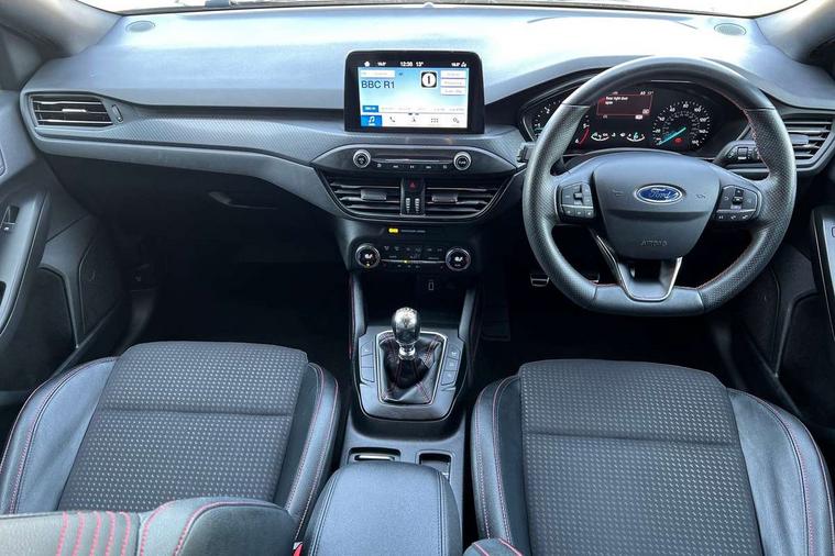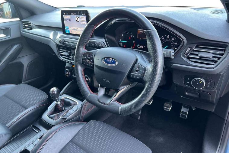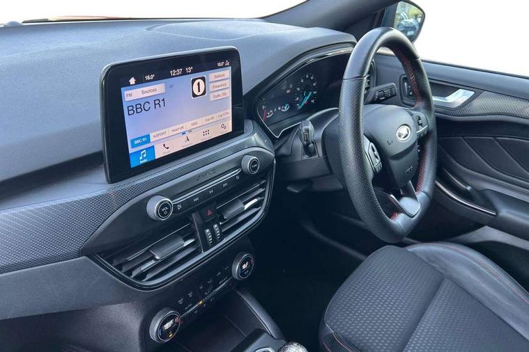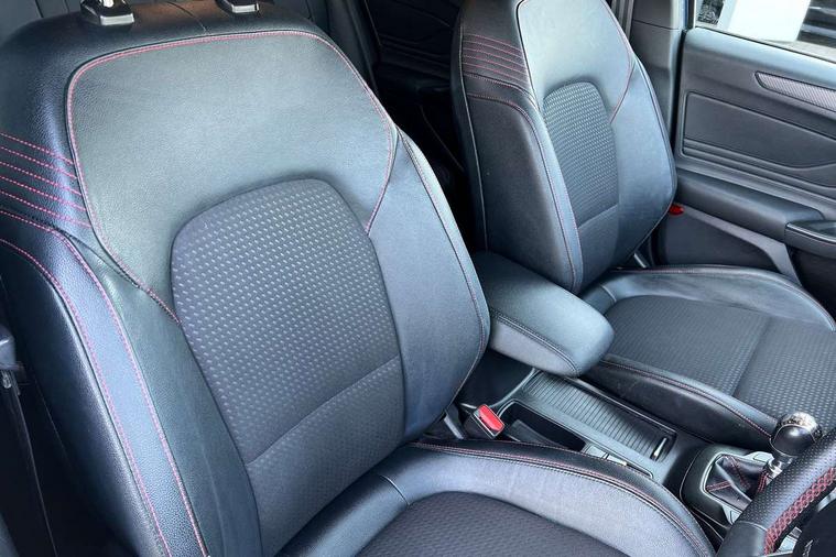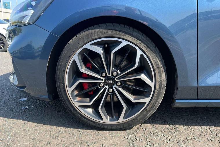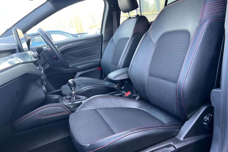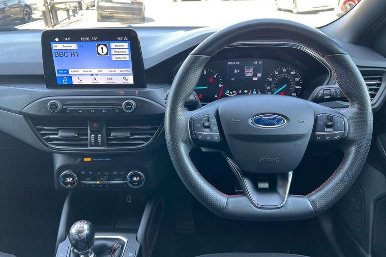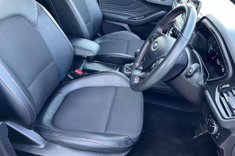 4" TFT coloured cluster screen, Bluetooth system, Digital clock, Easy fuel capless refuelling system, Eco mode, Ford pass connect, Ford SYNC 3 nav system with DAB radio, 8" colour touch screen, voice control, app link, Apple car play/Android auto and 4.2" TFT coloured cluster, Lane keeping aid with lane departure warning, PAS, Selectable drive mode, Trip computer, Diesel particulate filter, Sports tuned suspension, 2 USB ports, Aux input, 'Quickclear' heated windscreen/heated washer jets, Auto dimming rear view mirror, Auto headlamps (on/off), Automatic rain sensing wipers, Body colour large rear spoiler, Body colour power folding door mirrors with puddle lights, Body colour side skirt, Body coloured bumpers, Body coloured door handles, Body coloured electrically operated and heated door mirrors with side indicators, Electrically operated front and rear windows with one touch opening and closing, Front variable intermittent wipers with electric wash, Heated rear window, LED daytime running lamp, LED front fog lamps with cornering function, Polished twin tailpipe, Rear privacy glass, ST-Line upper and lower grille with full body styling kit and wing badges, Tailgate wash/wipe, Unique door and instrument panel inserts, 3 spoke flat bottomed leather steering wheel with red stitching, 6 way power adjustable driver seat, 60/40 split back and cushion rear seats with 2 height adjustable headrests, Alloy finish pedals, Aluminium gear knob, Centre console with armrest, Dark headliner, Dual zone electronic air temperature control, Front and rear floor mats with red stitching, Front passenger seat manual height and lumbar adjust, Heated front seats, Height adjustable front headrests, Isofix child seat preparation, Part leather upholstery with red stitching, Reach + rake adjustable steering column, Rear centre headrest, Red stitching on steering wheel, Soft console knee pads with red stitching, ABS+Electronic Brake force Distribution, Auto hold function, Driver airbag, Electronic parking brake, Electronic stability control, Front and rear seatbelt reminder, Front inertia reel height adjustable seatbelts with pre-tensioners, Front passenger airbag, Front side airbags, Hill start assist, Passenger airbag deactivate switch, Post collision braking, Pre collision assist with autonomous emergency braking and pedestrian/cyclist detection, Red brake calipers, Side curtain airbags, Three rear inertia reel lap/diagonal seatbelts, Tyre pressure monitoring system, MyKey system, Remote central locking & engine immobiliser, Thatcham category 1 alarm, Contrast stitching - Red, 18" 5x2 spoke matt black machined finish alloy wheels, Mini steel spare wheel,