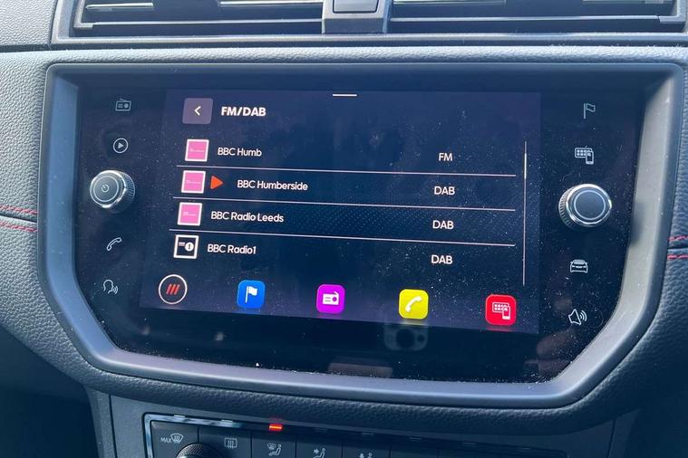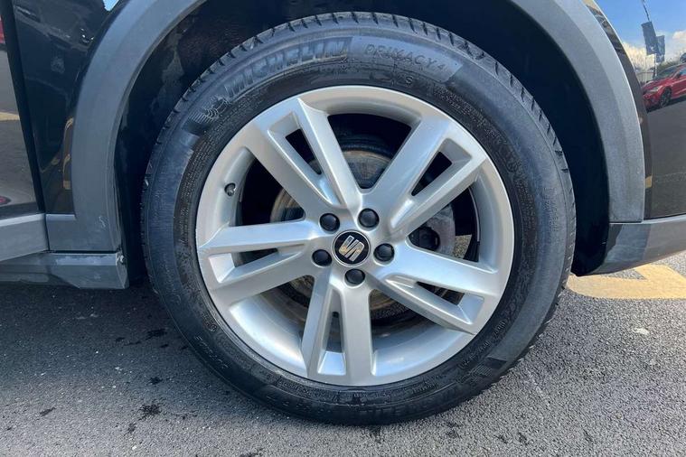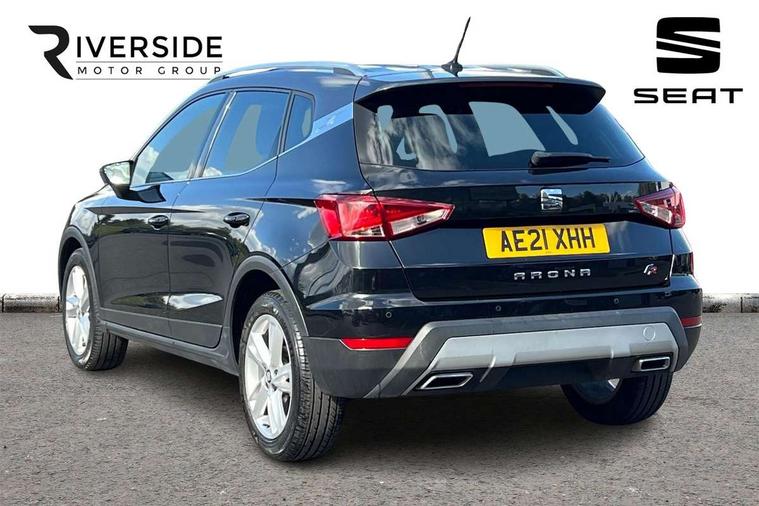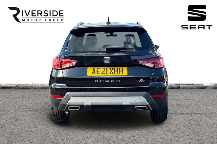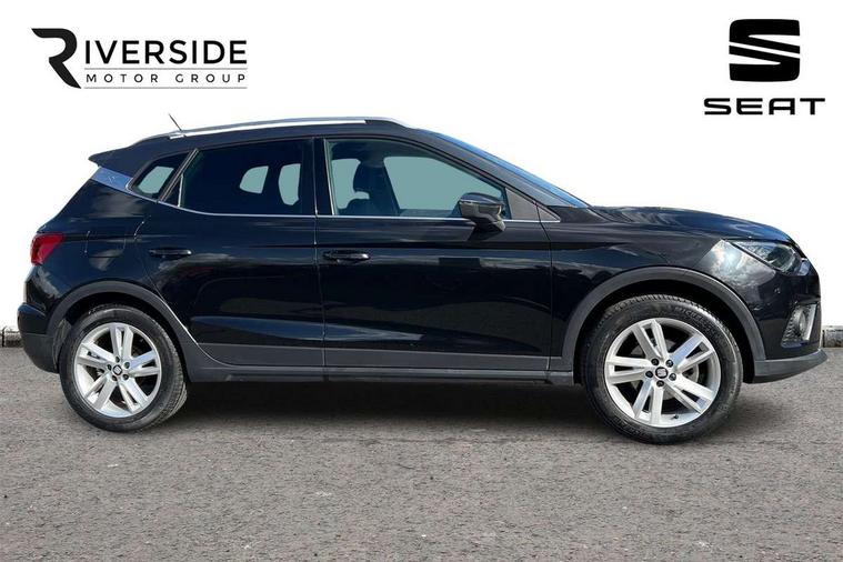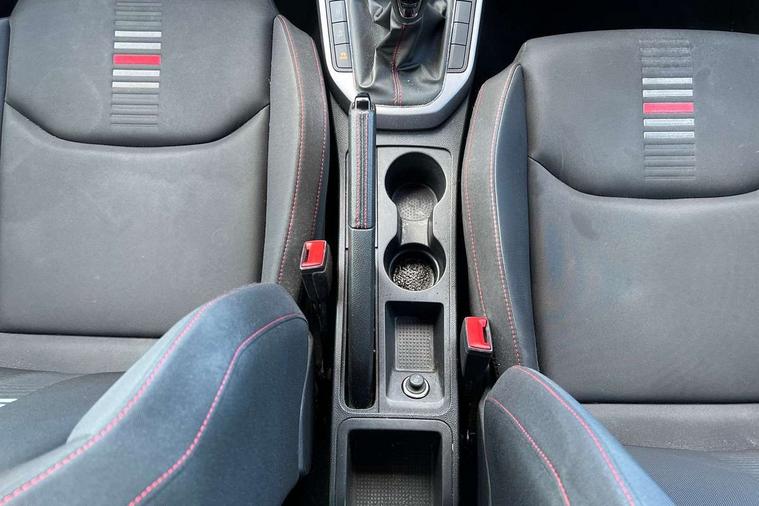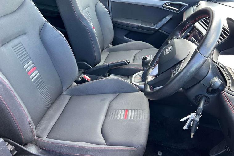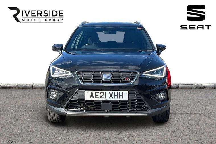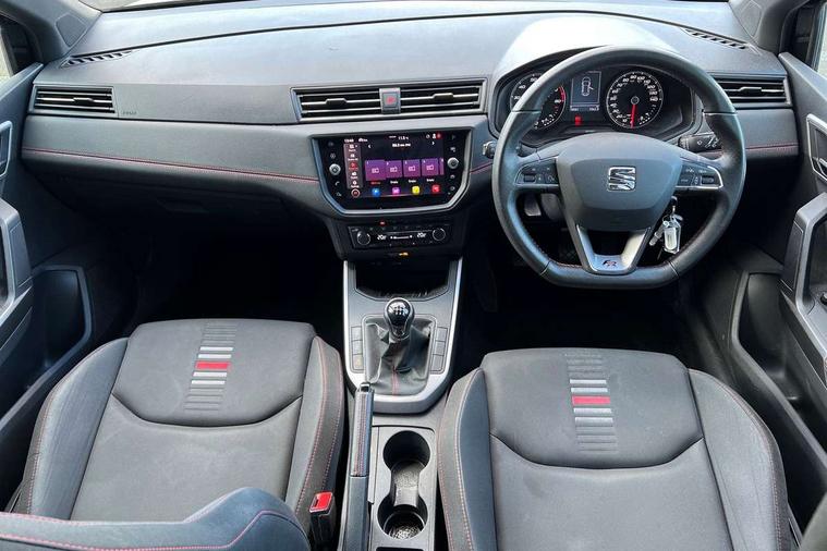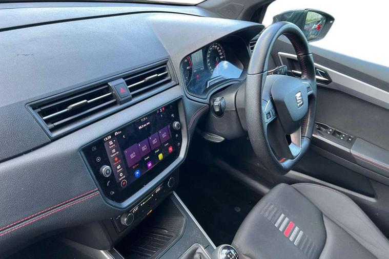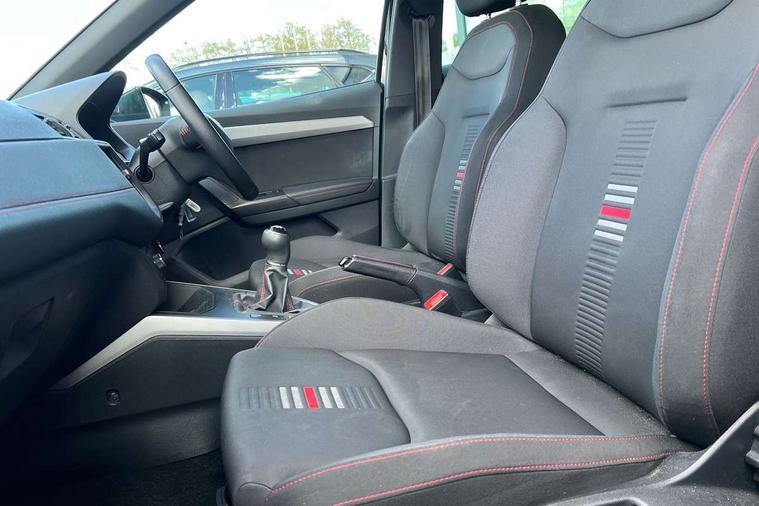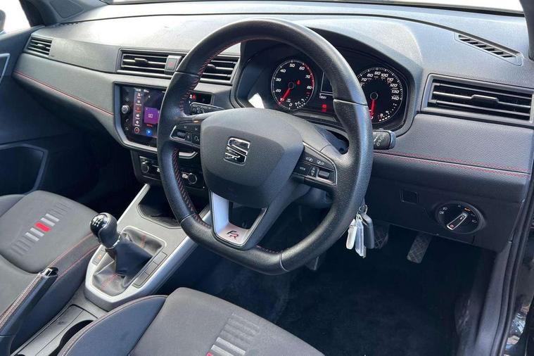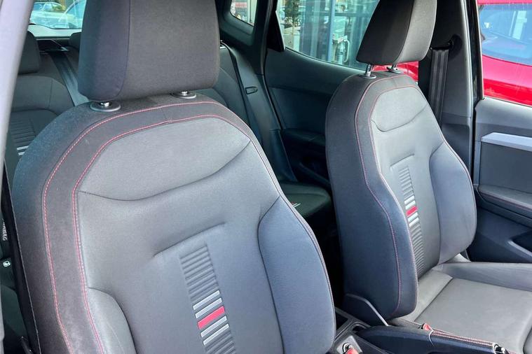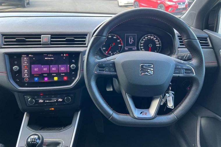 Interior chrome line trim, Leatherette dashboard, Connectivity pack plus - Arona, Interior chrome pack - Arona, 17" Dynamic alloy wheels, 2 folding remote keys with window open/close function, Alarm with back-up horn, Electronic engine immobiliser, Locking wheel bolts, Remote central locking + deadlocks, Tow away protection, 6 speakers, Bluetooth interface for hands free and audio streaming, DAB digital radio and AM/FM radio, Steering wheel mounted audio controls, 3 point seatbelts on all rear seats, ABS, Active front headrests, Child locks on rear doors, Driver and front passenger airbags with front passenger airbag de activation, front side and curtain airbags, Electronic stability control, Emergency Brake Assist (EBA) and front assist, Front and rear seatbelt reminder, Hill hold control, Multi-Collision braking, Tiredness recognition system, Traction control, Tyre pressure monitoring system, Anti theft roof antenna, Auto dimming interior rear view mirror, Automatic activation of hazard warning lights, Automatic headlights, Body coloured bumpers, Body coloured door handle inserts, Chrome front grille frame, Chrome roof rails, Chrome window trim, Coming/leaving home lighting function, Dark tinted rear windows, Electric front/rear windows with one touch/auto up/down, Electrically adjustable, heated and folding door mirrors, Full LED headlights dipped and mainbeam + front and rear fog lights, LED daytime running lights, LED rear tail lights and licence plate lights, Protective side mouldings, Rain sensing wipers, Rear window wash/wipe, Roof colour door mirrors, Twin exhaust pipe styling hidden exhaust pipe, Visible VIN plate, Windshield wiper with intermittent control and potentiometer, 2 cupholders, 60/40 split folding rear seat, Aircare filter, Black interior roof, Double boot floor, Driver sunvisor with covered mirror + card holder, Dual zone climate control, Front courtesy light with front reading lights, Front sport seats, Gear shift indicator, Height adjustable front seats, Height/reach adjustable steering column, Illuminated boot, Instrument lighting with brightness control, Interior light in footwell, central console and door panel, ISOFIX points in outer rear seats with top tether anchorage points, Multi-colour ambient interior lighting, Nora cloth upholstery, Passenger sunvisor with vanity mirror, Perforated flat bottomed leather steering wheel/gear knob/handbrake with red stitching and FR logo, Two front and three rear height adjustable headrests, 'Lights On' Reminder warning buzzer, Cruise control and speed limiter, Digital clock, Electric speed sensitive power steering, Full Link Smartphone Integration with Mirror Link, Apple Car Play, Google Android Auto with USB cable for Apple and Android compatibility, Low fuel warning light, Outside temperature display, Rear parking sensor, RPM counter, Seat connect with safety, service, remote and online, SEAT Drive profile - Four different models normal-sport-eco-individual, steering response, throttle response, Trip computer, Sports suspension,