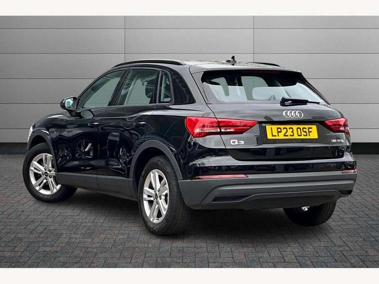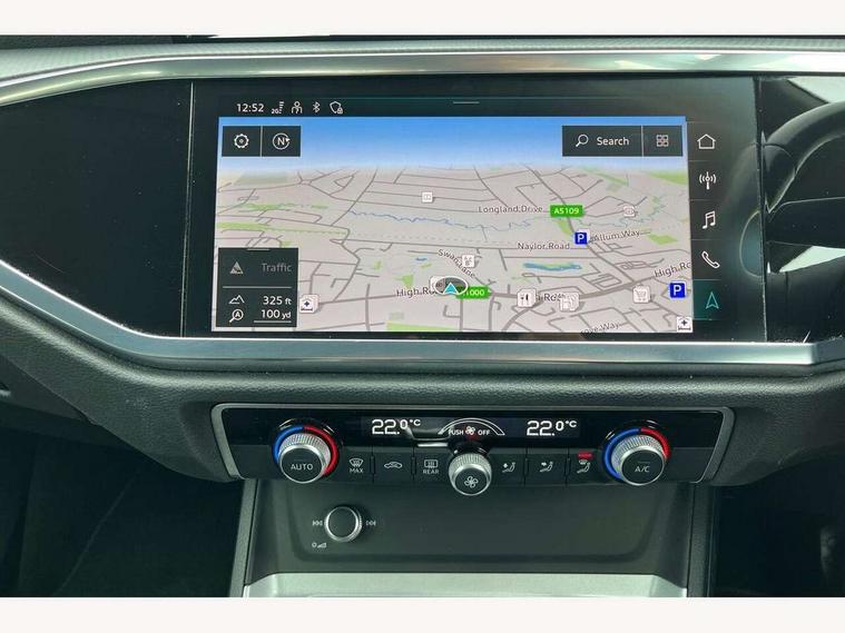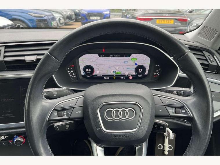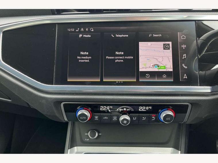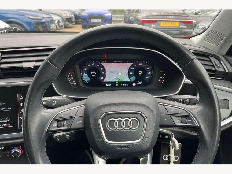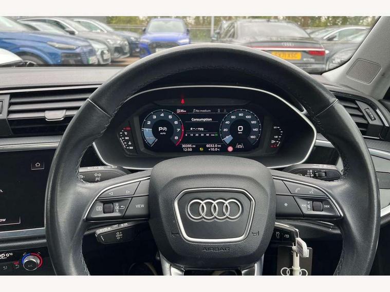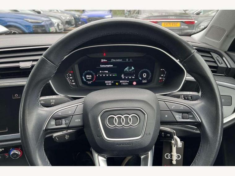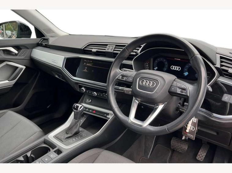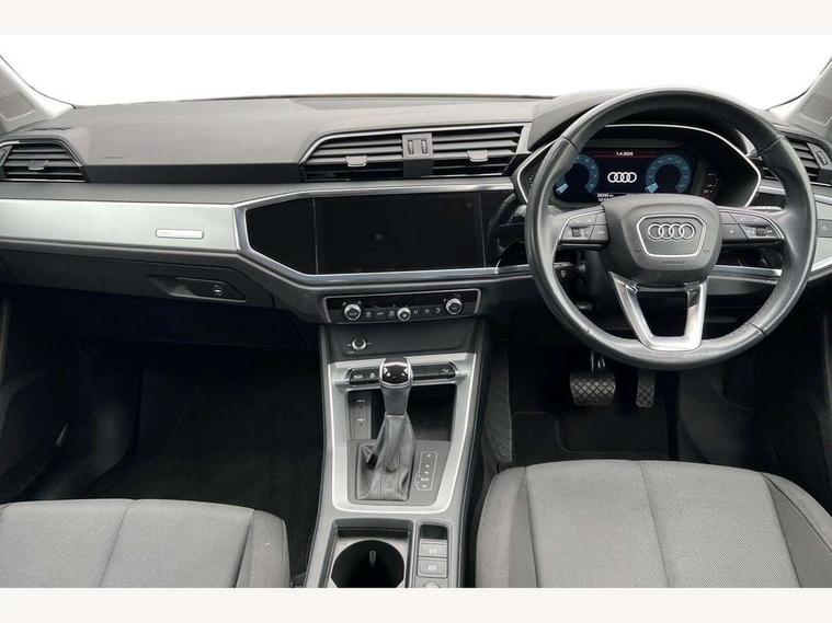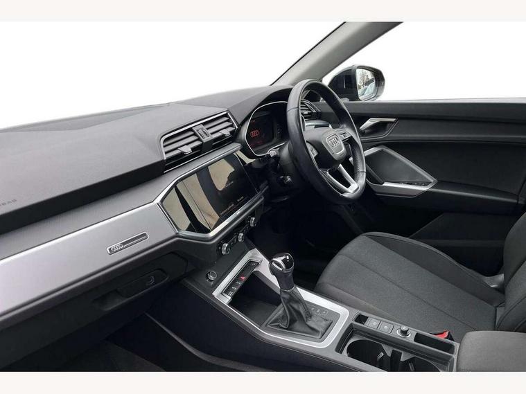 Amazon alexa Integration, Audi drive select, Audi lane departure warning, Audi smartphone interface includes wireless Apple carplay/Android Auto, Audi Virtual Cockpit - 10.25" display, Bluetooth interface, Camera based traffic sign recognition, Legal emergency call, MMI Navigation Plus with high resolution 10.1 inch touchscreen colour display, Power operated tailgate, Progressive steering, Service interval indicator, Start stop system with recuperation, Voice control system with natural language interaction, Standard suspension, 2 USB-C ports with charge and data functions, 6 passive loudspeakers, DAB digital radio module, Acoustic windscreen, Auto dimming frameless rear view mirror, Black roof rails, Body colour door mirrors, Diffuser in grained anthracite, Electrically folding, adjustable and heated door mirrors with integrated LED side indicators and kerb view function for passenger side, Exterior bumper with wheel arch trims and side sill trims in grained black matt, Front and rear electric windows, Grained radiator protective grille, Halogen rear lights, LED headlights with LED daytime running lights, Rain and light sensors, Rear side wing doors, Rear wiper, Third brake light, Variable front intermittent wipers, 12V socket in rear centre console, 3 seat bench in 2nd row, 3 spoke multi-function leather steering wheel, 40:20:40 folding with manual adjustment for 60:40 forwards/backwards position and backrest angle, Dual zone electronic climate control, Front and rear floor mats, Front and rear headrests, Front and rear roof module including reading lights, Front centre armrest, Glove compartment lighting, Height and reach adjustable steering wheel, ISOFIX child seat mounting for front passenger with airbag deactivation and outer rear seat including top tether attachment point for outer rear seats, Luggage compartment light, Lunar silver cloth headlining, Manual front seats with height adjustment, Single front passenger seat, Stainless steel luggage compartment sill finisher, Non smoking pack - Q3, 3x3 point rear seatbelts, 6 airbags - Driver, front passenger, curtain and side windows, Audi pre-sense front with pedestrain and cyclist recognition, Electrically operated child locks on rear doors, Electromechanical parking brake, Electronic stabilisation control including ABS, ASR and EDL, Front seatbelt reminder, Hill descent control, Hill hold assist, Pre sense basic, Seatbelt monitoring, Tyre pressure warning, Warning triangle and first aid kit, Anti theft alarm, Anti theft wheel bolts, Immobiliser, Remote central locking, Detail dashboard around MMI touch colour display in glass look, black with surround in aluminium look, Micrometallic silver inlay, 17" 5 twin spoke design alloy wheels,