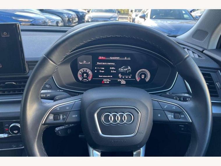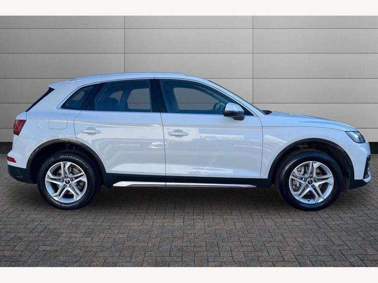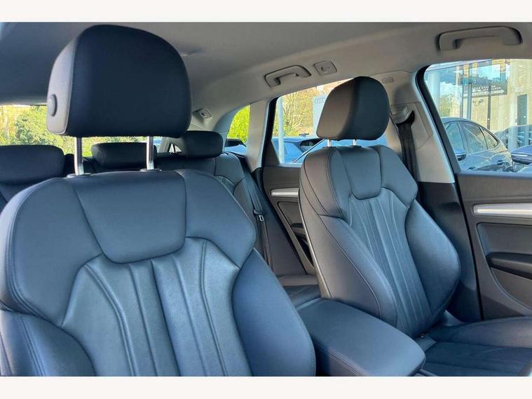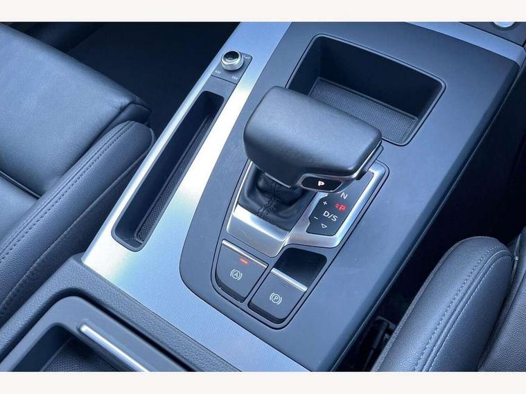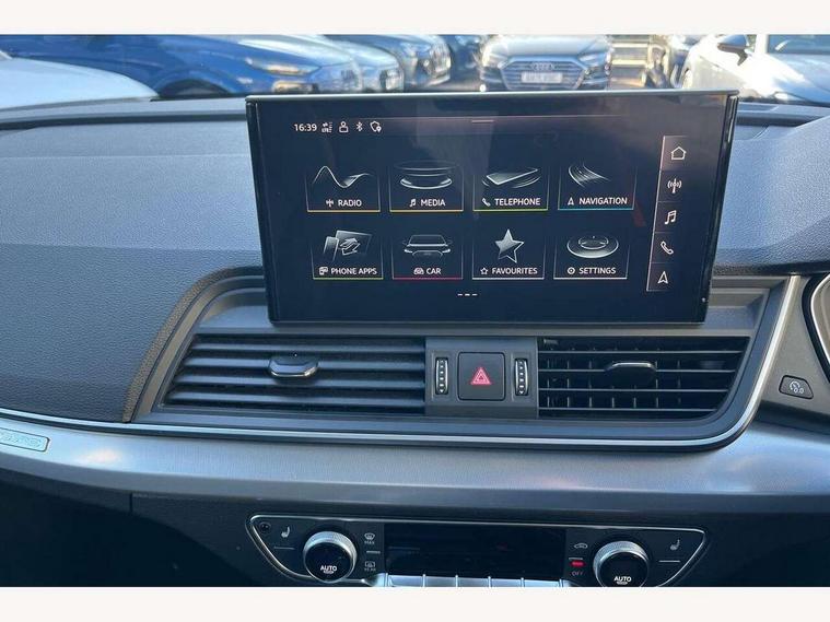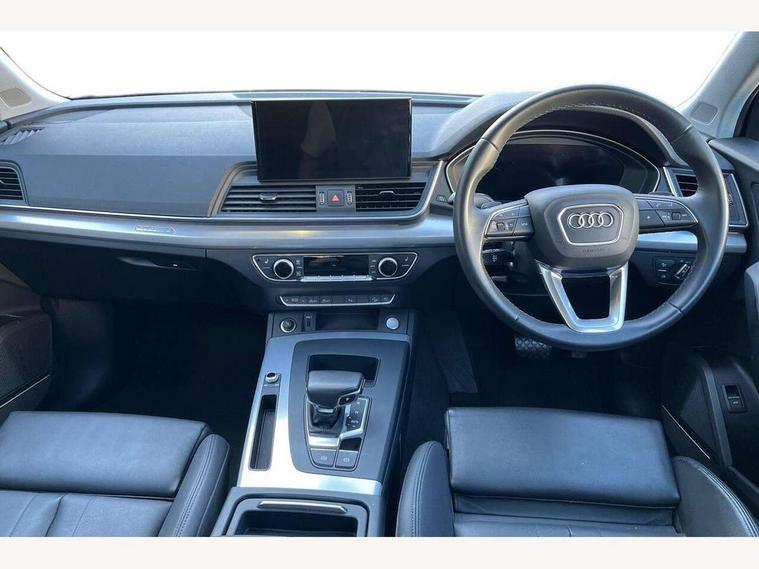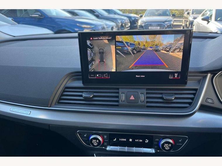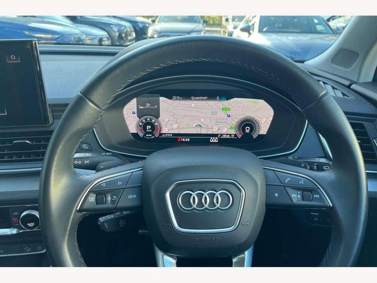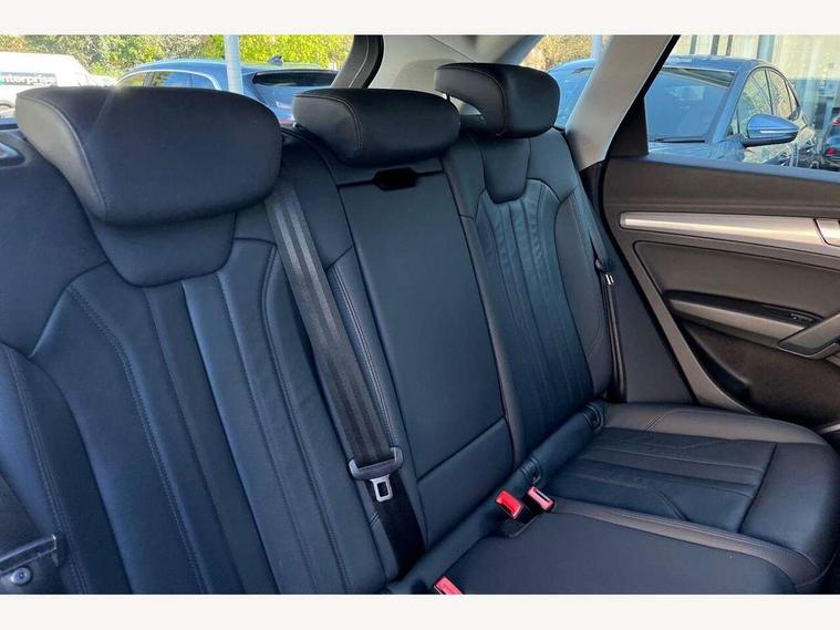 Acoustic front and rear parking sensor, Audi connect safety and service (e-call), Audi drive select, Audi virtual cockpit plus with 12.3" screen and three different layout designs, Audi wireless smartphone interface, Automatic start-stop system with coasting functionality and efficiency programme, Bluetooth interface, Camera based traffic sign recognition, Electro - mechanical power assisted steering, Lane departure warning, MMI navigation plus with 10.1" touch screen, Power tailgate, Reversing camera, Service interval indicator, Voice control system with Audi hotword activation "Hey Audi", Dynamic suspension, Quattro on demand, 2 x USB charging port with aux input socket, 8 loudspeakers, DAB Digital radio, Acoustic windscreen, Air inlets in matt anthracite black with blades in matt aluminium silver, Aluminium roof rails, Auto dimming door mirrors, Auto dimming frameless rear view mirror, Automatic headlight adjustment, Automatic headlights and windscreen wipers, Body colour bumpers, Body colour door mirrors, Chrome plated exhaust trims, Daytime running lights, Door sills in Selenite silver, Electric adjustable/heated/folding door mirrors, Front and rear electric windows, LED 3rd brake light, LED headlights and LED tail lights, Loading edge protection in stainless steel, Lower bumpers painted in contrast Manhattan grey, Matt selenite silver underbody protection, Matt twilight grey radiator grille with chrome vertical struts, Rear chrome trim strip below lights, Rear diffuser strip in selenite silver, Rear side wing doors, Rear spoiler, Rear wiper, Roof bars, 3 rear headrests, 3 spoke multifunction leather steering wheel with shift paddles, Comfort front centre armrest, Deluxe 3 zone electronic climate control, Door sills trims with aluminium inlays, Front head restraints, Front sport seats, Front/rear floor mats, Heated front seats, Height/reach adjustable steering column, Luggage compartment cover, Manual seat adjustment with 4-way electric lumbar support, Single front passenger seat, Split folding 3 seater rear seat bench in 3 parts (40/20/40), Sunvisors with vanity mirrors, Twin leather upholstery, High gloss pack - Q5, LED interior light pack - Q5, 3 point seatbelts on all seats, 6 airbags - Driver, front passenger, curtain and side airbags, Attention and drowsiness assist, Electrically operated child locks on rear doors, Electromechanical parking brake, Electronic stabilisation control including ABS, ASR and EDL, First aid kit with warning triangle and vests, Front passenger airbag deactivation, Hill descent control, Hill hold assist, ISOFIX child seat mounting for front passenger seat and ISOFIX child seat mounting with Top Tether for outer rear seats, Multi collision brake assist, Pop-up bonnet for pedestrian protection, Pre sense city, Seatbelt monitoring, Tyre pressure warning, Anti theft alarm, Anti-theft wheel bolts, Remote central locking, Remote control key with SAFELOCK and keyless go, Air vents inserts and centre console in matte black, Aluminium rhombus inlay, Tool kit, Tyre repair kit,