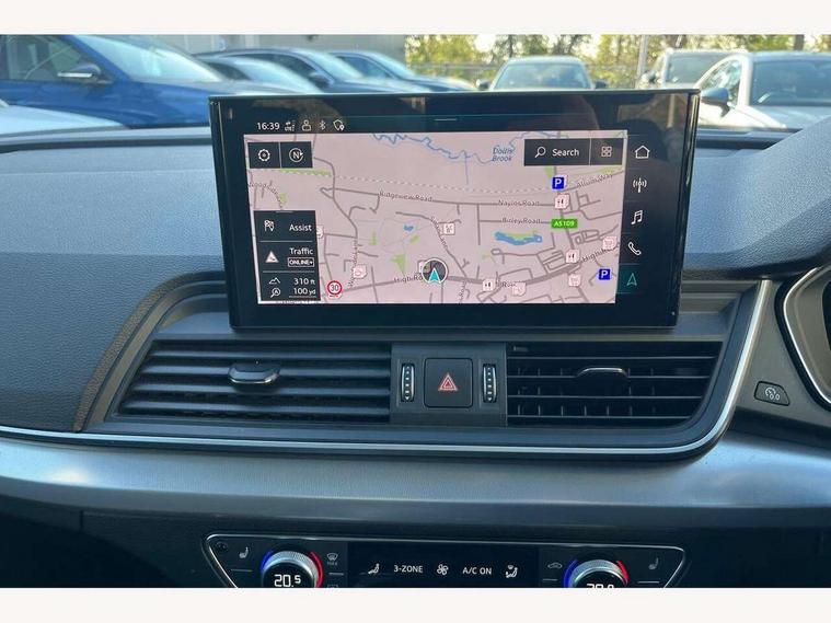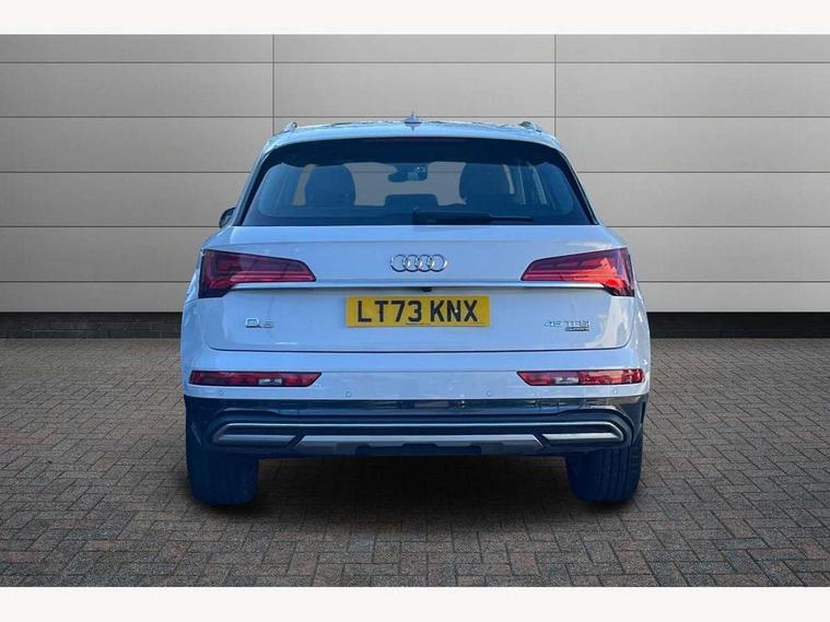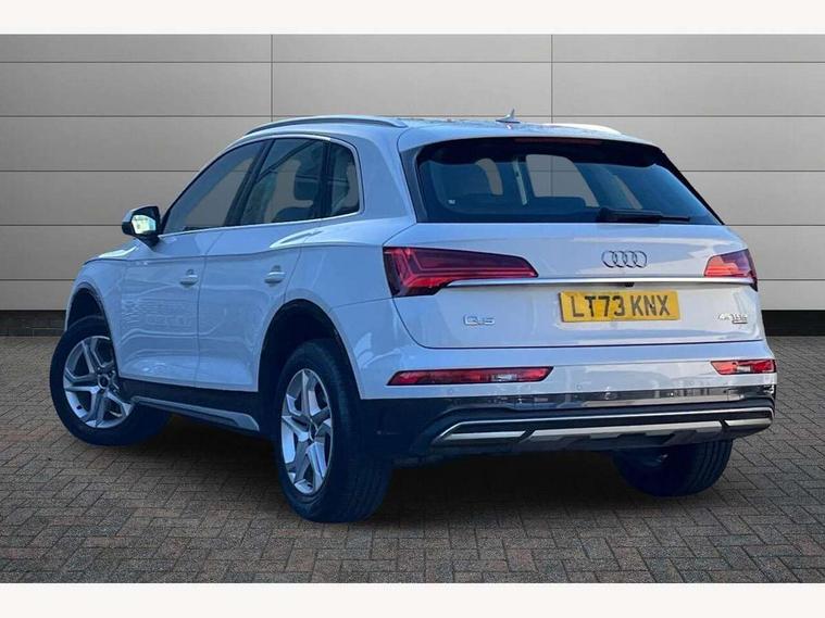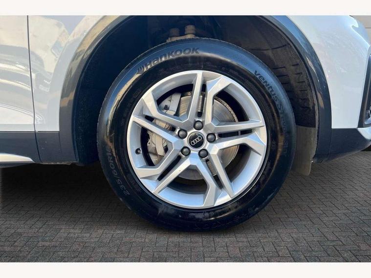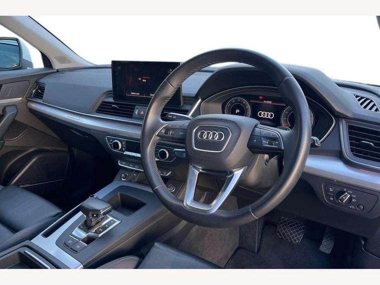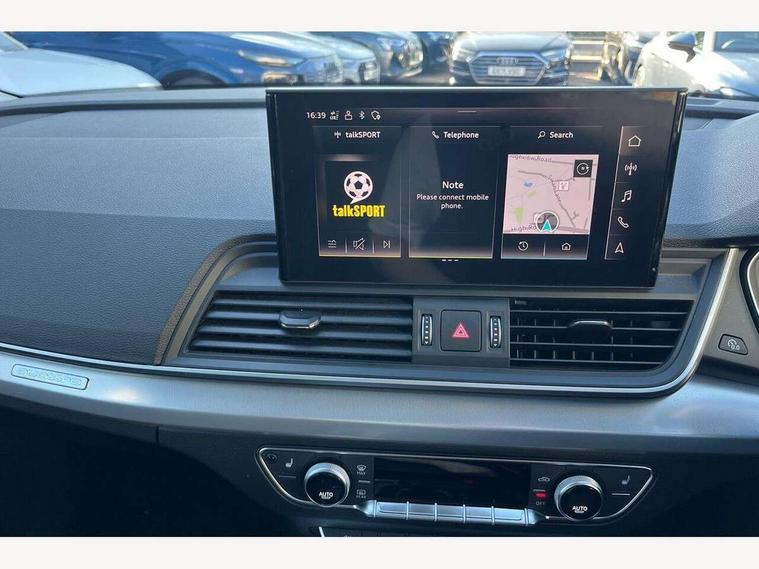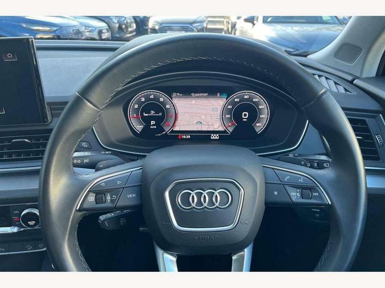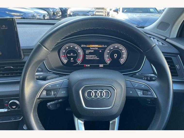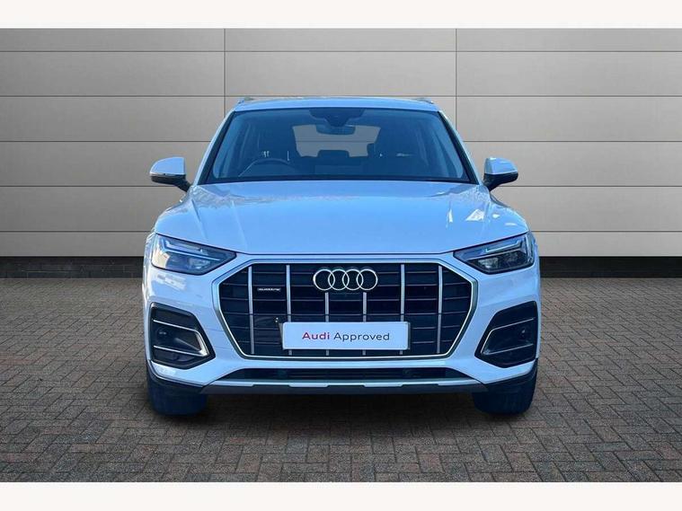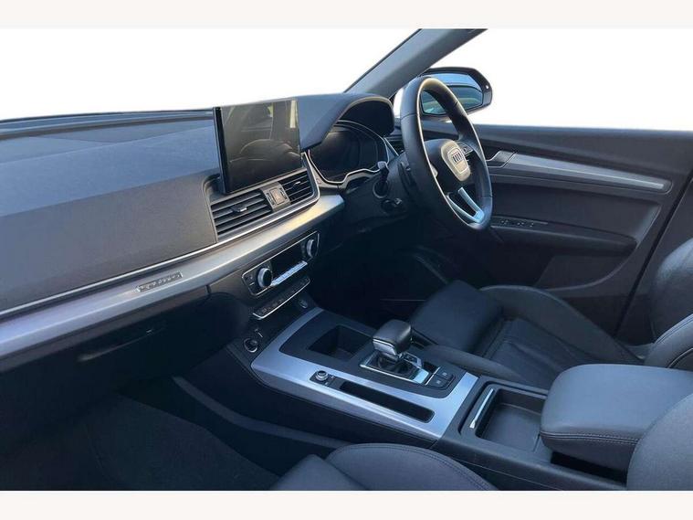 Acoustic front and rear parking sensor, Audi connect safety and service (e-call), Audi drive select, Audi virtual cockpit plus with 12.3" screen and three different layout designs, Audi wireless smartphone interface, Automatic start-stop system with coasting functionality and efficiency programme, Bluetooth interface, Camera based traffic sign recognition, Electro - mechanical power assisted steering, Lane departure warning, MMI navigation plus with 10.1" touch screen, Power tailgate, Reversing camera, Service interval indicator, Voice control system with Audi hotword activation "Hey Audi", Dynamic suspension, Quattro on demand, 2 x USB charging port with aux input socket, 8 loudspeakers, DAB Digital radio, Acoustic windscreen, Air inlets in matt anthracite black with blades in matt aluminium silver, Aluminium roof rails, Auto dimming door mirrors, Auto dimming frameless rear view mirror, Automatic headlight adjustment, Automatic headlights and windscreen wipers, Body colour bumpers, Body colour door mirrors, Chrome plated exhaust trims, Daytime running lights, Door sills in Selenite silver, Electric adjustable/heated/folding door mirrors, Front and rear electric windows, LED 3rd brake light, LED headlights and LED tail lights, Loading edge protection in stainless steel, Lower bumpers painted in contrast Manhattan grey, Matt selenite silver underbody protection, Matt twilight grey radiator grille with chrome vertical struts, Rear chrome trim strip below lights, Rear diffuser strip in selenite silver, Rear side wing doors, Rear spoiler, Rear wiper, Roof bars, 3 rear headrests, 3 spoke multifunction leather steering wheel with shift paddles, Comfort front centre armrest, Deluxe 3 zone electronic climate control, Door sills trims with aluminium inlays, Front head restraints, Front sport seats, Front/rear floor mats, Heated front seats, Height/reach adjustable steering column, Luggage compartment cover, Manual seat adjustment with 4-way electric lumbar support, Single front passenger seat, Split folding 3 seater rear seat bench in 3 parts (40/20/40), Sunvisors with vanity mirrors, Twin leather upholstery, High gloss pack - Q5, LED interior light pack - Q5, 3 point seatbelts on all seats, 6 airbags - Driver, front passenger, curtain and side airbags, Attention and drowsiness assist, Electrically operated child locks on rear doors, Electromechanical parking brake, Electronic stabilisation control including ABS, ASR and EDL, First aid kit with warning triangle and vests, Front passenger airbag deactivation, Hill descent control, Hill hold assist, ISOFIX child seat mounting for front passenger seat and ISOFIX child seat mounting with Top Tether for outer rear seats, Multi collision brake assist, Pop-up bonnet for pedestrian protection, Pre sense city, Seatbelt monitoring, Tyre pressure warning, Anti theft alarm, Anti-theft wheel bolts, Remote central locking, Remote control key with SAFELOCK and keyless go, Air vents inserts and centre console in matte black, Aluminium rhombus inlay, Tool kit, Tyre repair kit,