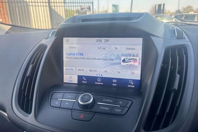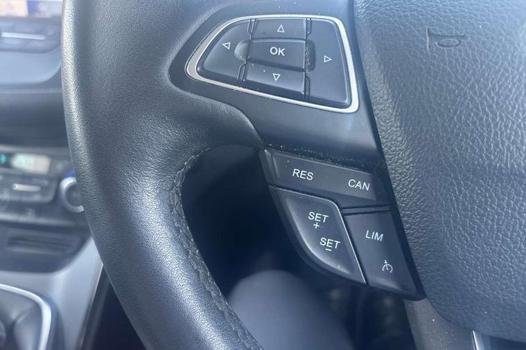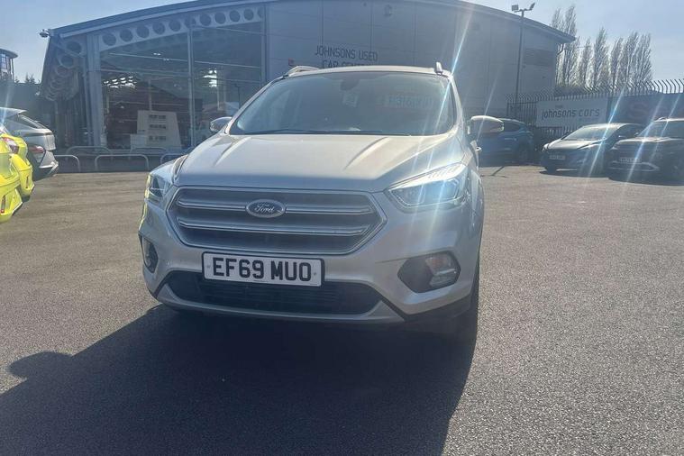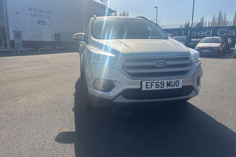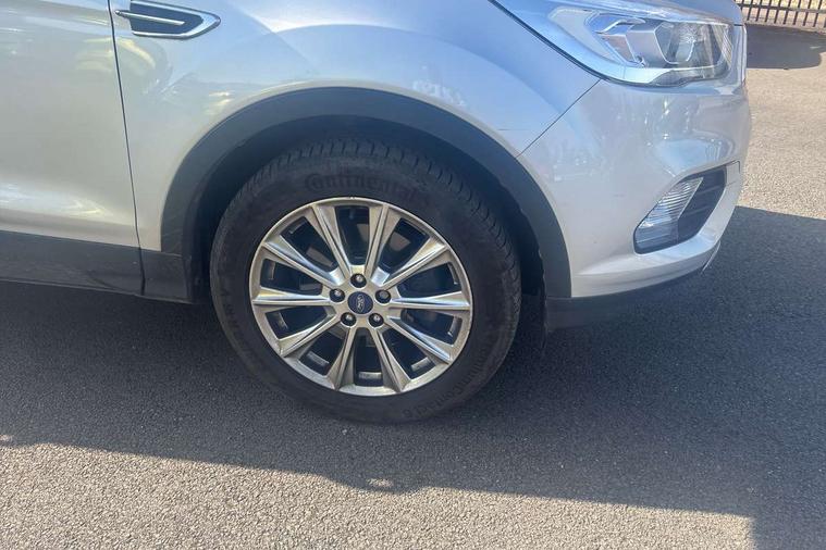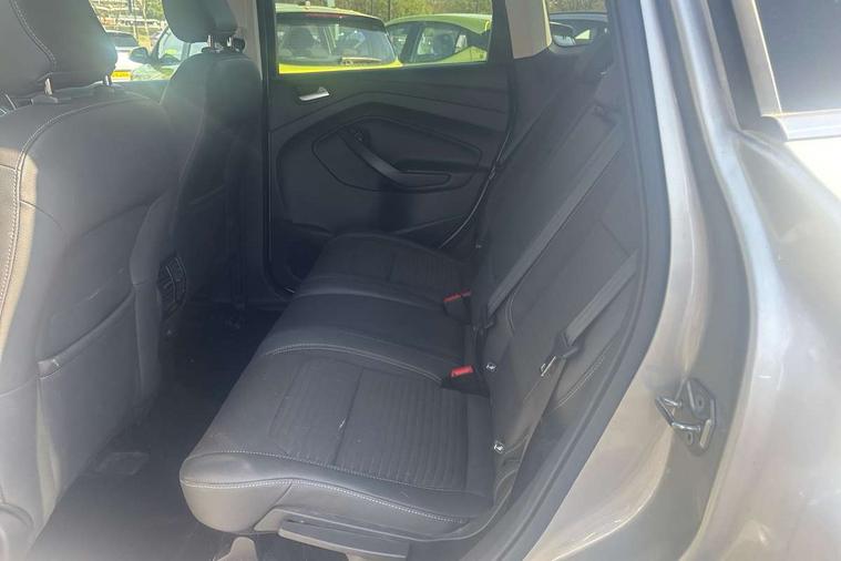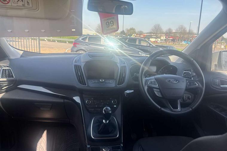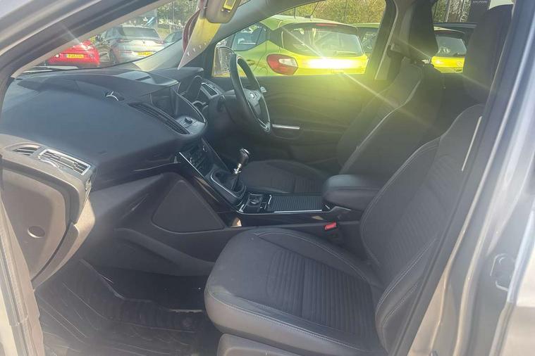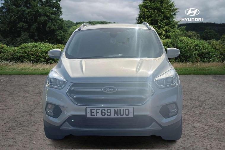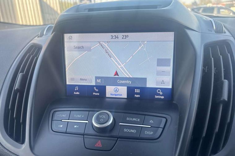Apple car play/Android Auto, EPAS, Hands free telephone, Trip computer, 2 USB ports, Auxiliary socket for external device, Remote audio controls on steering wheel, Auto dimming rear view mirror, Body colour bumpers, Body colour rear spoiler, Electrically operated and heated door mirrors with side indicators, Electrically operated front and rear windows with global closing, Front fog lights, Front scuff plate, Power folding door mirrors, Quickclear heated windscreen, Rain sensing wipers, Tailgate wash/wipe, Twin exhausts and rear diffuser, 6 way manually adjustable passenger seat with lumbar support, 60/40 split/folding rear back and cushion, Auxiliary power socket in luggage area, Centre console with stowage tray/bottle holder/CD stowage/front and rear 12V power point, Driver/passenger front seatback pockets, Dual electronic automatic temperature control, Folding rear centre armrest, Footwell courtesy lights front and rear, Front floor mats, Front head restraints, Front overhead courtesy lights with theatre style dimming and delay, Front/rear reading lights, Isofix system on outer rear seats, Leather steering wheel and gear knob, Multi-colour ambient interior lighting, Part leather upholstery, Reach + rake adjustable steering column, Rear floor mats, Rear head restraints, Sports style front seats, Stowage unit in upper instrument panel, Tie down hooks, Tonneau cover, Variable intensity instrument illumination, Appearance pack - Kuga, 3 point seatbelts on all 3 rear seats, ABS/EBD, Airbags - front driver/passenger, front & rear side, curtain, drivers knee, EBA, Electric traction assist system, Electronic Stability Programme, Front passenger airbag deactivation switch, Hill start assist, Intelligent Protection System (IPS), Tyre pressure monitoring system, Engine immobiliser, Keyless entry, Keyless start with 'Ford Power' starter button, Locking wheel nuts, MyKey system, Remote powered central double locking doors, Thatcham category 1 alarm, Mini steel spare wheel,