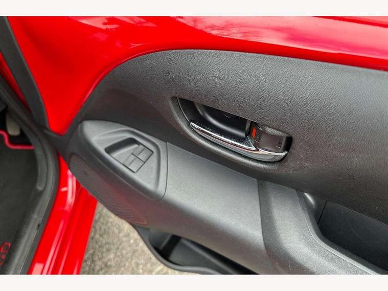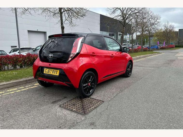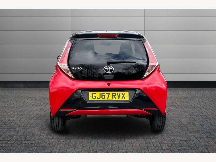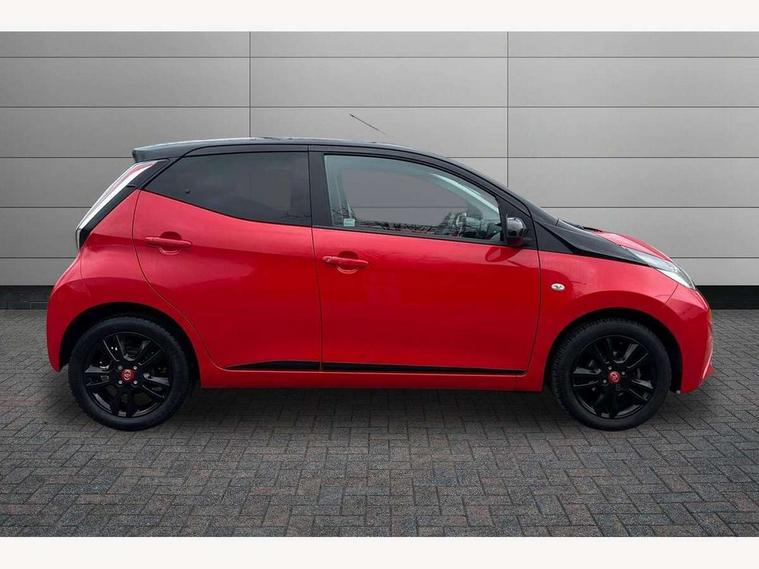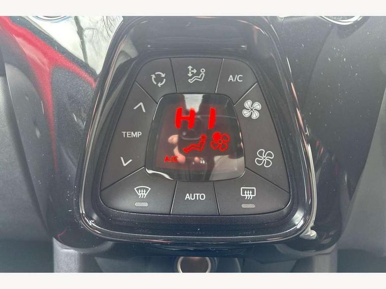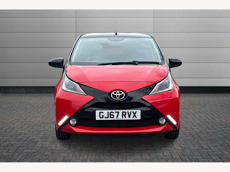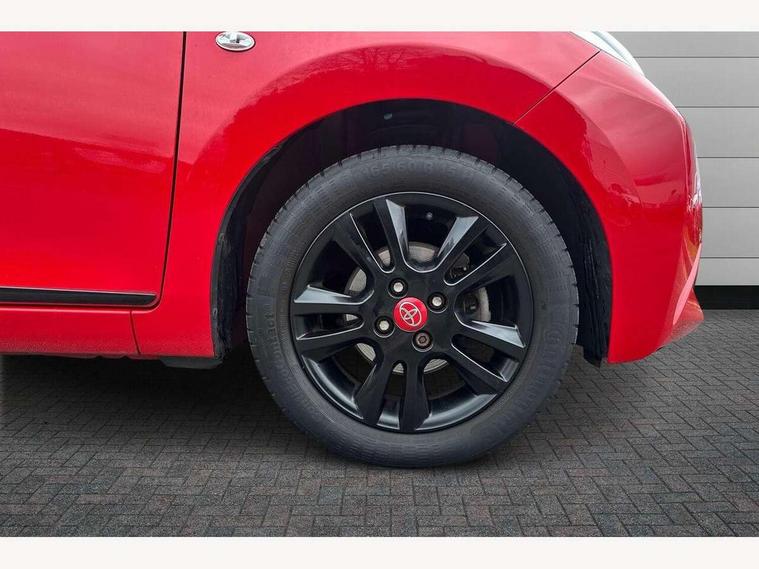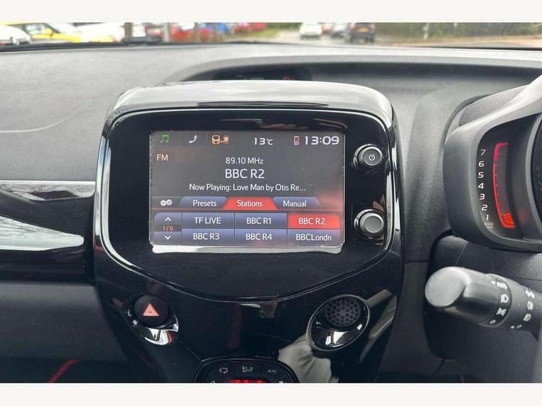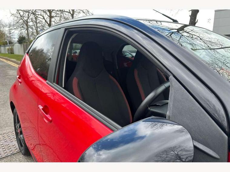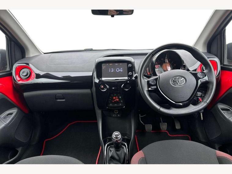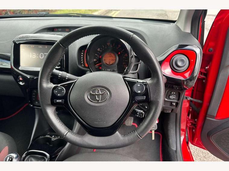 7" touch screen, Bluetooth system, Digital clock, Electric power steering, Fuel indicator with low level warning, Lights on warning, MirrorLink, Rear view camera, Speed limiter, Tachometer, Vehicle Stability Control (VSC), 4 speakers, Auxiliary input socket, DAB Digital radio, Multimedia System, Stereo radio, USB connection, 2 speed wipers/variable intermittent/mist function, Automatic headlights, Black front X, Body colour bumpers, Body colour door handles, Electric adjustable door mirrors, Electric front windows, Front fog lights, Gloss black door mirrors, Gloss black rear diffuser, Green tinted glass, Headlamp levelling, Heated door mirrors, Heated rear windscreen, LED daytime running lights, Rear spoiler, Rear window demister, Rear wiper, Roof mounted aerial, Special solid paint, 12V Accessory socket, 3 spoke leather steering wheel, 50/50 split folding rear seat, Air recirculation system, Auto air conditioning, Beam cloth upholstery, Carpet mats with red highlights, Centre console storage, Chrome insert to gearknob, Chrome interior door handles, Driver and passenger sunvisors, Driver's seat height adjuster, Driver/passenger seat recline/slide adjust, Driver/passenger vanity mirrors with covers, Front and rear door pockets, Front cupholder, Front map reading lights, Glossy black gear shift surround, Glovebox, Height adjustable front head restraints, Isofix system on outer rear seats, Leather gear knob, Pollen filter, Rear cupholders, Rear headrests, Steering wheel mounted radio/phone controls, Stepless tilt adjustable steering column, Storage bins on all doors, Tonneau cover, Outburst pack red pop - Aygo, ABS, Driver and passenger airbags, ESP, Fasten seatbelt reminder, Front side airbags, Height adjustable front seatbelts with pre-tensioners and load limiters, Hill start assist, Passenger airbag deactivate switch, Rear child proof door locks, Side curtain airbags, Tyre pressure warning, Engine immobiliser, Lockable fuel cap, Remote central locking, Gloss black centre console, Gloss black dashboard, Red air vent surround, Tyre repair kit,
