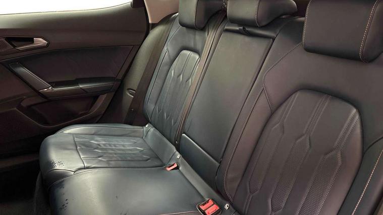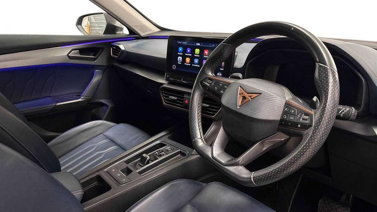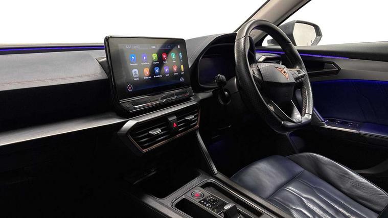 Digital cockpit and configurable dashboard, Driver alert system, Driving profile selection, E-call, Forward collision warning with automatic braking, Lane assist, Navigation system with 12'' Touchscreen Display, Park assist (inc front/rear parking sensors), PAS, Predictive adaptive cruise control with speed limiter, Rear view camera, RPM, trip computer, outside temp gauge, instrument light brightness, low fuel warning light, lights on reminder, gearshift indicator, Service interval indicator, Start/stop system with regenerative braking, Voice control system, Wireless apple carplay, Wireless phone charger, Electronic locking differential and dynamic traction support, Standard suspension, 2 front and 2 rear USB type C sockets, Auxiliary input socket, DAB radio, Auto dimming rear view mirror, Body colour door handles, Body coloured bumpers, Dark grey wing mirror, Daytime running light with automatic headlight control and coming home feature, Dynamic headlight range control, Electric front/rear windows, Electrically adjustable heated and folding door mirrors with memory function, Front fog lamps with cornering function, Gloss black roof rails and window surrounds, LED Headlights, LED Taillights with dynamic indicator, Rain sensing wipers, Rear diffuser with black simulated exhaust pipes, Rear side wing doors, Rear wash/wipe, Third brake light, Tinted rear windows, Welcome lights, 12v power supply in centre console, 12V socket, 12v socket in loadspace, 2 front and 2 rear reading lights, 230V socket, 3 seat bench in 2nd row, 60/40 split rear bench seat with armrest and mechanical seat release, Dust/pollen filter, Front and rear head restraints, Front centre armrest, Height/reach adjust steering wheel, Illuminated interior front door sills, Illuminated sunvisor with mirror, Isofix, Leather multi function heated steering wheel with gear shift paddles, Luggage tie-down hooks, Single front passenger seat, Three zone climate control with control panel in rear, Variable luggage/load compartment floor, Wraparound lighting, Genuine Nappa leather Pack - Cupra, 3 point seatbelts on all rear seats, ABS, Brake control system - ESC and brake booster, Child proof door locks, Driver and front passenger airbags with front passenger airbag de-activation, Electronic parking brake, Front and rear disc brakes, Front side curtain airbags, Hill hold control, Seat belt reminder for front and rear seats, Tyre pressure monitoring system, Anti theft alarm system, Keyless entry and start system (KESSY), Locking wheel bolts, Copper and aluminium interior detailing, 19" 'Exclusive' machined sport matte black and silver alloy wheels,