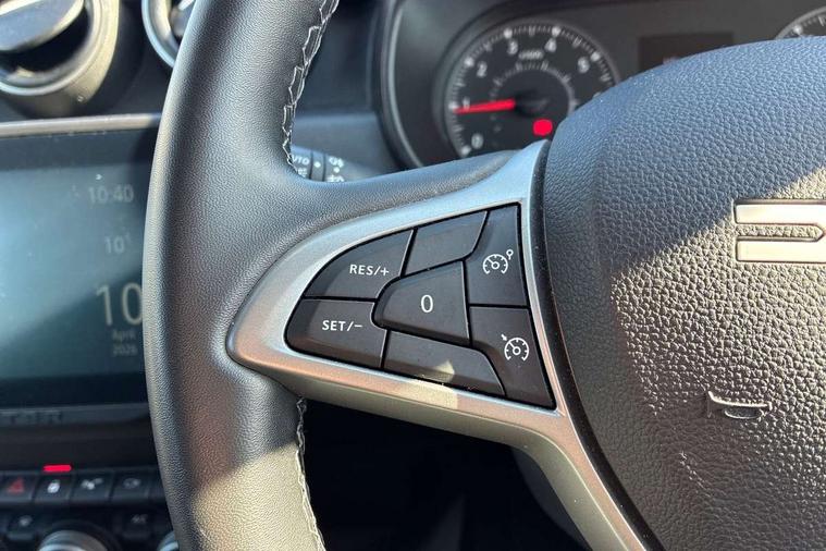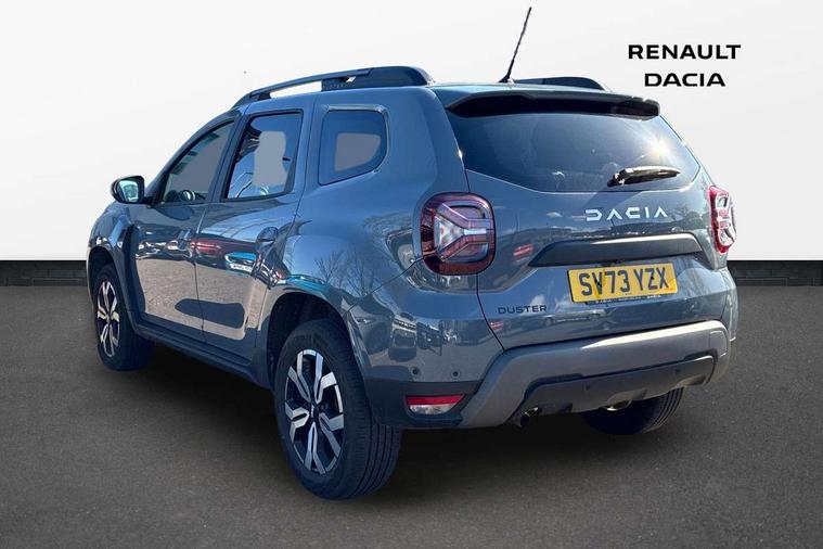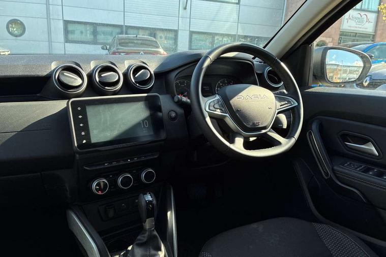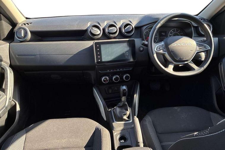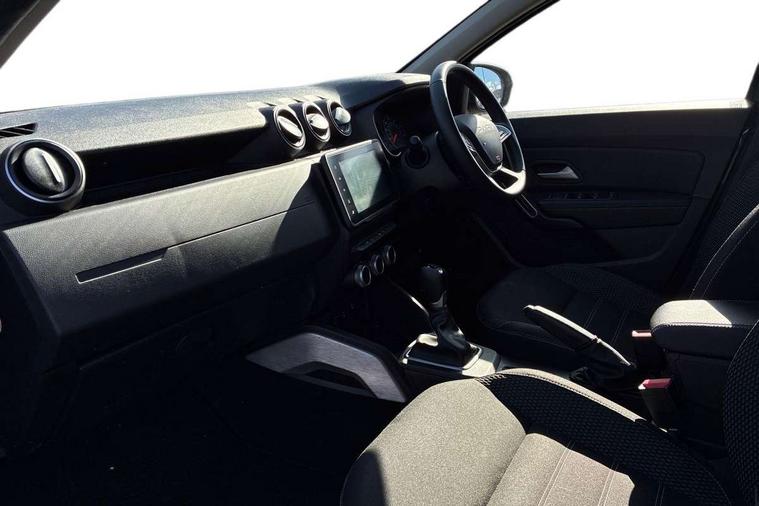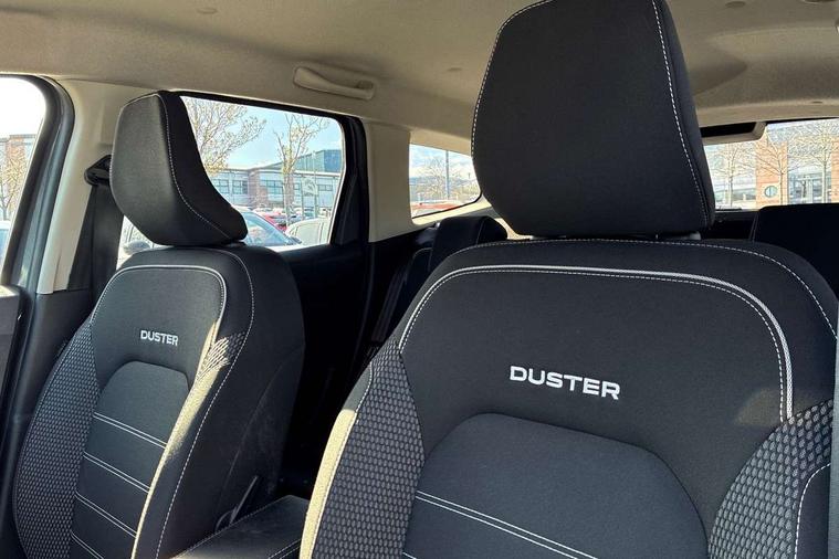 Blind spot warning, Cruise control and speed limiter, eCall emergency system, Eco mode, Electric power assisted steering, Multi view camera, On board computer, odometer, trip computer, average fuel consumption, average speed, service indicator, outside temperature gauge, Rear parking sensors, Rev counter, Reversing camera, Stop/start system, 8" Media Navigation with wireless smartphone replication, Dacia plug and radio/MP3/USB/bluetooth/DAB/steering wheel control, 3 speed windscreen wipers, Acoustic windshield, Automatic front wipers, Black side sills, Black/satin chrome tailgate trim with Duster inscription in black background and lettering, Body coloured door handles, Chrome front grille with hot stamping, Chrome logo surround on steering wheel, Dark glass on lateral rear windows, Daytime running lights, Drivers window one touch up/down, Dusk sensor, Electric adjustable/heated door mirrors, Electric folding door mirrors, Electric front windows, Electric rear windows, Front and rear body coloured bumpers, Front door sill protection strip, Front fog lights, Grey quartz longitudinal roof bars with Duster inscription, Heated rear window, High level third rear brake light, Modular roof bars, Rain sensor, Rear side wing doors, Rear spoiler, Rear wash/wipe, Satin chrome door mirrors, Underbody protection skid plates, Y shaped LED headlights with rear LED lights, 3 rear height adjustable headrests, 3 seat bench in 2nd row, 60/40 split folding rear seat, Automatic air conditioning, Backlighted steering wheel buttons, Boot light, Driver seat lumbar adjustment, Fabric decorative insert on door panels, Fabric upholstery, Front head restraints, Front passenger reading light, Gear shift indicator, Glovebox light, Heated seats, Height adjustable driver seat, Height adjustable front and rear headrests, Height and depth adjustable steering wheel, High centre console with driver armrest, Isofix points for child seats in both outer rear seats, Map pocket on front seat backs, Passenger sunvisor with vanity mirror, Rear passenger reading light, Satin chrome gear lever cap insert, Satin chrome interior door handles, Satin chrome lower steering wheel insert, Single front passenger seat, Soft feel leather steering wheel, 3x3 point rear seatbelts, ABS and Emergency brake assist, ASR traction control with Electronic stability control, Child locks on rear doors, Door open visual and audible warning, Driver airbag, Driver and passenger seatbelt not fastened - visual and audible warning, EBD - Electronic brakeforce distribution, Front passenger airbag, Front passenger airbag deactivation, Front seatbelt pretensioners, Front side airbags, Height adjustable front seatbelts, Hill start assist, Tyre pressure monitor, Keyless entry, Remote central locking, Thatcham approved engine immobiliser, Charcoal grey central console surround, Matt black central console fascia, Matt black decorative insert on rear door panels, Piano black decorative insert on front door panels, Satin chrome air vent surround, Satin chrome instrument dial surrounds, 17" Alloy wheels,