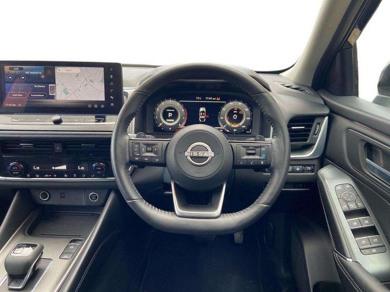 360 degree Intelligent around view monitor with moving object detection, Blind spot intervention, Blind spot warning, Drive assist custom mode, Drive modes (sport, normal, eco), Driver drowsiness and attention warning, Electric speed sensitive power steering, Emergency and breakdown call, Emergency lane keep assist, Emergency Stop Signal (ESS), Engine start/stop button, Event data recorder, Front and rear parking sensors, Full Digital 12.3" TFT Digital Combimeter, Google virtual personal assistance, Idle stop/start system, In-car WIFI hotspot, Intelligent Cruise control (ICC), Intelligent forward collision warning, Intelligent speed assist, Lane departure warning system, Nissan connect 12.3 inch touchscreen infotainment system, Nissan connect navigation with google maps, Nissan connect services 2.0 (Google Automotive System), Outside temperature sensor, Rear cross traffic alert, Reversing detection, Traffic jam pilot, Wireless Apple CarPlay/Android Auto, Wireless charging pad, Limited slip differential, 2 front USB-C ports, 2 rear USB-C ports, 6 speakers, AM/FM audio system with DAB, Bluetooth audio streaming, Auto rear wiper when reversing, Body colour mirror caps, Body coloured door handles, Bodyside mouldings, Chrome side window finisher, Electric auto folding door mirrors, Electrically adjustable and heated door mirrors with LED turn indicator, Follow me home headlights, High beam assist, Intelligent auto headlights, LED 3rd brake light, LED daytime running lights, LED Headlights, LED rear lights, One touch front and rear electric windows with remote opening and closing, One touch passenger window, Partially body coloured bumpers, Rear privacy glass, Rear roof spoiler, Rear side wing doors, Rear styling plate, Shark fin antenna, Splash free rain sensing wipers, Super UV and infrared cut glass, Three blink turn signal, 3 bench rear seats in 2nd row, 3 rear headrests, 60/40 split folding rear seat bench, Chrome interior door handles, Cloth upholstery, Dark headlining, Driver seat back pocket, Dual zone automatic climate control with pollen filter, Front door with bottle holders, Height adjustable front headrests, Luggage board system, Luggage space lighting, Multifunction steering wheel, Passenger seat back pocket, Rear door bottle holders, RGB ambient light (Full area coverage), Single front passenger seat, Smooth leather steering wheel, Steering wheel gearshift paddles, Tilt/telescopic adjustable steering wheel, Two rear isofix child seat anchorage points with top tether, 3x3 point rear seatbelt pretensioners + load limiters, Autonomous emergency braking, Child locks on rear doors, Curtain and front side, far side airbags, Driver and passenger airbags, Driver, passenger and 2nd row rear seat belt reminder, Electric handbrake with auto hold function, Front seatbelt pretensioners + load limiters, Height adjustable front seatbelts, Hill start assist, intelligent front emergency braking, Rear automatic braking, Tyre pressure monitoring system, Vehicle dynamic control, Engine immobiliser, Intelligent key with walk away lock and approach unlock functions, Remote central door locking with deadlocking, Thatcham alarm, 18" Diamond cut alloy wheels, Tyre puncture repair kit,
