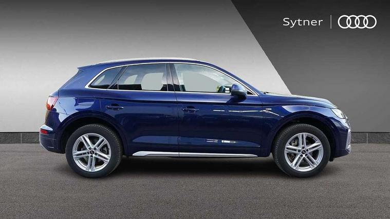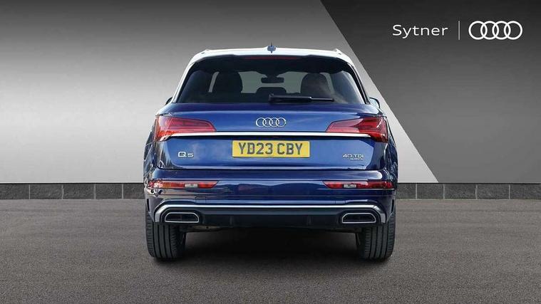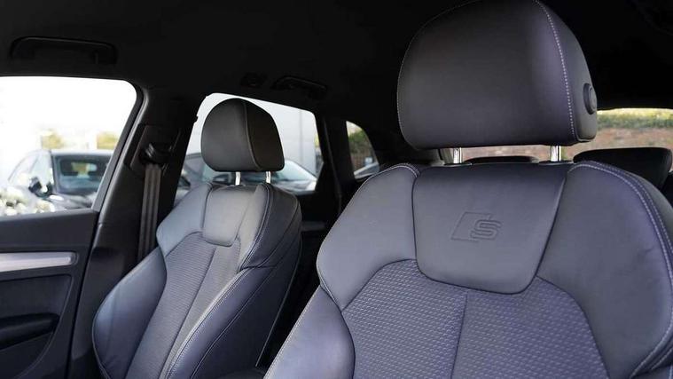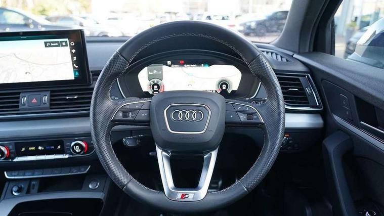 Acoustic front and rear parking sensor, Audi connect safety and service (e-call), Audi connect with Amazon Alexa Integration, Audi drive select, Audi virtual cockpit plus with 12.3" screen and three different layout designs, Audi wireless smartphone interface, Automatic start-stop system with coasting functionality and efficiency programme, Bluetooth interface, Electro - mechanical power assisted steering, MMI navigation plus with 10.1" touch screen, Power tailgate, Reversing camera, Service interval indicator, Voice control system with Audi hotword activation "Hey Audi", Diesel particulate filter, Quattro on demand, S line sports suspension, 2 x USB charging port with aux input socket, 8 loudspeakers, DAB Digital radio, Acoustic windscreen, Aluminium roof rails, Audi matrix LED headlights with dynamic front and rear indicators, Auto dimming door mirrors, Auto dimming frameless rear view mirror, Automatic headlight adjustment, Automatic headlights and windscreen wipers, Body colour bumpers, Body colour door mirrors, Body colour rear diffuser with matt aluminium silver surrounds, Body colour underbody protection, Chrome plated exhaust trims, Daytime running lights, Door sills in Selenite silver, Electric adjustable/heated/folding door mirrors, Front air inlet surrounds in aluminium, Front and rear electric windows, Front radiator grille in honeycomb design, Headlight washers, High level LED brake light, Lower bumpers painted in contrast Manhattan grey, Rear chrome trim strip below lights, Rear privacy glass and rear side windows, Rear side wing doors, Rear wiper, Roof bars, S Line badges on the front wings, S Line front and rear bumpers, S Line rear spoiler, S Line side skirts, 3 rear headrests, 3 spoke leather multifunction steering wheel with S badging perforated leather grips, 40:20:40 split folding 3 rear bench seat in 2nd row with rear centre armrest, Black cloth headlining, Comfort front centre armrest, Contrast stitching on seats, steering wheel and gear lever gaiter, Deluxe 3 zone electronic climate control, Front/rear floor mats, Gear lever in black leather, Heated front seats, Height adjustable front head restraints, Height/reach adjustable steering column, Illuminated door sill trims with S logo, Luggage compartment cover, Manual seat adjustment with 4-way electric lumbar support, Removable luggage compartment floor, Single front passenger seat, Stainless steel pedals, Sunvisors with vanity mirrors, High gloss pack - Q5, LED interior light pack - Q5, 3 point seatbelts on all seats, 6 airbags - Driver, front passenger, curtain and side airbags, Electrically operated child locks on rear doors, Electromechanical parking brake, Electronic stabilisation control including ABS, ASR and EDL, First aid kit with warning triangle and vests, Front passenger airbag deactivation, Hill descent control, Hill hold assist, ISOFIX child seat mounting for front passenger seat and ISOFIX child seat mounting with Top Tether for outer rear seats, Multi collision brake assist, Pop-up bonnet for pedestrian protection, Pre sense city, Seat belt force limiter, Seatbelt monitoring, Tyre pressure warning, Anti theft alarm, Anti-theft wheel bolts, Keyless Go access/ignition system, Remote central locking, Air vents inserts and centre console in gloss black, Matt brushed aluminium inlays,