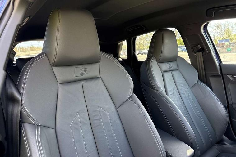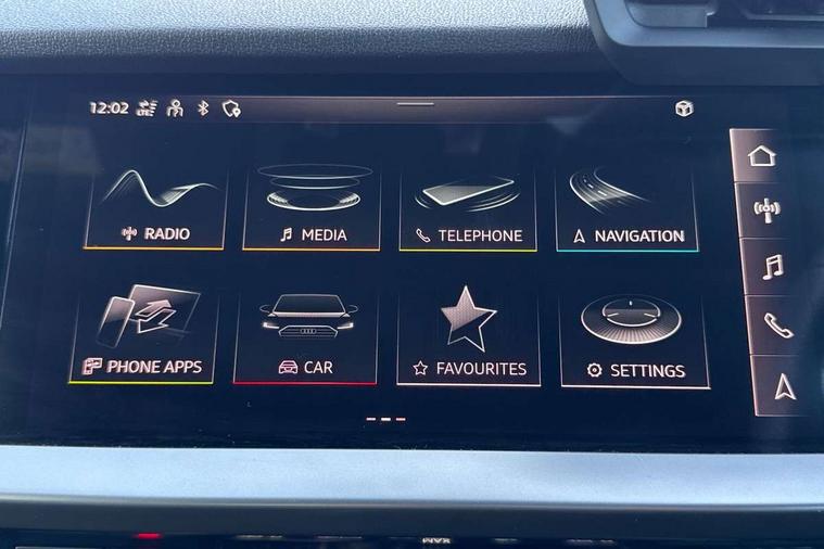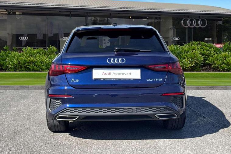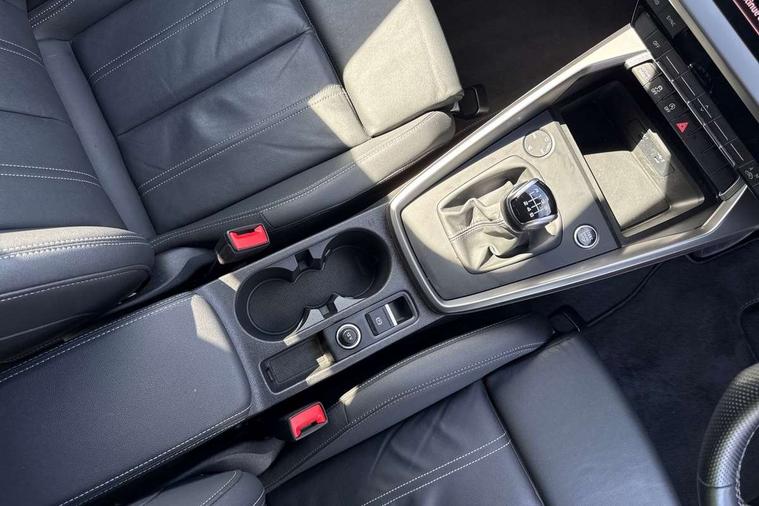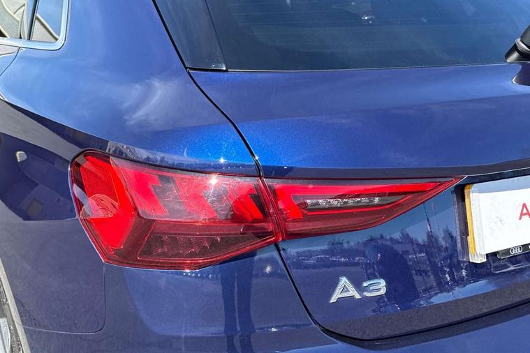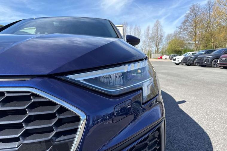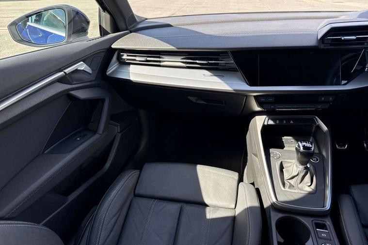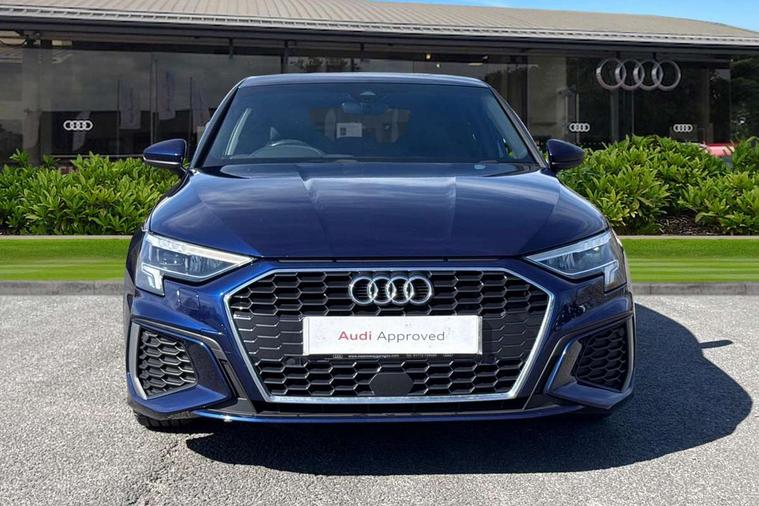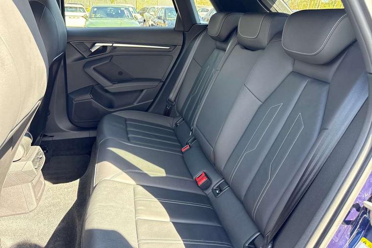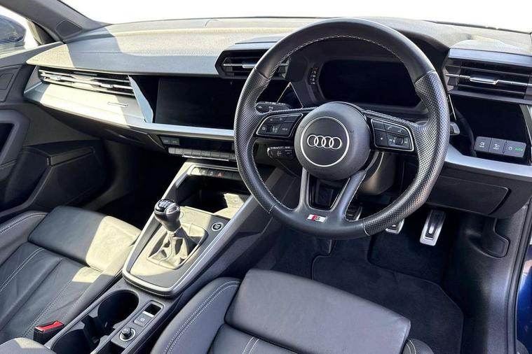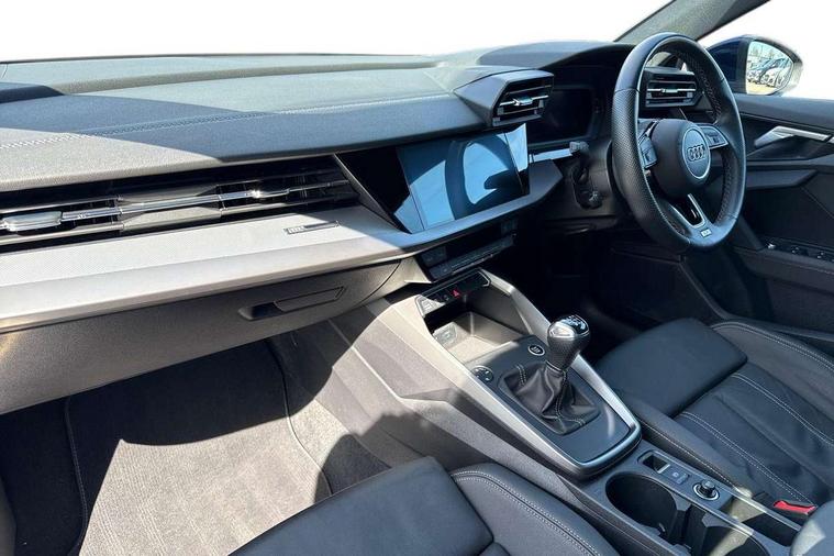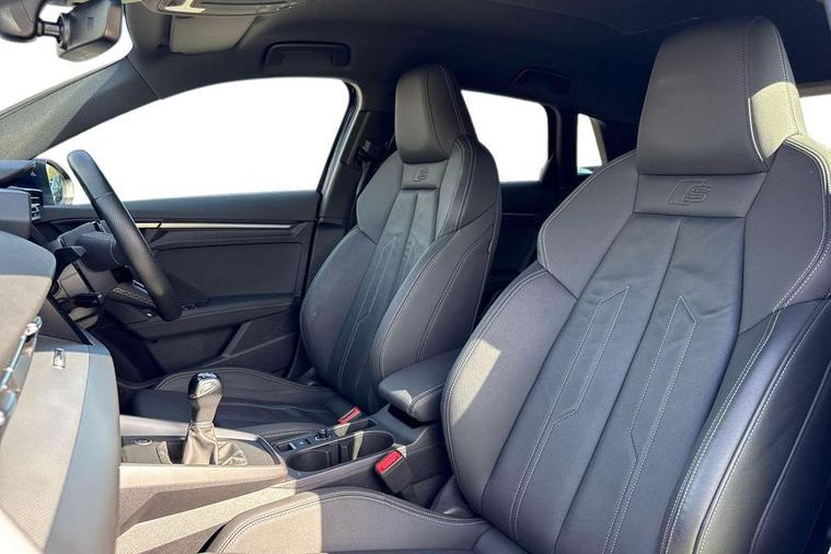 Audi drive select (Auto, Comfort, Dynamic and Individual), Audi smartphone interface, Audi Virtual Cockpit - 10.25" digital and colour instrument cluster, Automatic start/stop system with recuperation, Bluetooth interface, Camera based traffic sign recognition, Collision avoidance assistant, Cruise control, e-Call (emergency call), Electromechanical power speed sensitive steering, Lane departure warning system, MMI Navigation Plus with high resolution 10.1" colour touch screen display, Rear parking sensors, Service indicator, Trip computer, Voice control system with natural language interaction, Sports suspension, 2xUSB-C connection with data and charging functions, 6 passive loudspeakers, DAB Digital radio, 3rd brake light, Acoustic glass windscreen, Aluminium window trim, Auto dimming frameless rear view mirror, Body colour exterior mirrors, Electrically adjustable/heated/folding/auto dimming door mirrors with integrated LED indications + kerb view function for passenger side, Front electric windows, Illuminated aluminium inserts front door sills with S logo, LED daytime running lights, LED headlights with LED rear lights and dynamic rear indicators, Light and rain sensors, Privacy glass - dark tinted rear window, rear door and side windows, Rear electric windows, Rear side air outlets in grained matt black, Rear side wing doors, Rear wiper, S line bumpers, S roof spoiler, 12V socket and storage compartment in front centre console, 3 seat bench in 2nd row, 3 spoke leather multifunction steering wheel, 4 way electrically adjustable lumbar support for driver and front passenger, 60/40 split folding rear seat bench, Black cloth headlining, Dual zone electronic climate control, Front and rear centre armrest in leather, Front and rear headrests, Front/rear floor mats, Height and reach adjustable steering wheel, Interior lighting - glove compartment light and right hand side, Luggage compartment floor covering, Manual boot compartment lid, Manually adjustable front seats, Seat side bolsters, Single front passenger seat, Stainless steel pedals and front footrest in black, Twin leather upholstery with front sports seats S embossed logo, Aluminium interior elements pack - A3 Sportback, LED interior lighting pack - A3 Sportback, S line styling pack - A3 Sportback, 3x3 point rear seat belts, Driver and front passenger airbag with passenger airbag deactivation, Electronic Stabilisation Control (ESC) including ABS, ASR and EDL, First aid kit with warning triangle and 2 safety vests, Front side airbags with head airbags and interaction airbag, Pre-sense front with pedestrian and cyclist detection, Seatbelt monitoring, Tyre pressure loss indicator, Anti theft alarm, Anti-theft wheel bolts, Electronically operated child lock, Immobiliser, Remote control central locking, Dark spectrum aluminium inlays, accent surfaces in the dashboard and centre console in platinum grey silk effect paint finish,