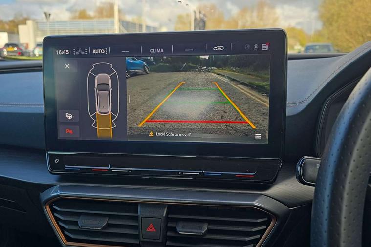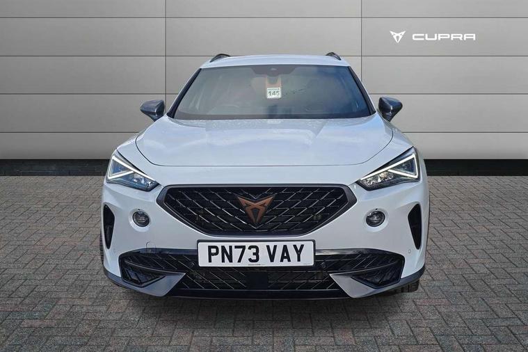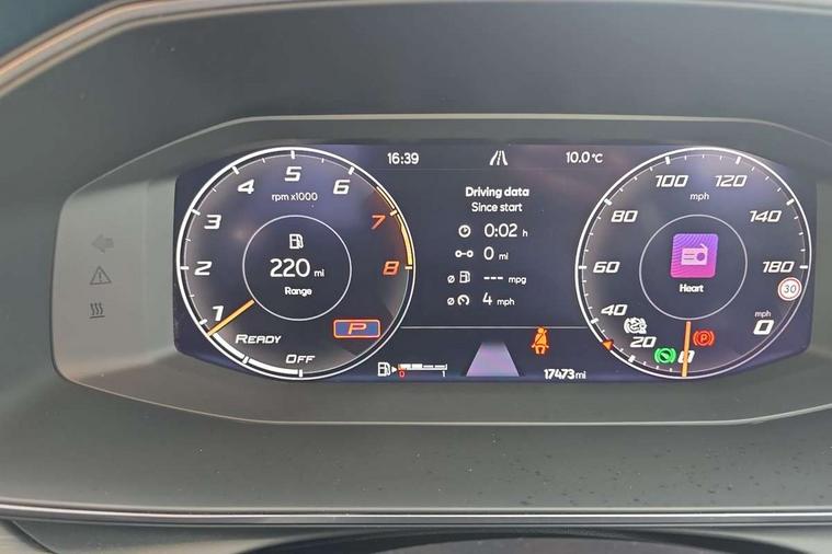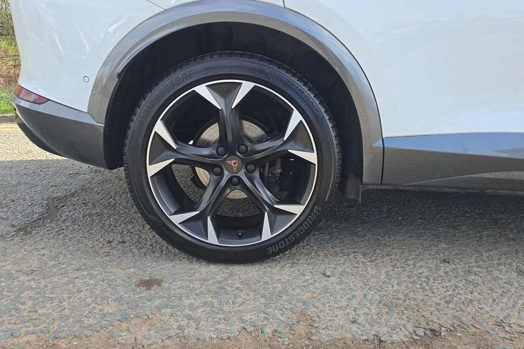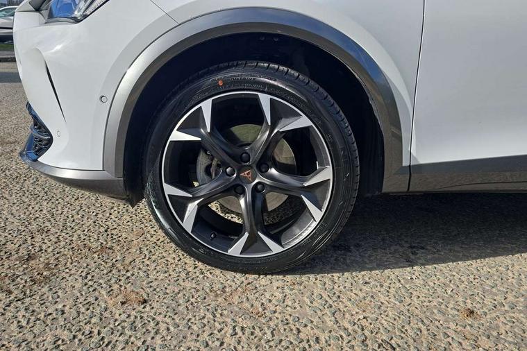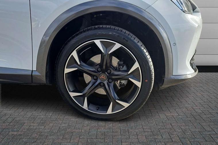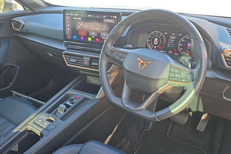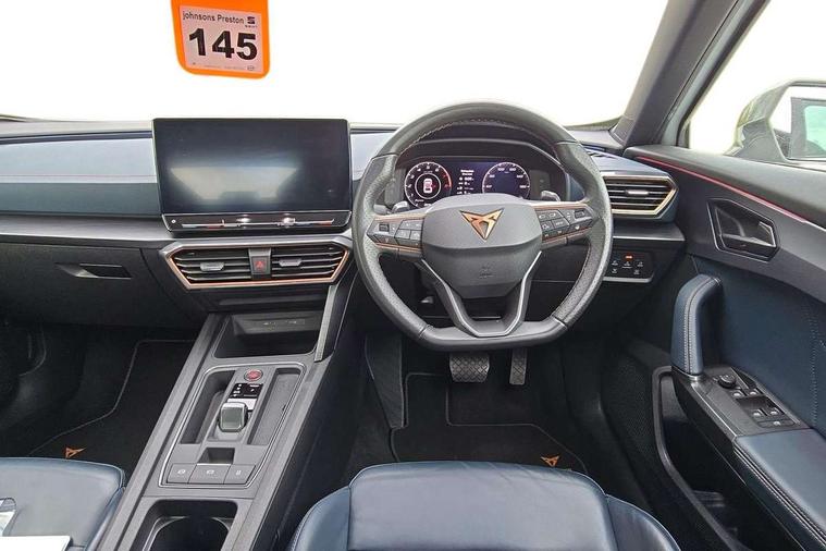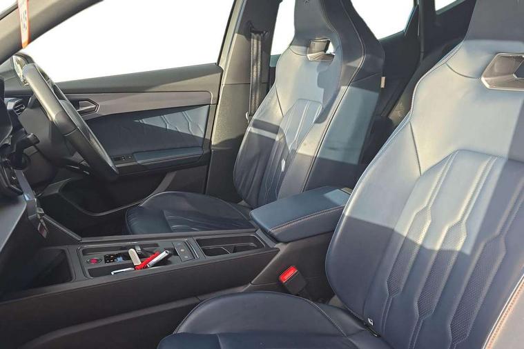 Digital cockpit and configurable dashboard, Driver alert system, Driving profile selection, Forward collision warning with automatic braking, Lane assist, Navigation system with 12'' Touchscreen Display, Park assist (inc front/rear parking sensors), PAS, Predictive adaptive cruise control with speed limiter, Rear view camera, RPM, trip computer, outside temp gauge, instrument light brightness, low fuel warning light, lights on reminder, gearshift indicator, Service interval indicator, Start/stop system with regenerative braking, Voice control system, Wired Android Auto, Wireless apple carplay, Wireless phone charger, Electronic locking differential and dynamic traction support, Standard suspension, 2 front and 2 rear USB type C sockets, Auxiliary input socket, DAB radio, Auto dimming rear view mirror, Body colour door handles, Body coloured bumpers, Dark grey wing mirror, Daytime running light with automatic headlight control and coming home feature, Dynamic headlight range control, Electric front/rear windows, Electrically adjustable heated and folding door mirrors with memory function, Front fog lamps with cornering function, Gloss black roof rails and window surrounds, LED Headlights, LED Taillights with dynamic indicator, Rain sensing wipers, Rear diffuser with black simulated exhaust pipes, Rear side wing doors, Rear wash/wipe, Third brake light, Tinted rear windows, Welcome lights, 12v power supply in centre console, 12V socket, 12v socket in loadspace, 2 front and 2 rear reading lights, 230V socket, 3 seat bench in 2nd row, 60/40 split rear bench seat with armrest and mechanical seat release, Black headlining, Dust/pollen filter, Front and rear head restraints, Front centre armrest, Height/reach adjust steering wheel, Illuminated interior front door sills, Illuminated sunvisor with mirror, Isofix, Leather multi function heated steering wheel with gear shift paddles, Luggage tie-down hooks, Single front passenger seat, Three zone climate control with control panel in rear, Variable luggage/load compartment floor, Wraparound lighting, Genuine Nappa leather Pack - Cupra, 3 point seatbelts on all rear seats, ABS, Brake control system - ESC and brake booster, Child proof door locks, Driver and front passenger airbags with front passenger airbag de-activation, Electronic parking brake, Front and rear disc brakes, Front side curtain airbags, Hill hold control, Public e-call, Seat belt reminder for front and rear seats, Tyre pressure monitoring system, Anti theft alarm system, Keyless entry and start system (KESSY), Locking wheel bolts, Copper and aluminium interior detailing, 19" 'Exclusive' machined sport matte black and silver alloy wheels,