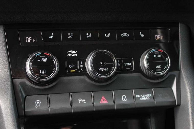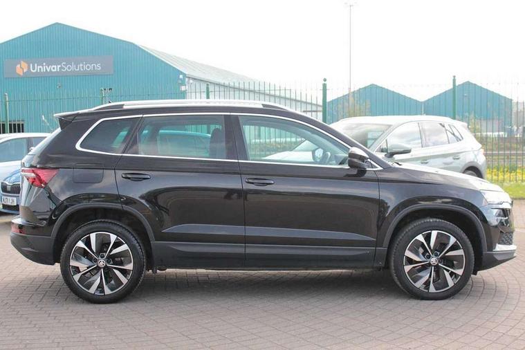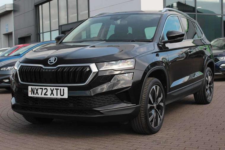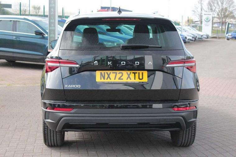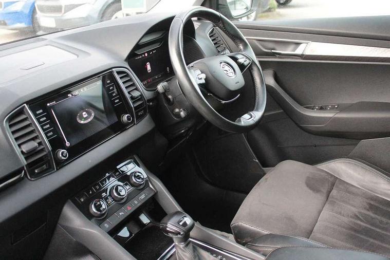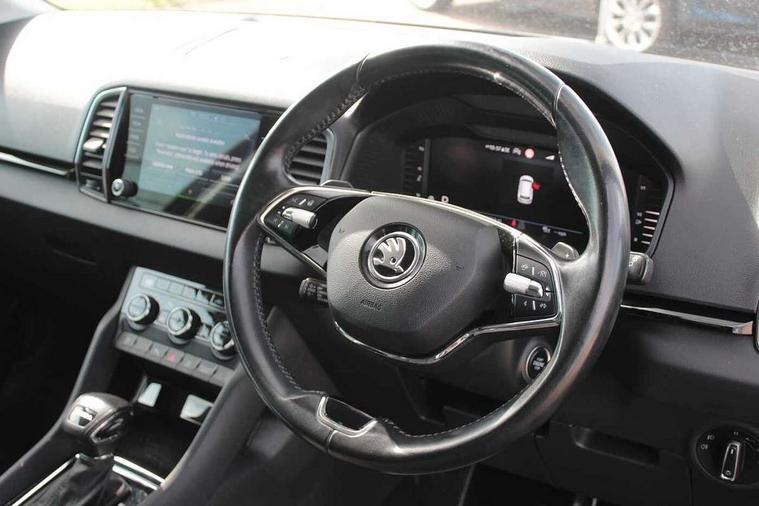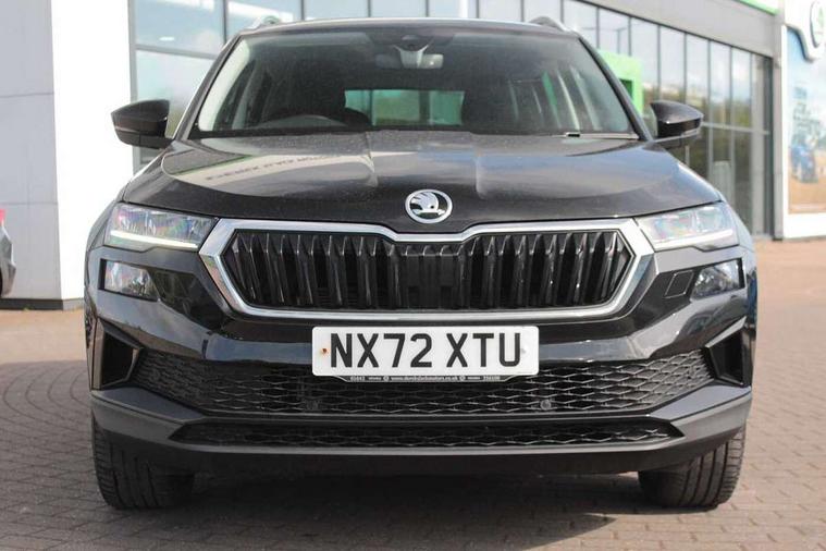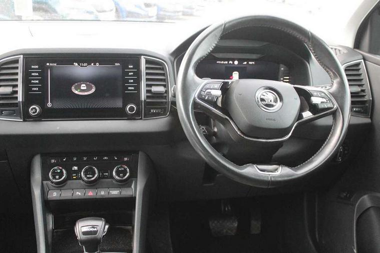 8" Digital display, Care connect, Colour multifunction trip computer, Driver fatigue sensor, Emergency services call system, Outside temperature gauge, Service interval indicator, SmartLink wireless for Apple and wired for Android, Start/stop system with regenerative braking, USB C Port x 2 in front centre console, 8 Speakers, DAB radio with Bluetooth, USB connection, Acoustic glass, Aero front windscreen wipers with intermittent function, Auto dimming rear view mirror with light and rain sensors, Automatic headlight control system, Black electric window control buttons, Body colour door mirrors and handles, Electric front and rear windows with child proof lock, Heated rear windscreen, LED daytime running lights, LED rear lights with high functionality welcome effect and dynamic indicators, Light assistant (coming/leaving home/tunnel light), Plastic scuff plates, Privacy glass, Rear side wing doors, Rear spoiler, Rear window wiper with washer system and intermittent control, Safety reflectors on front doors, 1.5 litre bottle holders in driver and front passenger door panels, 12V socket in boot, 12v socket in front centre armrest with storage compartment and rear air vents, 2 Folding hooks and nets in boot, 2 spoke leather heated multifunction steering wheel with DSG paddles, 2 x Tablet holder, 3 rear height adjustable headrests, 3 seat bench in 2nd row, 4 foldable roof handles with rear coat hooks, Black floor carpet, Chrome inner door handles, Decorative door sills with KAROQ badging, Double sided boot floor, Foldable hooks in the boot, Front head restraints, Height adjustable front three point seats belts with tensioners, Height/reach adjust steering wheel, Ice scraper, Illuminated glovebox, Illuminated luggage compartment, Isofix child seat preparation for front passenger seat, Isofix child seat preparation outer rear, Manual lumbar support for front seats, Pen holder, Pollen filter, Rear boot cover, Rear reading lights, Rubbish bin door, Safety vest holder, Single front passenger seat, Storage box in upper central dashboard closed, Sunvisors with illuminated vanity mirrors, Textile floor mats, Ticket holder, VarioFlex seats with standard rear seat release, Chrome roof rails + chrome pack - Karoq, Parking pack - Karoq, Automatic door unlocking in case of crash, Automatic fuel cut off in case of crash, Child locks on rear doors, Driver airbag, Electronic parking brake with auto hold function, Emergency rear braking signal, ESC including ABS, MSR, ASR, EDS, HBA, DSR, RBS, MKB and traction control, Front side airbags, Hill hold control, Knee airbags, Passenger airbag with switch-off function, Pedestrian monitor, Seatbelt reminder signalisation and pretensioner for all seats, Three point seatbelts rear, Two tone horn, Tyre pressure display, Tyre pressure monitor, Alarm with interior monitoring, back up horn and tilt sensor with safe function, Electronic engine immobiliser, Keyless entry and start/stop, Remote central locking with 2 remote folding keys, Chrome framed air vents, Anti-theft wheel bolts protection, Storage on wheel cover, Tool kit,