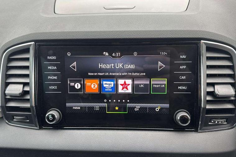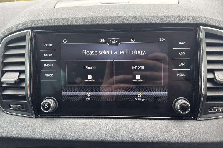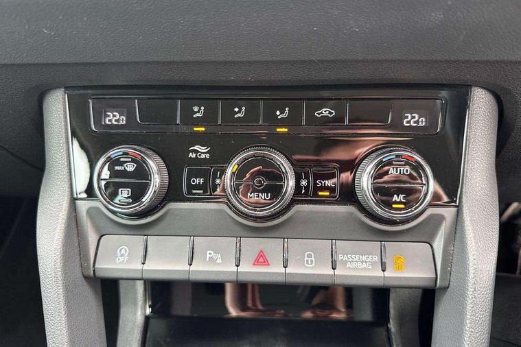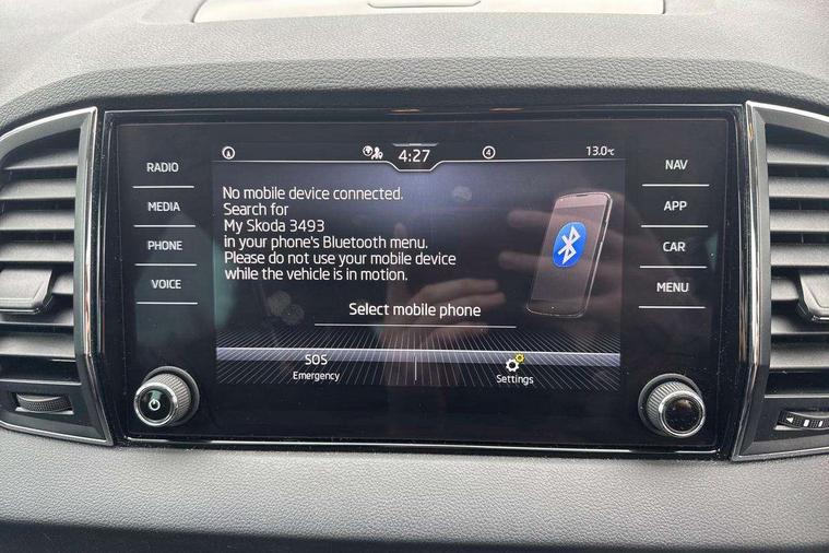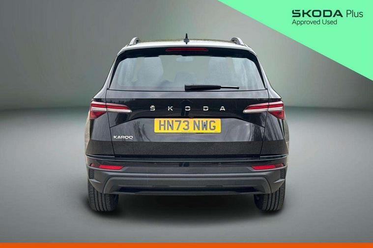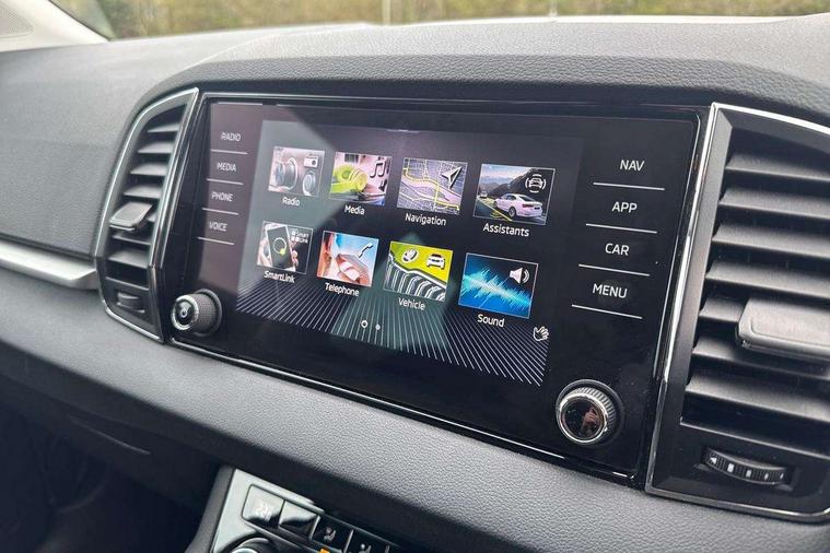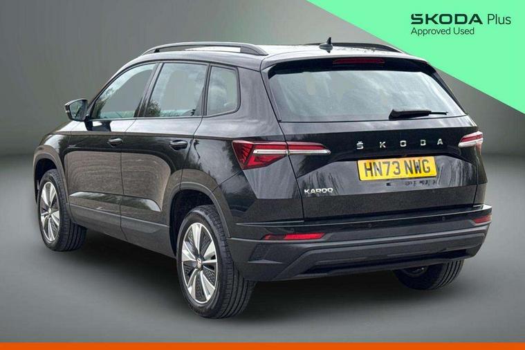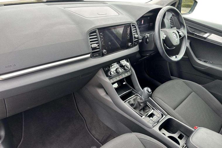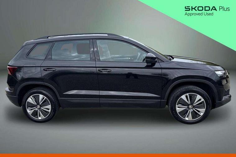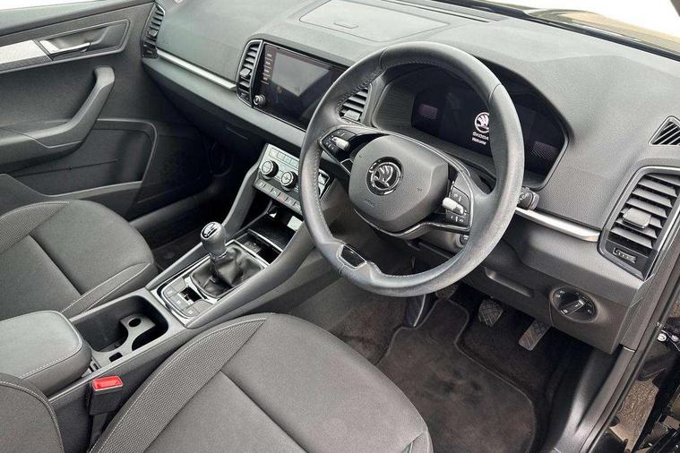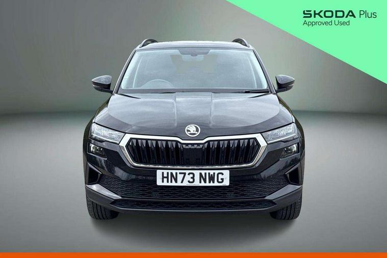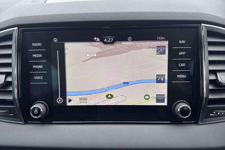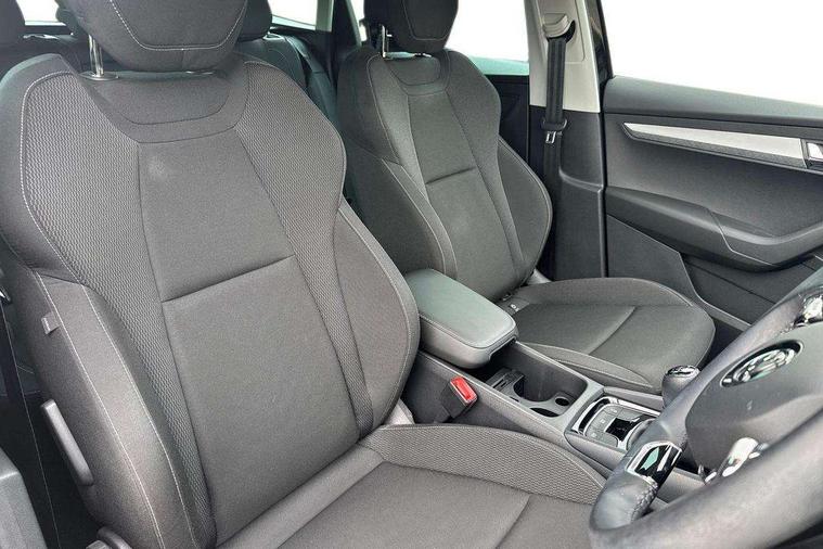 8" Digital display, Amundsen satellite navigation with 8" touchscreen display with maps Europe, WLAN and web radio, Care connect, Driver fatigue sensor, Electro-mechanical PAS, Emergency services call system, Outside temperature gauge, Service interval indicator, SmartLink wireless for Apple and wired for Android, Start/stop system with regenerative braking, USB C Port x 2 in front centre console, 8 Speakers, DAB radio with Bluetooth, USB connection, Acoustic glass, Aero front windscreen wipers with intermittent function, Auto dimming rear view mirror with light and rain sensors, Black electric window control buttons, Body colour door mirrors and handles, Dynamic headlight range control with cornering light function, Electric front and rear windows with child proof lock, Electrically adjustable heated folding and auto dimming door mirrors, Front fog lights, Heated rear windscreen, LED daytime running lights, LED Headlights, LED rear lights with high functionality welcome effect and dynamic indicators, Light assistant (coming/leaving home/tunnel light), Plastic scuff plates, Privacy glass, Rear side wing doors, Rear window wiper with washer system and intermittent control, Safety reflectors on front doors, Third brake light, 1.5 litre bottle holders in driver and front passenger door panels, 12V socket in boot, 12v socket in front centre armrest with storage compartment and rear air vents, 2 x Tablet holder, 3 rear height adjustable headrests, 3 seat bench in 2nd row, 4 foldable roof handles with rear coat hooks, Black floor carpet, Chrome inner door handles, Double sided boot floor, Driver/front passenger reading lights, Foldable hooks in the boot, Folding tables on the front seat backrests, Front head restraints, Height adjustable driver and passenger seat, Height adjustable front three point seats belts with tensioners, Height/reach adjust steering wheel, Ice scraper, Illuminated glovebox, Illuminated luggage compartment, Isofix child seat preparation for front passenger seat, Isofix child seat preparation outer rear, Manual lumbar support for front seats, Pearl grey interior ceiling, Pen holder, Pollen filter, Rear boot cover, Rear reading lights, Rubbish bin door, Safety vest holder, Single front passenger seat, Storage box in upper central dashboard closed, Sunvisors with illuminated vanity mirrors, Textile floor mats, Ticket holder, Umbrella under passenger seat, Boot pack - Karoq, Automatic door unlocking in case of crash, Automatic fuel cut off in case of crash, Child locks on rear doors, Driver airbag, Electronic parking brake with auto hold function, Emergency rear braking signal, ESC including ABS, MSR, ASR, EDS, HBA, DSR, RBS, MKB and traction control, Front side airbags, Hill hold control, Knee airbags, Passenger airbag with switch-off function, Pedestrian monitor, Seatbelt reminder signalisation and pretensioner for all seats, Three point seatbelts rear, Two tone horn, Tyre pressure display, Tyre pressure monitor, Alarm with interior monitoring, back up horn and tilt sensor with safe function, Electronic engine immobiliser, Remote central locking with 2 remote folding keys, Black centre console, Chrome framed air vents, Satin black dashboard, Satin black door trim, Anti-theft wheel bolts protection, Storage on wheel cover, Tool kit,