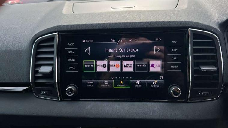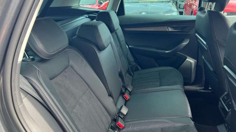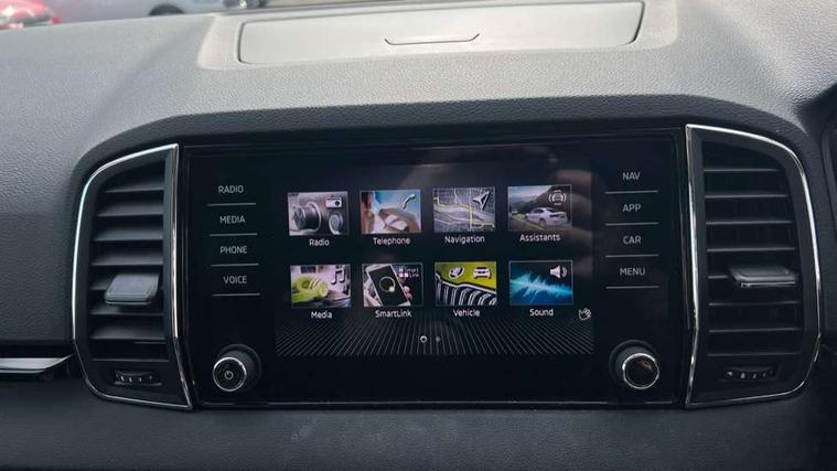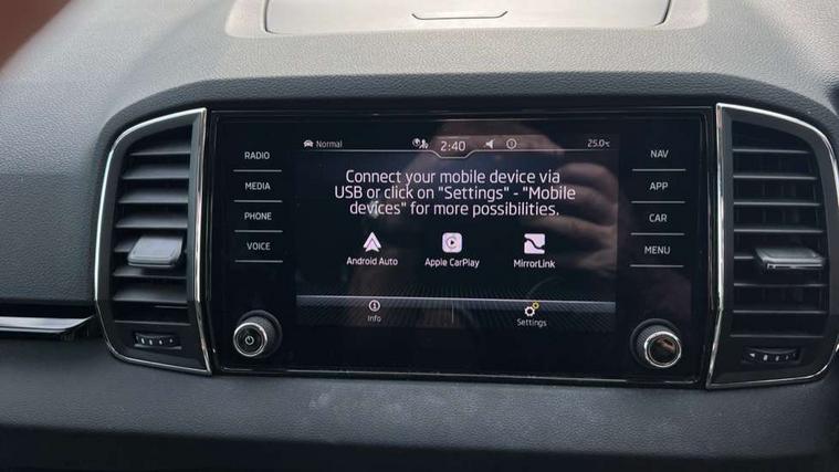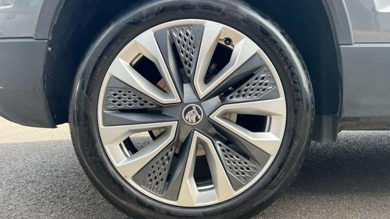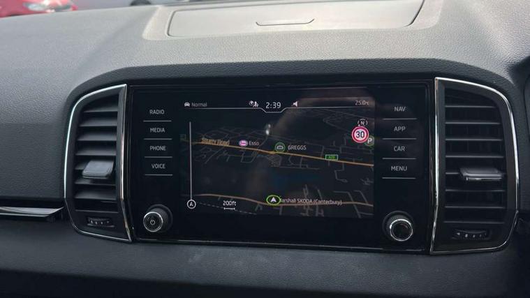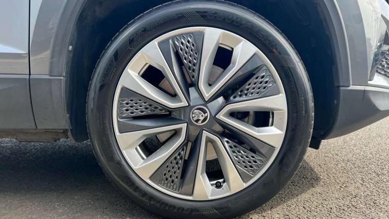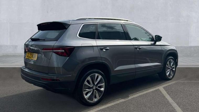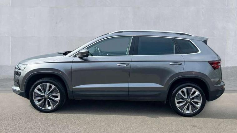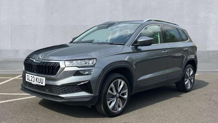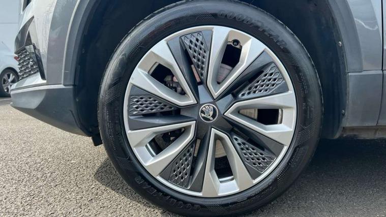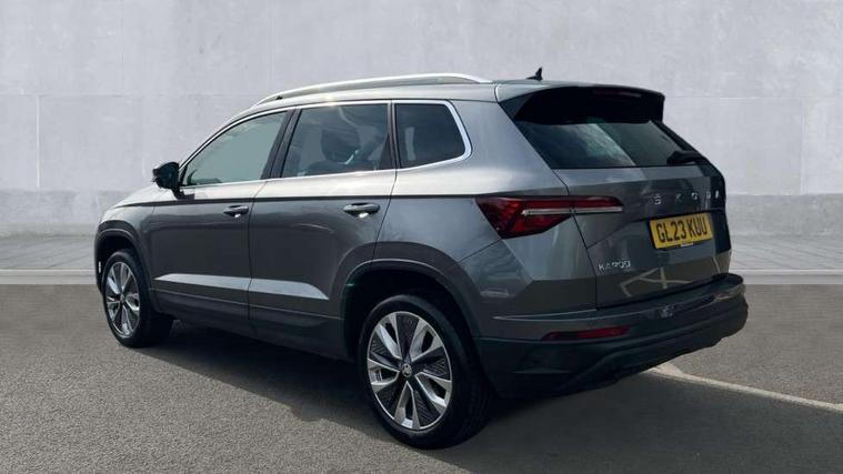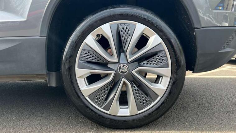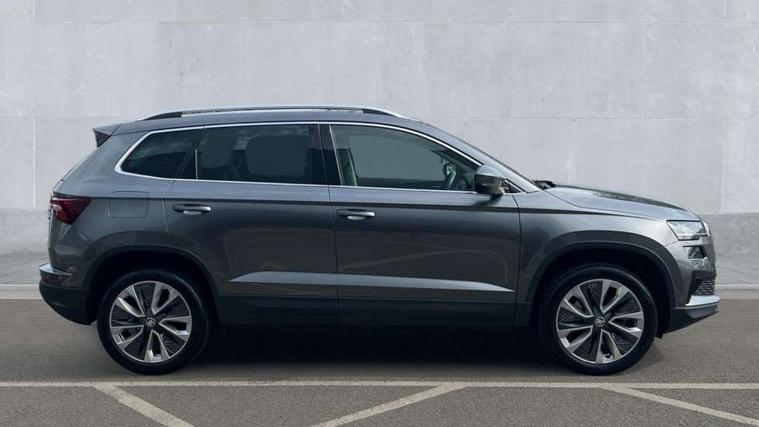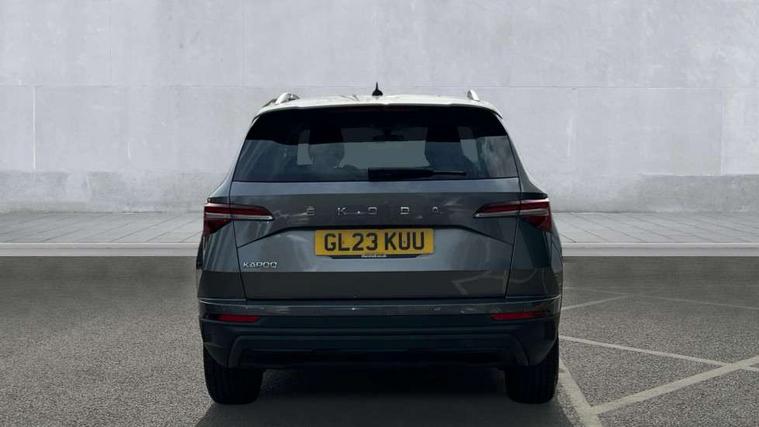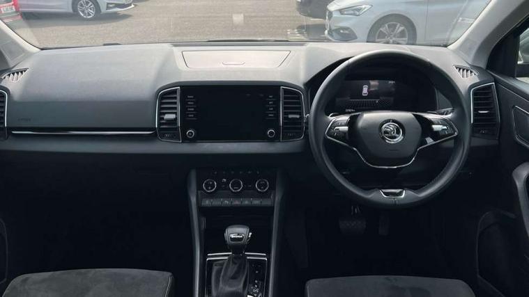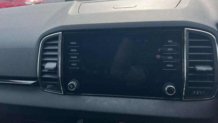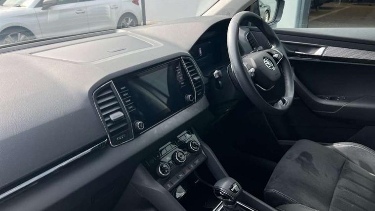 8" Digital display, Care connect, Driver fatigue sensor, Emergency services call system, Outside temperature gauge, Service interval indicator, SmartLink wireless for Apple and wired for Android, Start/stop system with regenerative braking, USB C Port x 2 in front centre console, 8 Speakers, DAB radio with Bluetooth, USB connection, Acoustic glass, Aero front windscreen wipers with intermittent function, Auto dimming rear view mirror with light and rain sensors, Black electric window control buttons, Body colour door mirrors and handles, Dynamic headlight range control with cornering light function, Electric front and rear windows with child proof lock, Heated rear windscreen, LED daytime running lights, LED rear lights with high functionality welcome effect and dynamic indicators, Light assistant (coming/leaving home/tunnel light), Plastic scuff plates, Privacy glass, Rear side wing doors, Rear spoiler, Rear window wiper with washer system and intermittent control, Safety reflectors on front doors, 1.5 litre bottle holders in driver and front passenger door panels, 12V socket in boot, 12v socket in front centre armrest with storage compartment and rear air vents, 2 spoke leather heated multifunction steering wheel with DSG paddles, 2 x Tablet holder, 3 rear height adjustable headrests, 3 seat bench in 2nd row, 4 foldable roof handles with rear coat hooks, Black floor carpet, Chrome inner door handles, Decorative door sills with KAROQ badging, Double sided boot floor, Foldable hooks in the boot, Front head restraints, Height adjustable front three point seats belts with tensioners, Height/reach adjust steering wheel, Ice scraper, Illuminated glovebox, Illuminated luggage compartment, Isofix child seat preparation for front passenger seat, Isofix child seat preparation outer rear, Manual lumbar support for front seats, Pen holder, Pollen filter, Rear boot cover, Rear reading lights, Rubbish bin door, Safety vest holder, Single front passenger seat, Storage box in upper central dashboard closed, Sunvisors with illuminated vanity mirrors, Textile floor mats, Ticket holder, VarioFlex seats with standard rear seat release, Boot pack - Karoq, Chrome roof rails + chrome pack - Karoq, Parking pack - Karoq, Automatic door unlocking in case of crash, Automatic fuel cut off in case of crash, Child locks on rear doors, Driver airbag, Electronic parking brake with auto hold function, Emergency rear braking signal, ESC including ABS, MSR, ASR, EDS, HBA, DSR, RBS, MKB and traction control, Front side airbags, Hill hold control, Knee airbags, Passenger airbag with switch-off function, Pedestrian monitor, Seatbelt reminder signalisation and pretensioner for all seats, Three point seatbelts rear, Two tone horn, Tyre pressure display, Tyre pressure monitor, Alarm with interior monitoring, back up horn and tilt sensor with safe function, Electronic engine immobiliser, Keyless entry and start/stop, Remote central locking with 2 remote folding keys, Chrome framed air vents, 18" Procyon silver alloy wheels with anthracite aero inserts, Anti-theft wheel bolts protection, Storage on wheel cover, Tool kit,
