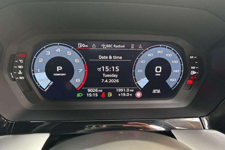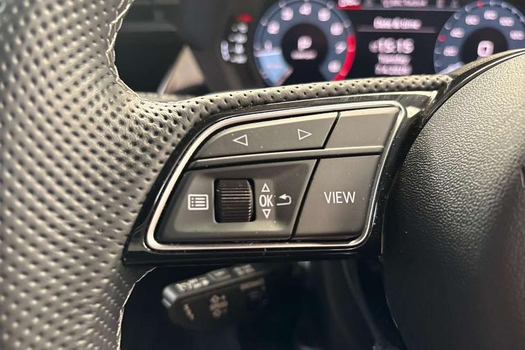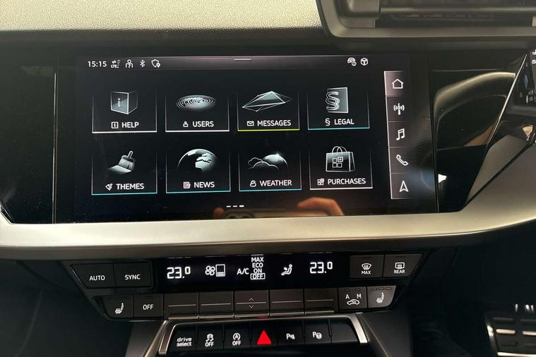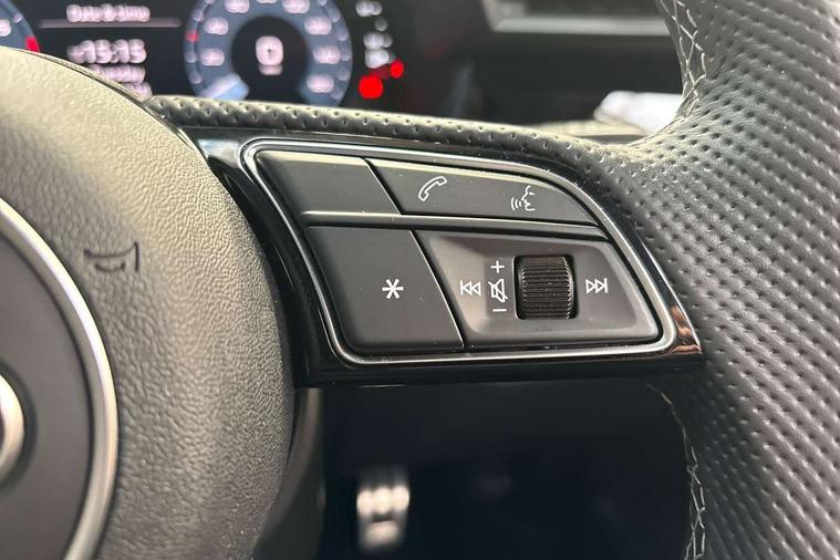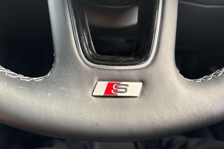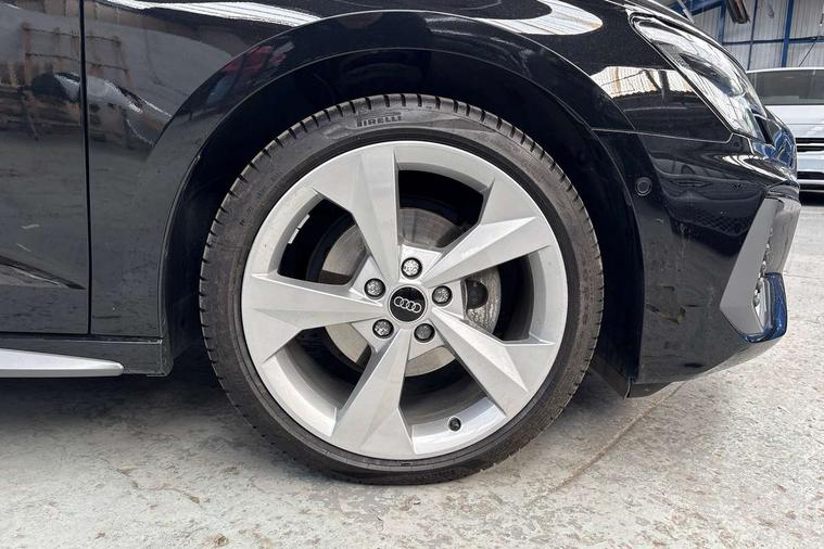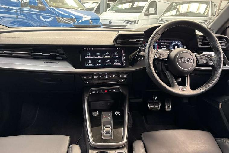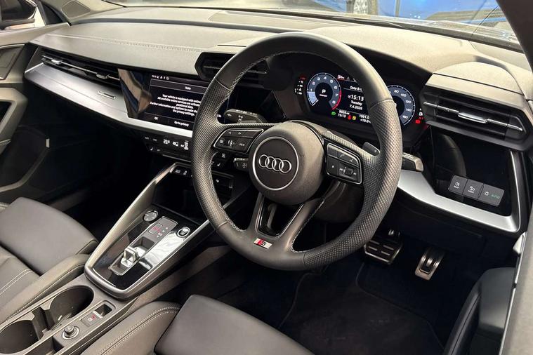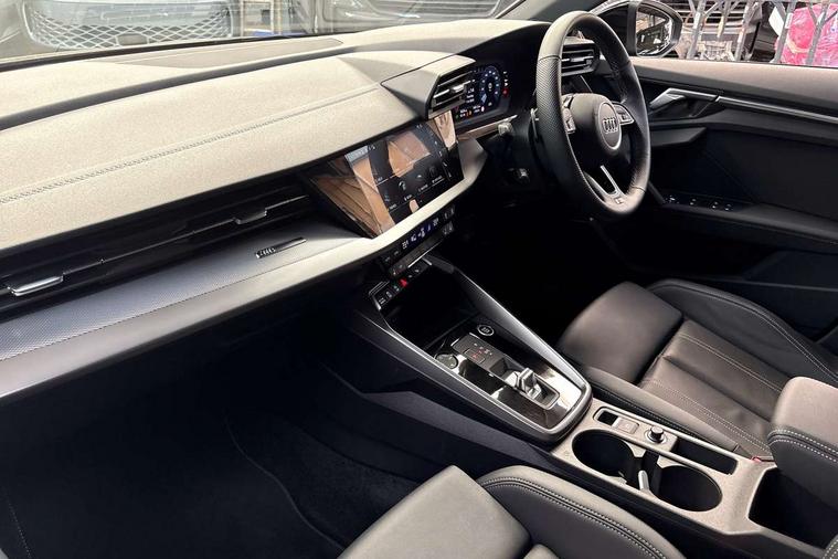 Audi drive select (Auto, Comfort, Dynamic, Efficiency and Individual), Audi smartphone interface, Audi Virtual Cockpit - 10.25" digital and colour instrument cluster, Automatic start/stop system with recuperation, Bluetooth interface, Camera based traffic sign recognition, Collision avoidance assistant, e-Call (emergency call), Electromechanical power speed sensitive steering, Lane departure warning system, MMI Navigation Plus with high resolution 10.1" colour touch screen display, Service indicator, Trip computer, Voice control system with natural language interaction, Sports suspension, 2xUSB-C connection with data and charging functions, 6 passive loudspeakers, DAB Digital radio, 3rd brake light, Acoustic glass windscreen, Aluminium window trim, Auto dimming frameless rear view mirror, Body colour exterior mirrors, Electrically adjustable/heated/folding/auto dimming door mirrors with integrated LED indications + kerb view function for passenger side, Front electric windows, Illuminated door sills with aluminium inserts at the front with S logo, LED daytime running lights, LED headlights with LED rear lights and dynamic rear indicators, Light and rain sensors, Privacy glass - dark tinted rear window, rear door and side windows, Rear electric windows, Rear side air outlets in grained matt black, Rear side wing doors, Rear wiper, S line bumpers, S roof spoiler, 12V socket and storage compartment in front centre console, 3 seat bench in 2nd row, 3 spoke leather multifunction steering wheel with paddle shift, 4 way electrically adjustable lumbar support for driver and front passenger, 60/40 split folding rear seat bench, Black cloth headlining, Dual zone electronic climate control, Front and rear centre armrest in artificial leather, Front and rear headrests, Front/rear floor mats, Height and reach adjustable steering wheel, Interior lighting - glove compartment light and right hand side, Luggage compartment floor covering, Manual boot compartment lid, Manually adjustable front seats, Seat side bolsters, Single front passenger seat, Stainless steel pedals and front footrest in black, Twin leather upholstery with front sports seats S embossed logo, Aluminium interior elements pack - A3 Sportback, LED interior lighting pack - A3 Sportback, S line styling pack - A3 Sportback, 3x3 point rear seat belts, Driver and front passenger airbag with passenger airbag deactivation, Electronic Stabilisation Control (ESC) including ABS, ASR and EDL, First aid kit with warning triangle and 2 safety vests, Front side airbags with head airbags and interaction airbag, Pre-sense front with pedestrian and cyclist detection, Seatbelt monitoring, Tyre pressure loss indicator, Anti theft alarm, Anti-theft wheel bolts, Electronically operated child locks, Immobiliser, Remote control central locking, Dark spectrum aluminium inlays, accent surfaces in the dashboard and centre console in platinum grey silk effect paint finish,