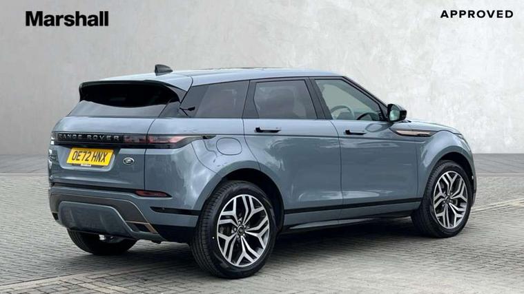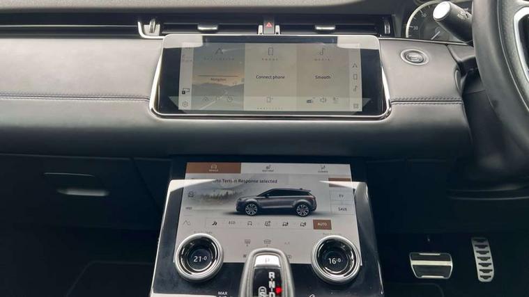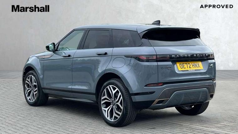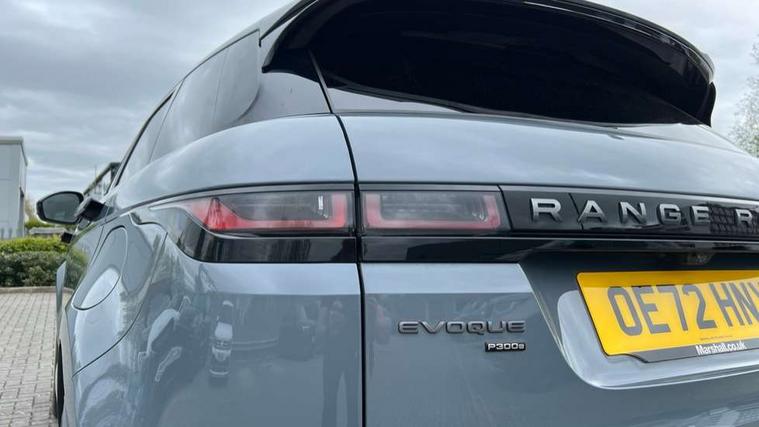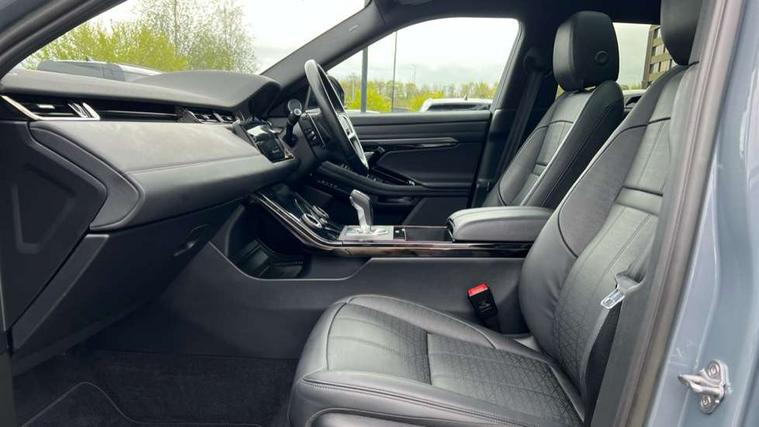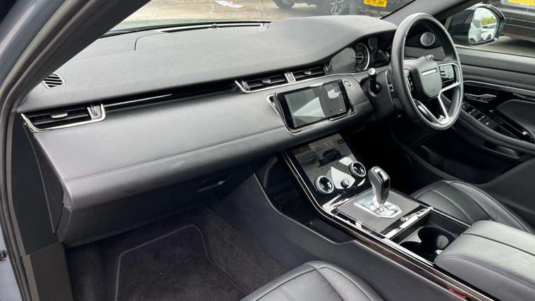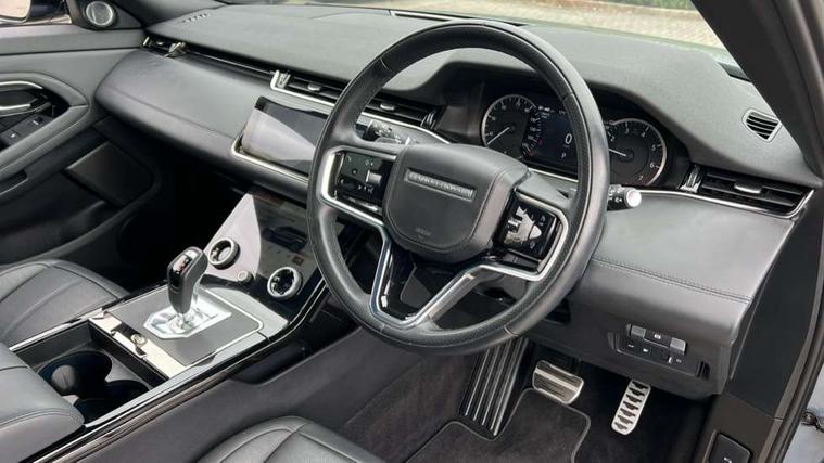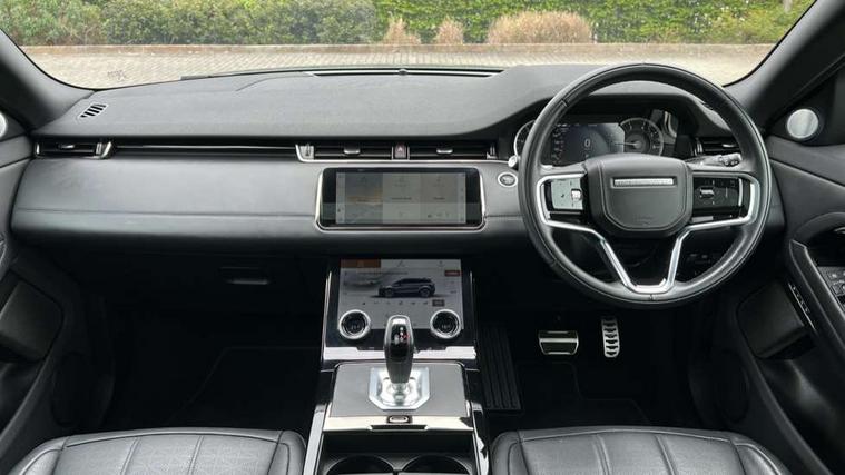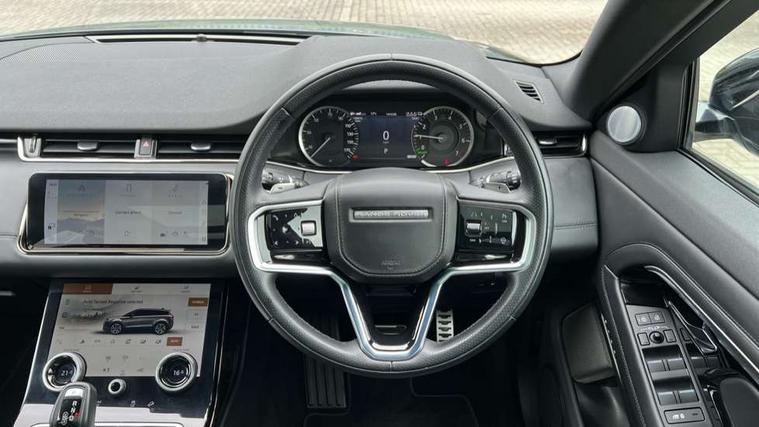 10" deployable touchscreen with lower touchscreen, Adaptive cruise control, Android Auto, Apple car play, Blind spot assist, Bluetooth connectivity, Brake pad wear indicator warning light, Driver condition monitor, eCall emergency system, Electronic power assisted steering (EPAS), Front and rear parking aid, InControl remote, Land Rover InControl apps, Lane keep assist, Pivi pro connected includes upgraded infotainment, connected navigation pro, Nuance speech licence, Push button starter, Rear collision monitor, Rear traffic monitor, Traffic sign recognition with adaptive speed limiter, Voice control system, 7 kW onboard charger, All terrain progress control, Configurable dynamics, Electric rear axle drive, Home charging cable, Large fuel tank, Passive suspension, Public charging cable, Terrain Response 2 Auto, Digital Audio Broadcast radio-DAB, Meridian surround sound system with 650W subwoofer and 14 speakers, Steering wheel mounted controls, Auto headlights, Automatic headlight levelling, Electric windows with one touch open/close and anti trap, Evoque and R-Dynamic badge, Flush deployable exterior door handles, Heated rear window with timer, Heated washer jets, Heated windscreen, P300e badge, Power fold, auto-dimming, heated door mirrors with approach lights and auto dimming driver side, Rain sensing windscreen wipers, Rear fog lights, Rear side wing doors, Rear wiper, Tailgate spoiler, Third brake light, 40:20:40 split folding rear seats with centre headrest and armrest, Ambient interior lighting, Bright metal pedals, Heated steering wheel, Isofix system on outer rear seats, Overhead lighting console, Overhead stowage for sunglasses, Passive front head restraints, Perforated full leather steering wheel, Rear air vents, Rear centre headrest, Rear head restraints, Satin chrome gearshift paddles, Single passenger seat, Sunvisors with illuminated vanity mirrors, Twin sliding front centre armrest, 3 rear 3 point seatbelts, Anti-lock braking system (ABS), Customer configurable autolock, DSC - Dynamic Stability Control, Electronic brake force distribution, Electronic parking brake, Electronic traction control, Emergency braking, Front and rear seatbelt reminder, Hill descent control, Hill launch assist, Low traction launch, Power operated child locks, Roll stability control, Six airbags - Driver and passenger airbags/driver knee airbag/front side airbag and curtain airbags, Torque vectoring brake, Tyre pressure monitoring system, Alarm, Immobiliser, Intrusion sensor, Keyless entry, Locking wheel nuts,