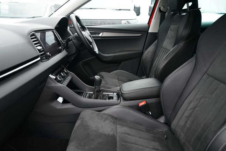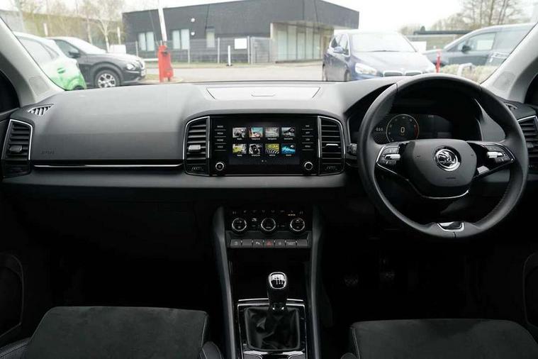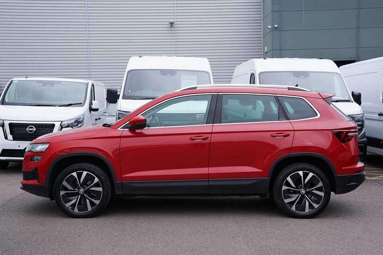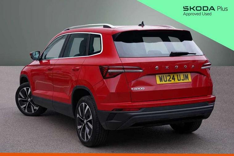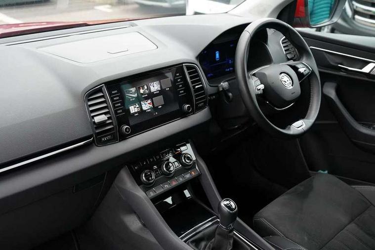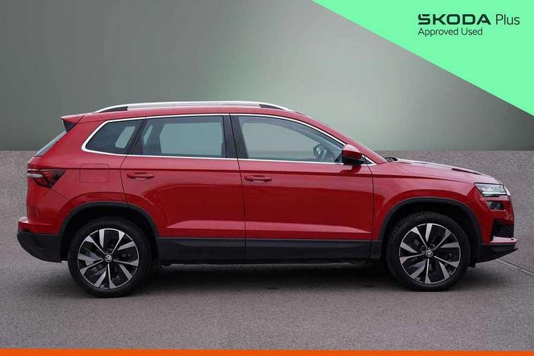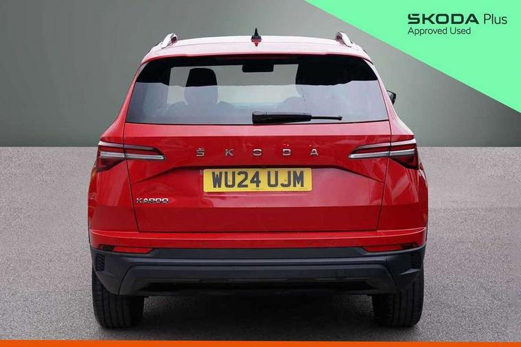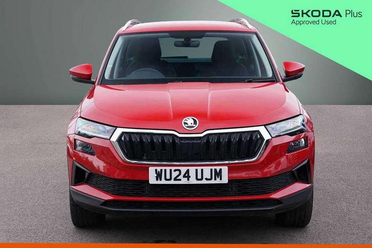 8" Digital display, Care connect, Driver fatigue sensor, Emergency services call system, Outside temperature gauge, Service interval indicator, SmartLink wireless for Apple and wired for Android, Start/stop system with regenerative braking, USB C Port x 2 in front centre console, 8 Speakers, DAB radio with Bluetooth, USB connection, Acoustic glass, Aero front windscreen wipers with intermittent function, Auto dimming rear view mirror with light and rain sensors, Black electric window control buttons, Body colour door mirrors and handles, Dynamic headlight range control with cornering light function, Electric front and rear windows with child proof lock, Heated rear windscreen, LED daytime running lights, LED rear lights with high functionality welcome effect and dynamic indicators, Light assistant (coming/leaving home/tunnel light), Plastic scuff plates, Privacy glass, Rear side wing doors, Rear spoiler, Rear window wiper with washer system and intermittent control, Safety reflectors on front doors, 1.5 litre bottle holders in driver and front passenger door panels, 12V socket in boot, 12v socket in front centre armrest with storage compartment and rear air vents, 2 spoke leather heated multifunction steering wheel, 2 x Tablet holder, 3 rear height adjustable headrests, 3 seat bench in 2nd row, 4 foldable roof handles with rear coat hooks, Black floor carpet, Chrome inner door handles, Double sided boot floor, Foldable hooks in the boot, Front head restraints, Height adjustable front three point seats belts with tensioners, Height/reach adjust steering wheel, Ice scraper, Illuminated glovebox, Illuminated luggage compartment, Isofix child seat preparation for front passenger seat, Isofix child seat preparation outer rear, Manual lumbar support for front seats, Pen holder, Pollen filter, Rear boot cover, Rear reading lights, Rubbish bin door, Safety vest holder, Single front passenger seat, Storage box in upper central dashboard closed, Sunvisors with illuminated vanity mirrors, Textile floor mats, Ticket holder, VarioFlex seats with standard rear seat release, Boot pack - Karoq, Design Pack - Karoq, Parking pack - Karoq, Automatic door unlocking in case of crash, Automatic fuel cut off in case of crash, Child locks on rear doors, Driver airbag, Electronic parking brake with auto hold function, Emergency rear braking signal, ESC including ABS, MSR, ASR, EDS, HBA, DSR, RBS, MKB and traction control, Front side airbags, Hill hold control, Knee airbags, Passenger airbag with switch-off function, Pedestrian monitor, Seatbelt reminder signalisation and pretensioner for all seats, Three point seatbelts rear, Two tone horn, Tyre pressure display, Tyre pressure monitor, Alarm with interior monitoring, back up horn and tilt sensor with safe function, Electronic engine immobiliser, Keyless entry and start/stop, Remote central locking with 2 remote folding keys, Chrome framed air vents, 18" Miran alloy wheels in black, Anti-theft wheel bolts protection, Tool kit,