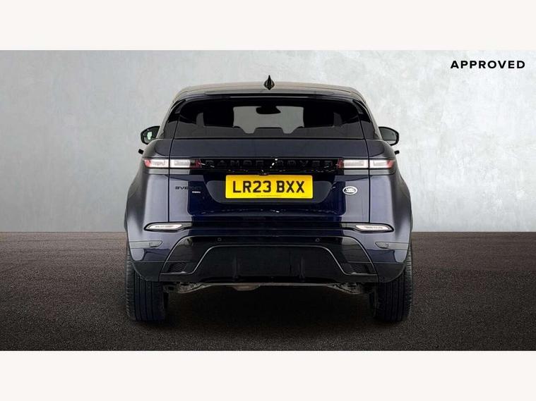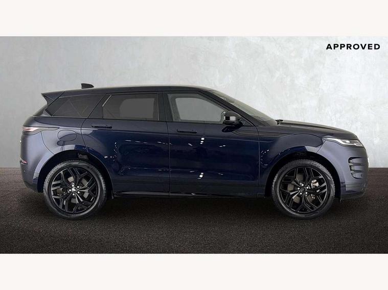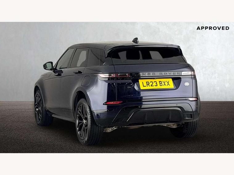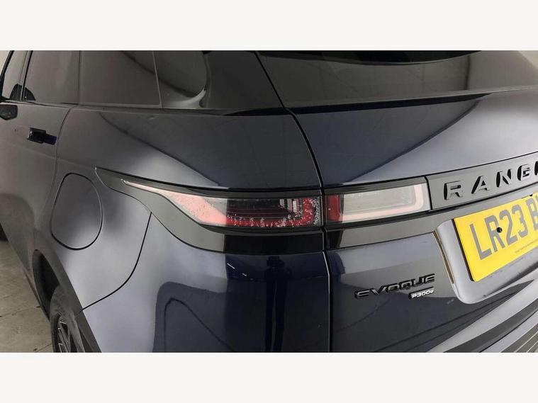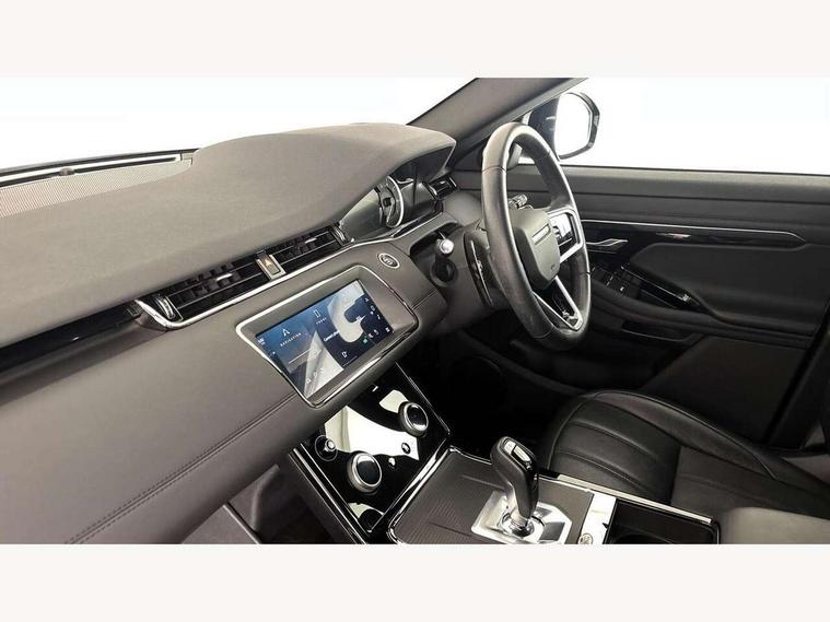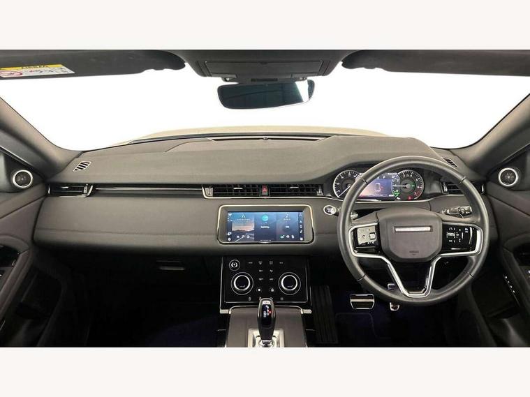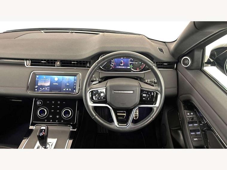 Adaptive cruise control, Android Auto, Apple car play, Blind spot assist, Bluetooth connectivity, Brake pad wear indicator warning light, Driver condition monitor, eCall emergency system, Electronic power assisted steering (EPAS), Front and rear parking aid, InControl remote, Land Rover InControl apps, Lane keep assist, Pivi pro connected includes upgraded infotainment, connected navigation pro, Nuance speech licence, Push button starter, Rear collision monitor, Rear traffic monitor, Traffic sign recognition with adaptive speed limiter, Voice control system, 7 kW onboard charger, All terrain progress control, Electric rear axle drive, Home charging cable, Large fuel tank, Passive suspension, Public charging cable, Terrain Response 2 Auto, Digital Audio Broadcast radio-DAB, Steering wheel mounted controls, Auto headlights, Automatic headlight levelling, Electric windows with one touch open/close and anti trap, Evoque and R-Dynamic badge, Flush deployable exterior door handles, Heated rear window with timer, Heated washer jets, Heated windscreen, P300e badge, Power fold, auto-dimming, heated door mirrors with approach lights and auto dimming driver side, Rain sensing windscreen wipers, Rear fog lights, Rear side wing doors, Rear wiper, Tailgate spoiler, Third brake light, 40:20:40 split folding rear seats with centre headrest and armrest, Ambient interior lighting, Bright metal pedals, Isofix system on outer rear seats, Overhead lighting console, Overhead stowage for sunglasses, Passive front head restraints, Rear air vents, Rear centre headrest, Rear head restraints, Satin chrome gearshift paddles, Single passenger seat, Sunvisors with illuminated vanity mirrors, Twin sliding front centre armrest, 3 rear 3 point seatbelts, Anti-lock braking system (ABS), Customer configurable autolock, DSC - Dynamic Stability Control, Electronic brake force distribution, Electronic parking brake, Electronic traction control, Emergency braking, Front and rear seatbelt reminder, Hill descent control, Hill launch assist, Low traction launch, Power operated child locks, Roll stability control, Six airbags - Driver and passenger airbags/driver knee airbag/front side airbag and curtain airbags, Torque vectoring brake, Tyre pressure monitoring system, Alarm, Immobiliser, Intrusion sensor, Keyless entry, Locking wheel nuts,