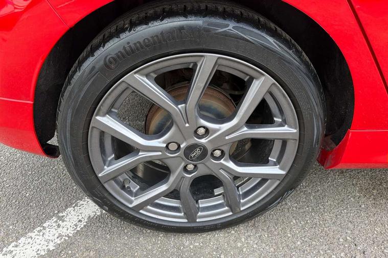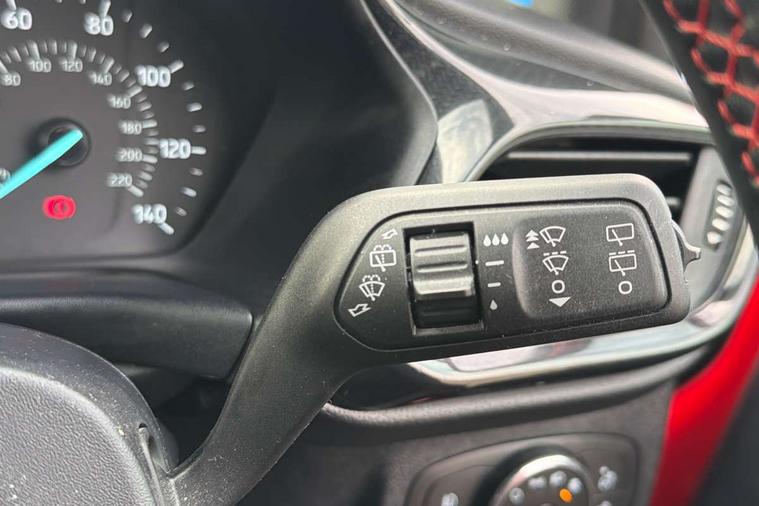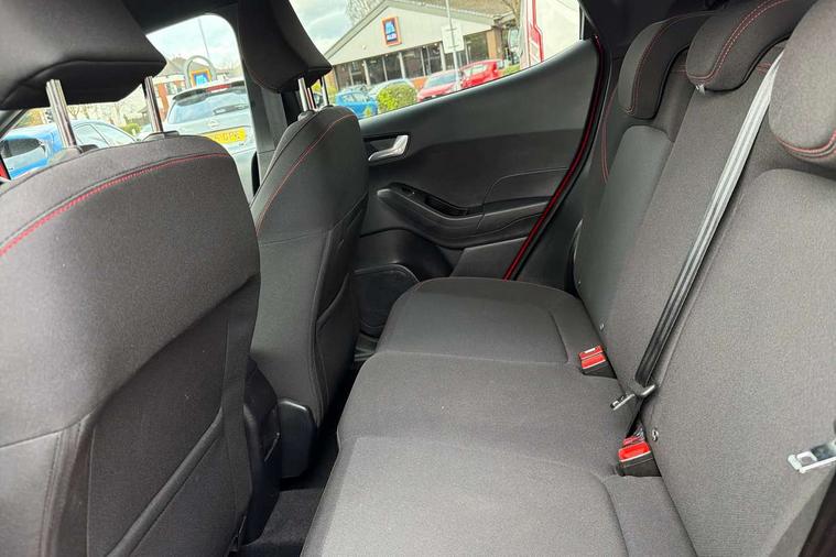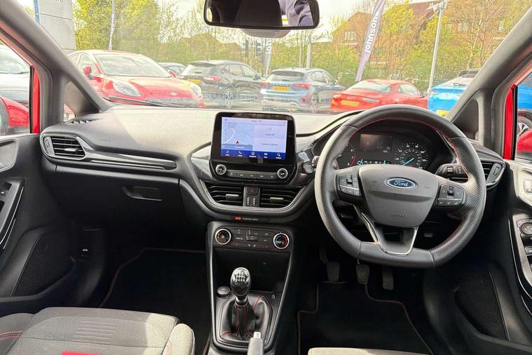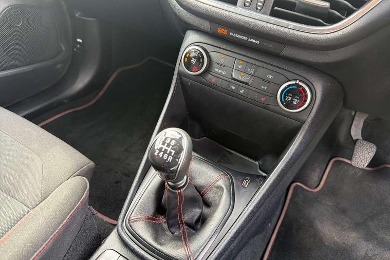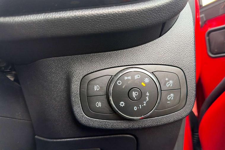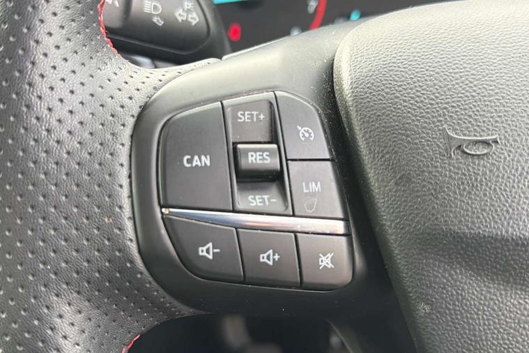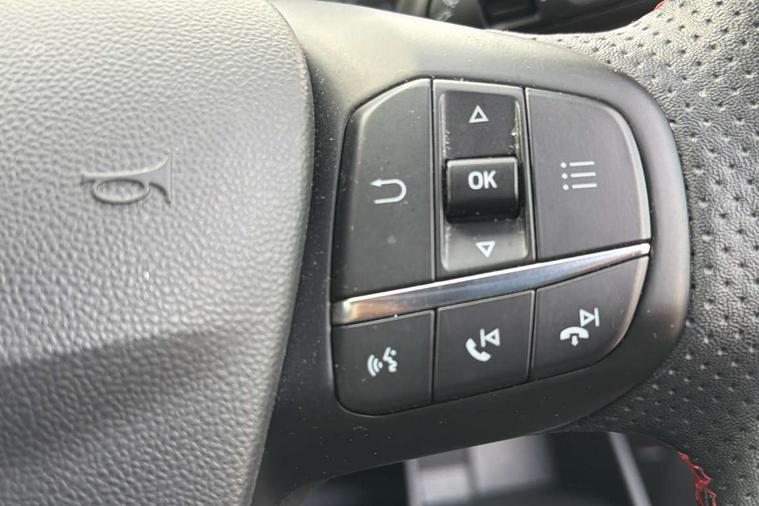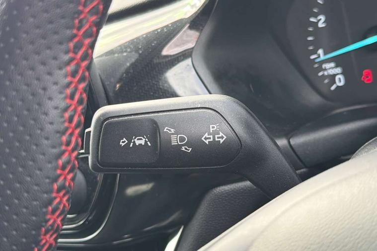 4.2" Colour TFT Ice blue illumination analogue cluster, Driver alert system, Electric power steering, Ford easy fuel, Lane keep assist, Lane keeping aid, Rear parking distance sensors, Selectable drive modes (Normal, Sport, Track), Trip computer, Sports suspension, 3rd brake light, Auto high beam, Automatic headlights, Body colour bumpers, Body colour large rear spoiler, Body coloured electrically operated with side indicators, Electric front windows/one touch facility, Electric rear windows, Quickclear heated windscreen, Rain sensing wipers and auto dimming rear view mirror, Rear privacy glass, Rear side wing doors, Rear wiper, Unique ST-Line grille, full bodystyling kit and large body coloured rear spoiler, 3 rear headrests, 3 seat bench in 2nd row, Adjustable head restraints, Black headlining, Centre console with opening armrest, 2x cupholders, 12v and USB, Cloth upholstery with red stitching, Leather gear knob, Manual 2 way passenger seat adjust, Manual 4-way driver seat adjust, Manual air conditioning, Premium floor mats, Sensico wrapped steering wheel, Single front passenger seat, 3 point seatbelts on all rear seats, Electronic stability control with hill start assist, Front and rear seat belt warning, Manual child lock in rear doors, Tyre pressure monitoring system, Keyless start with 'Ford Power' starter button, MyKey system, Remote central locking, Thatcham alarm with power door dead locks, 17" 5x2 spoke alloy wheels with rock metallic finish,