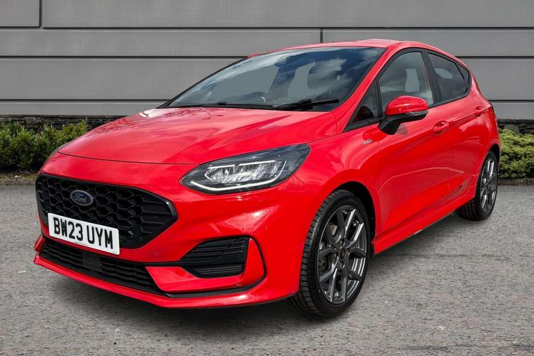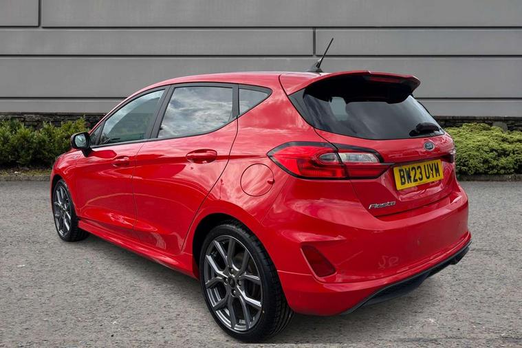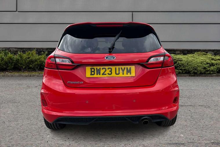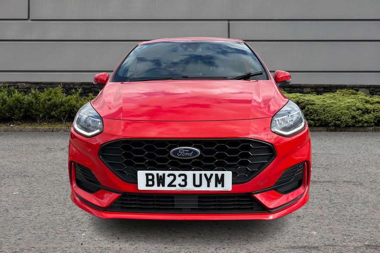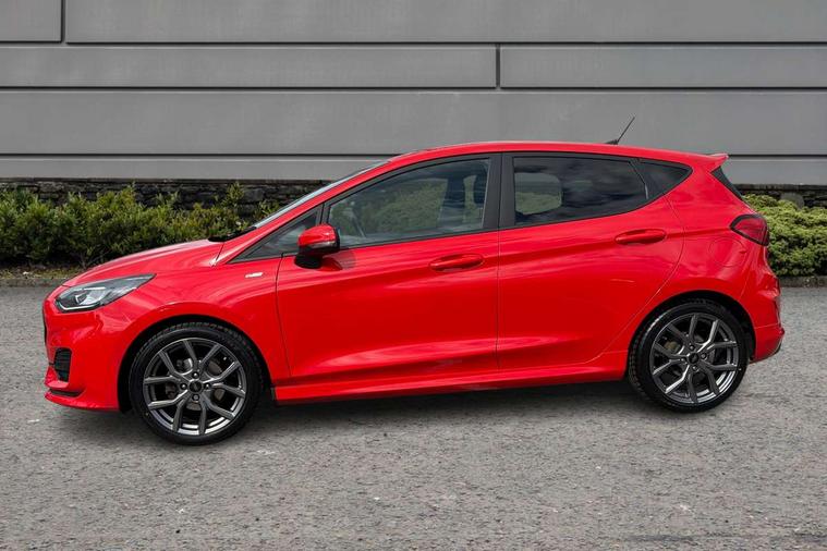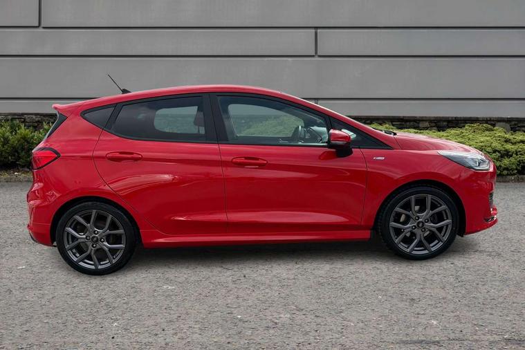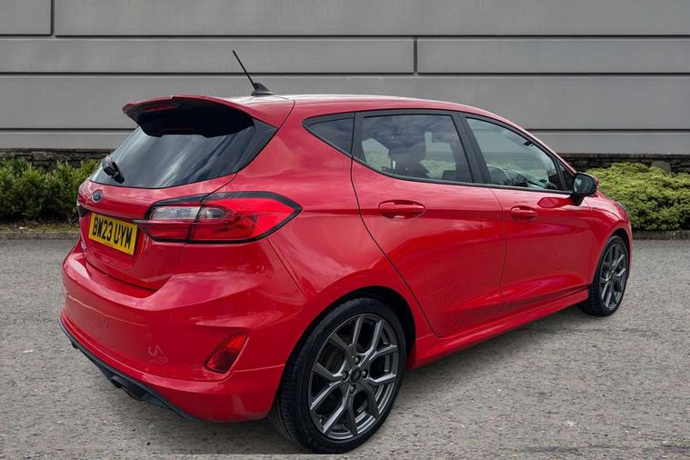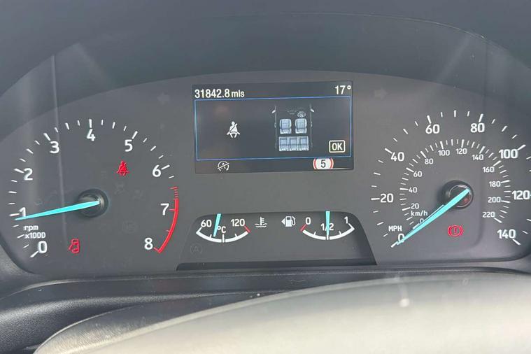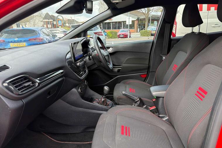 4.2" Colour TFT Ice blue illumination analogue cluster, Driver alert system, Electric power steering, Ford easy fuel, Lane keep assist, Lane keeping aid, Rear parking distance sensors, Selectable drive modes (Normal, Sport, Track), Trip computer, Sports suspension, 3rd brake light, Auto high beam, Automatic headlights, Body colour bumpers, Body colour large rear spoiler, Body coloured electrically operated with side indicators, Electric front windows/one touch facility, Electric rear windows, Quickclear heated windscreen, Rain sensing wipers and auto dimming rear view mirror, Rear privacy glass, Rear side wing doors, Rear wiper, Unique ST-Line grille, full bodystyling kit and large body coloured rear spoiler, 3 rear headrests, 3 seat bench in 2nd row, Adjustable head restraints, Black headlining, Centre console with opening armrest, 2x cupholders, 12v and USB, Cloth upholstery with red stitching, Leather gear knob, Manual 2 way passenger seat adjust, Manual 4-way driver seat adjust, Manual air conditioning, Premium floor mats, Sensico wrapped steering wheel, Single front passenger seat, 3 point seatbelts on all rear seats, Electronic stability control with hill start assist, Front and rear seat belt warning, Manual child lock in rear doors, Tyre pressure monitoring system, Keyless start with 'Ford Power' starter button, MyKey system, Remote central locking, Thatcham alarm with power door dead locks, 17" 5x2 spoke alloy wheels with rock metallic finish,