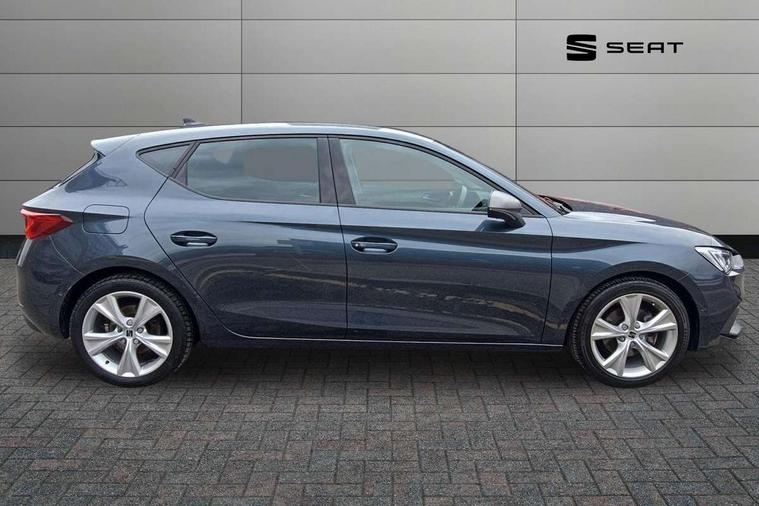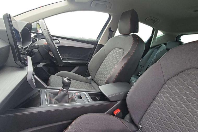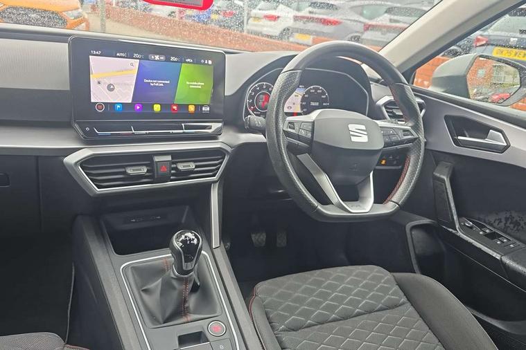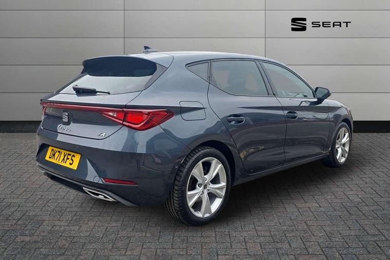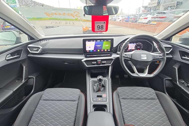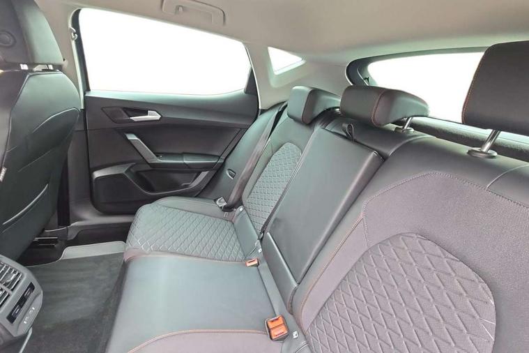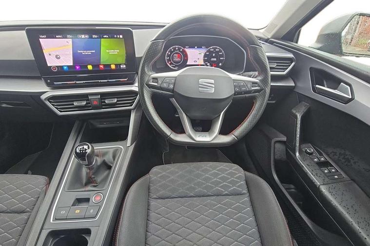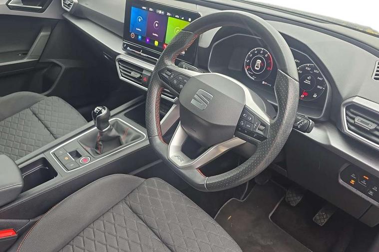 Chrome interior detailing, Media system plus with navigation - Leon, 17" Dynamic Bi-spoke alloy wheels with 91W tyres, Anti theft alarm system with interior monitoring in cab, backup horn and towing protection, KESSY Go (Keyless start), Lockable tailgate, Locking wheel bolts, Wireless phone charging, 7 speakers, Auxiliary input socket, 3 point seatbelts on all rear seats, ABS, Brake control system - ESC and brake booster, Child proof door locks, Driver and front passenger airbags with front passenger airbag de-activation, front side and curtain airbags, Electronic parking brake, Extended safety system - seat belt tensioner, window closure and hazard lights, Hill hold control, Rear disc brakes, Seat belt reminder for front and rear seats, Tiredness recognition system, driver alert system, Tyre pressure monitoring system, Auto dimming rear view mirror, Body colour door handles, Body coloured bumpers, Cosmo grey exterior mirrors with integrated LED indicators, Dark tinted rear windows, Electric front/rear windows, Electrically adjustable, heated and folding door mirrors, FR sports bumper, Illuminated front door sill, LED front fog lamps with cornering function, LED headlights and tail lights with dynamic turn signals, welcome light silhouette from exterior mirrors and dynamic headlight range control, LED rear fog lamp, Rain sensing wipers, Rear wash/wipe, Separate daytime running light with automatic headlight control and coming home feature, 12v power point in centre console, 60/40 split rear bench seat with armrest, Ambient lighting with glovebox, footwell and single monocolour, Cloth upholstery, Driver/passenger manual seat height adjustment, Dust/pollen filter, Flat bottomed perforated leather steering wheel with red stitching and FR logo and leather gear stick, Folding boot cover, Front and rear height adjustable headrests, Front and rear reading lights X 4, Front centre armrest, Front seatback storage pockets, Height/reach adjust steering wheel, ISOFIX points in outer rear seats with top tether anchorage points, Luggage tie-down hooks, Lumbar adjustment for front seats, Sunvisors with covered illuminated mirror, Three zone climate control, Tool kit, Digital cockpit, Four x USB Type C ports, Front assist with forward collision warning braking reaction to vehicles, pedestrians and cyclists, Full link smartphone integration with Mirror Link, wireless Apple CarPlay and wired Google Android Auto, Lane assist, Park assist (inc front/rear parking sensors), Power assisted speed sensitive electro-mechanical steering, RPM, trip computer, outside temp gauge, instrument light brightness, low fuel warning light, lights on reminder, gearshift indicator, SEAT drive profile with 4 modes (Eco/Normal/Sport/Individual), throttle response, Service interval indicator, Start/stop system with regenerative braking, Sports suspension, XDS electronic differential lock and dynamic traction support,