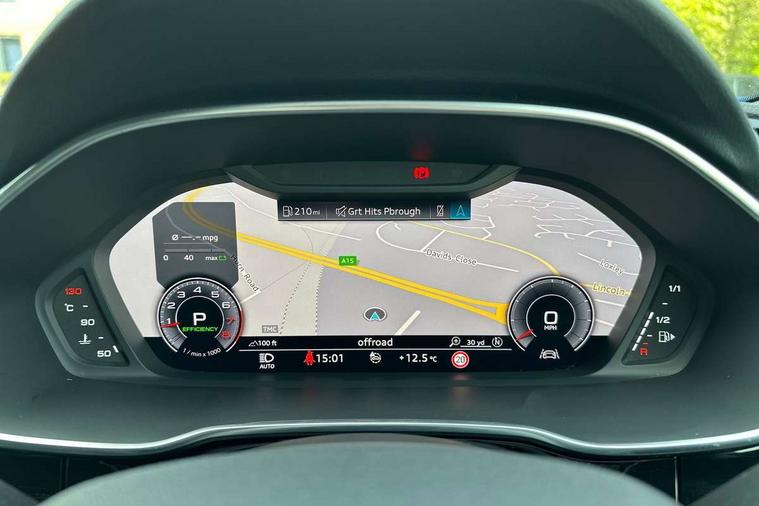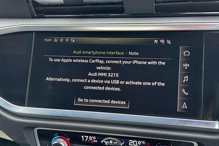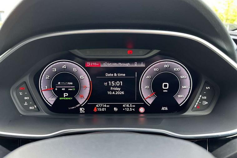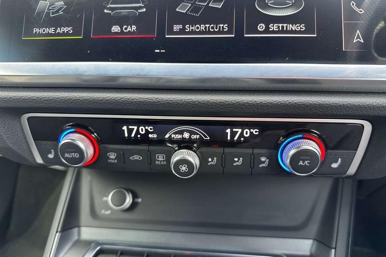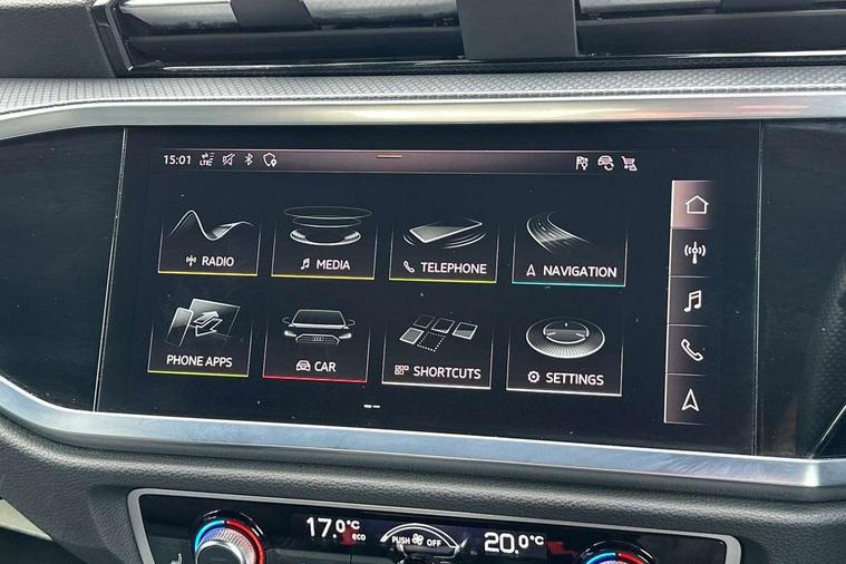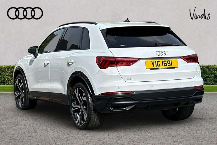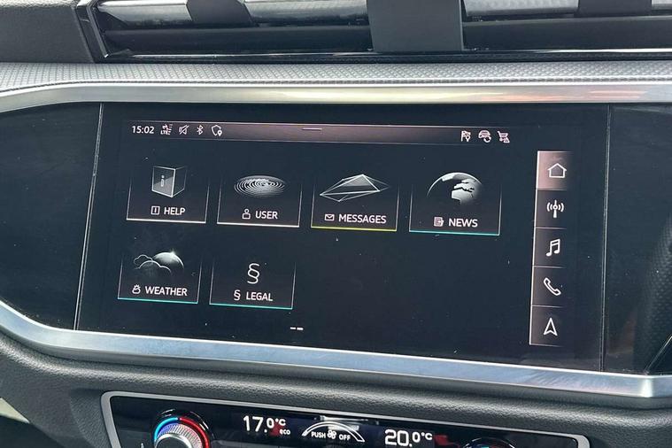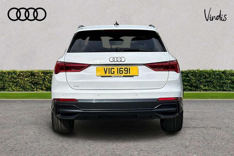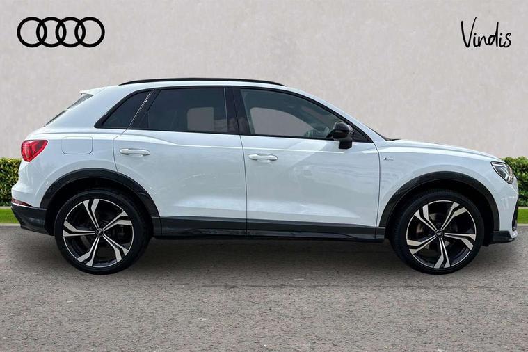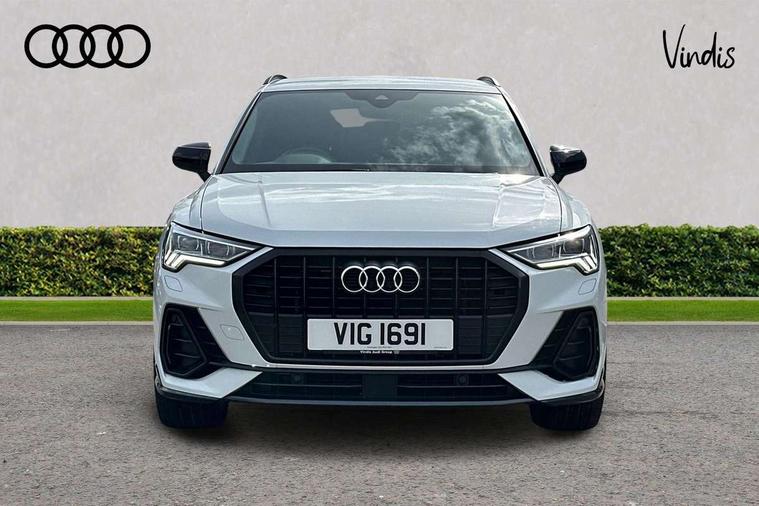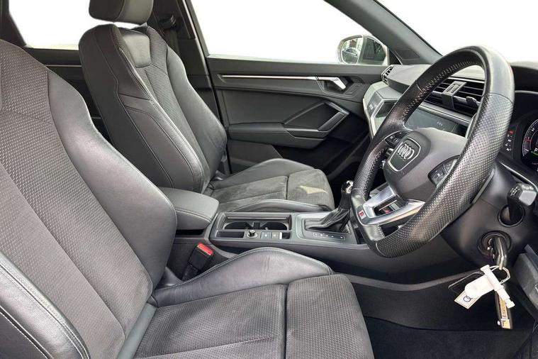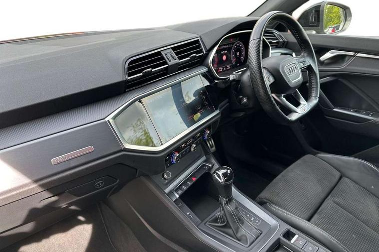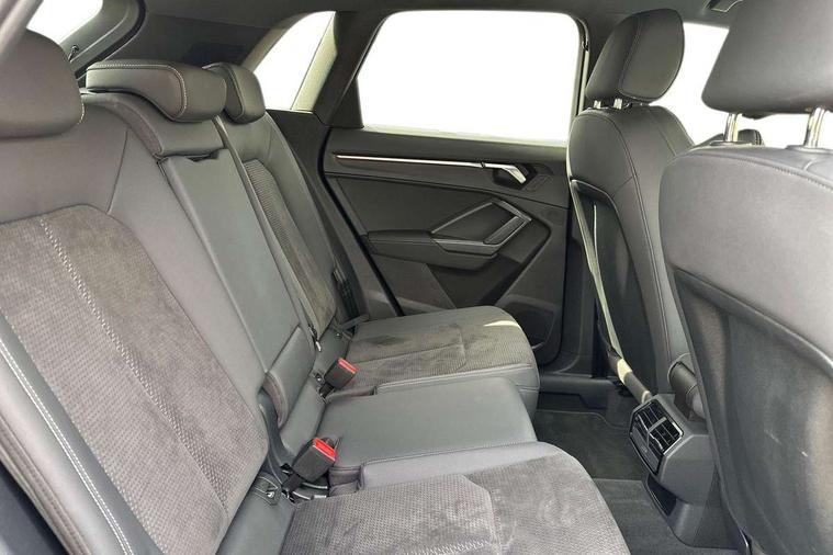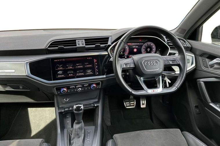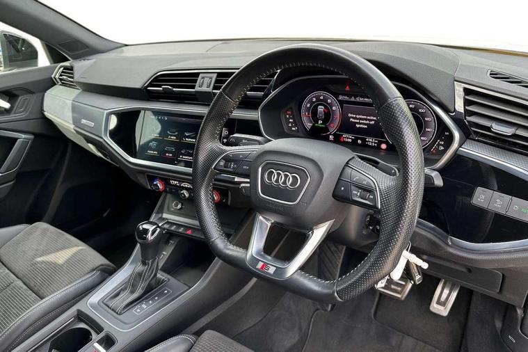Audi connect safety and service (e-call), Audi drive select, Audi lane departure warning, Audi side assist, Audi smartphone interface includes wireless Apple carplay/Android Auto, Audi virtual cockpit plus, Bluetooth interface, Camera based traffic sign recognition, MMI Navigation Plus with high resolution 10.1 inch touchscreen colour display, Power operated tailgate, Progressive steering, Service interval indicator, Start stop system with recuperation, Voice control system with natural language interaction, 48V Mild hybrid technology, Sports suspension, 1 x USB type C and 1 USB type A charging points, 6 passive loudspeakers, DAB digital radio module, Acoustic windscreen, Audi Beam uses LEDs to project the Audi Sport logo, Auto dimming frameless rear view mirror, Black roof rails, Electrically folding, adjustable and heated door mirrors with integrated LED side indicators and kerb view function for passenger side, Front and rear electric windows, Front fog lights, Front spoiler blade in matt platinum grey, Grille vertical bars in aluminium silver/Matt, Headlight washers, High gloss black finish B and C pillars, Matrix LED headlights with LED rear lights and dynamic front and rear indicator, Privacy glass dark tinted rear and rear-side windows (from B-pillar backwards), Rain and light sensors, Rear diffuser strip in matt titanium black, S line bumpers in contrasting Manhattan grey, Side skirt insert in matt Platinium grey, Silver chrome grille surround, 12V socket in rear centre console, 3 spoke flat bottomed high multi-function leather sport steering wheel with gearshift paddles, 4 way electric lumbar support for driver and front passenger, 40:20:40 folding with manual adjustment for 60:40 forwards/backwards position and backrest angle, Adjustable rear seat bench/backrest with centre armrest and cupholder, Black cloth headlining, Dual zone electronic climate control, Electrically adjustable front seats, Front and rear black floor mats with contrast stitching in rock grey, Front and rear headrests, Front and rear roof module including reading lights, Front centre armrest, Glove compartment lighting, Heated front seats, Height and reach adjustable steering wheel, Illuminated door sill trims with S logo, ISOFIX child seat mounting for front passenger with airbag deactivation and outer rear seat including top tether attachment point for outer rear seats, Luggage compartment light, Perforated leather gearknob, Stainless steel luggage compartment sill finisher, Stainless steel pedals, Tool kit, Black styling pack - Q3, Multi coloured extended ambient interior lighting pack - Q3, Non smoking pack - Q3, 3x3 point rear seatbelts, 6 airbags - Driver, front passenger, curtain and side windows, Electrically operated child locks on rear doors, Electromechanical parking brake, Electronic stabilisation control including ABS, ASR and EDL, Hill descent control, Hill hold assist, Pre sense basic, Seatbelt monitoring, Tyre pressure warning, Warning triangle and first aid kit, Anti theft alarm, Anti theft wheel bolts, Audi pre-sense front with pedestrain and cyclist recognition, Remote central locking, Dark matt brushed aluminium inlay, Leatherette door armrest, MMI touch colour display in glass look, black with surround in aluminium look, Tyre repair kit,