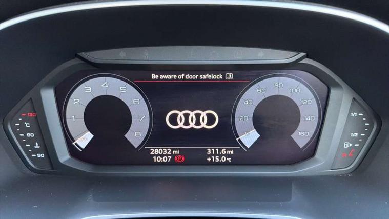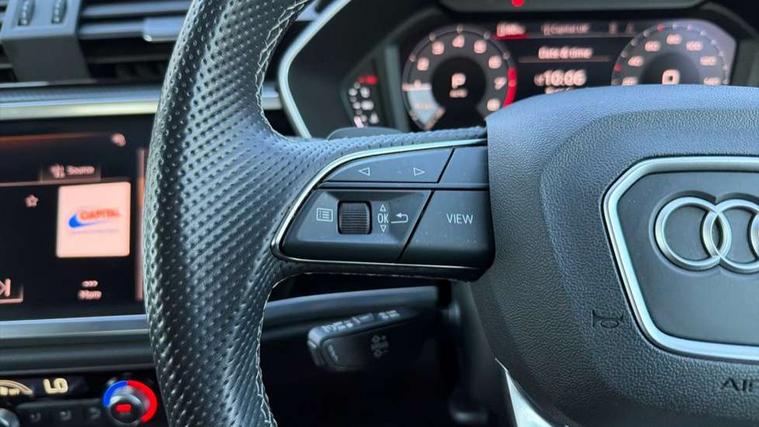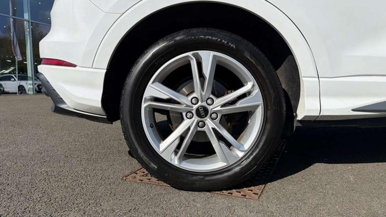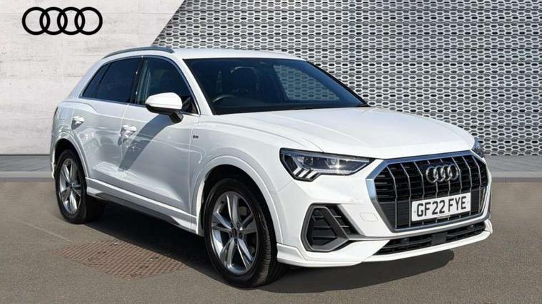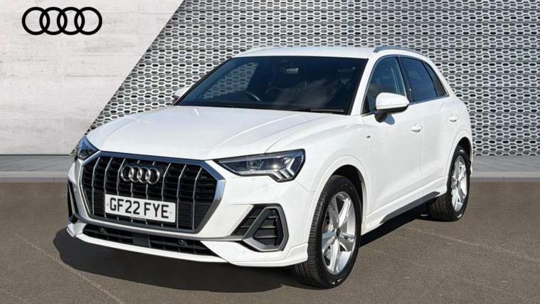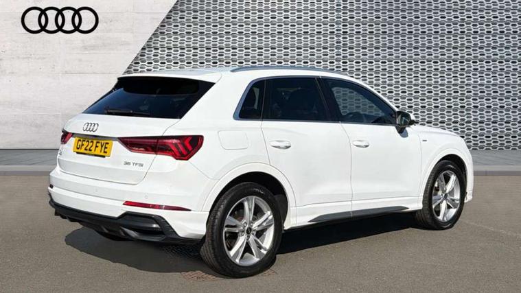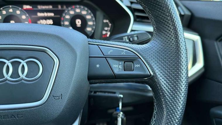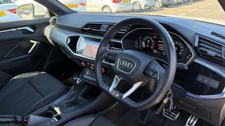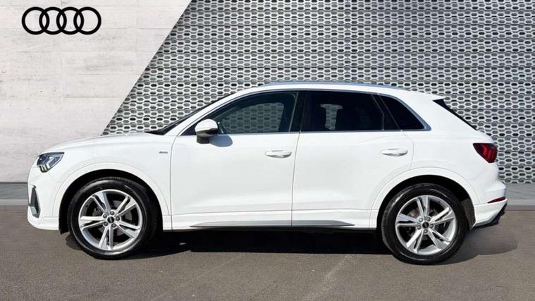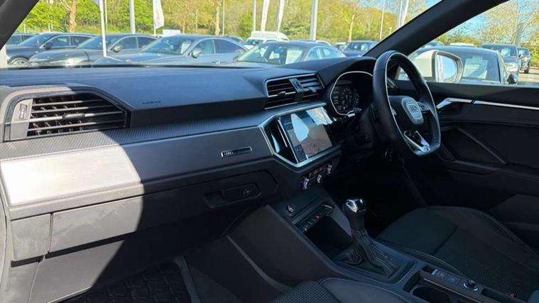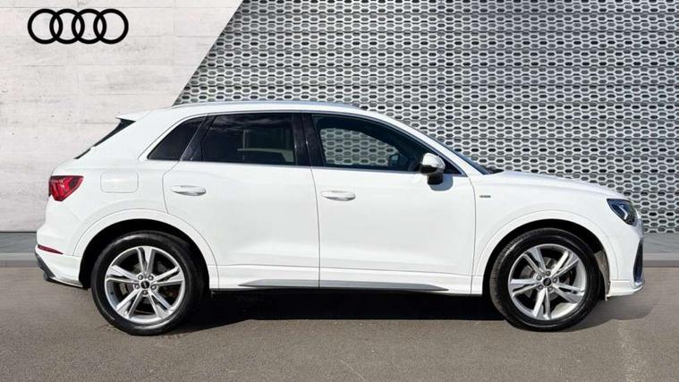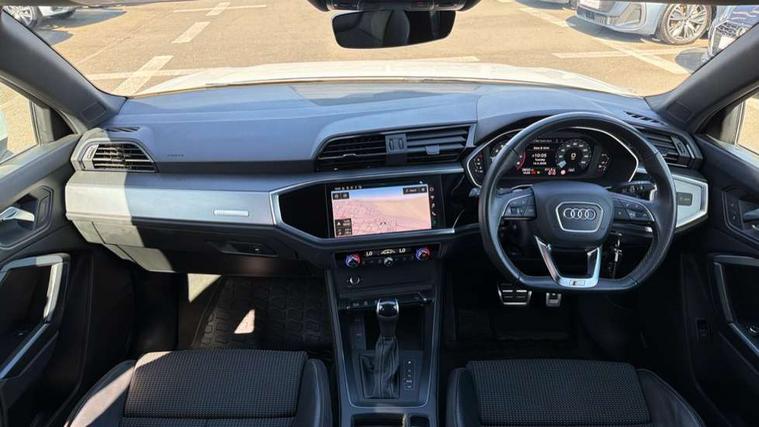 Amazon alexa Integration, Audi connect safety and service (e-call), Audi drive select, Audi lane departure warning, Audi Virtual Cockpit - 10.25" display, Bluetooth interface, Camera based traffic sign recognition, MMI Navigation Plus with high resolution 10.1 inch touchscreen colour display, Power operated tailgate, Progressive steering, Service interval indicator, Smartphone interface includes wireless Apple carplay/Android Auto, Start stop system with recuperation, Voice control system with natural language interaction, 48V Mild hybrid technology, Sports suspension, 2 USB-C ports with charge and data functions, 6 passive loudspeakers, DAB digital radio module, Acoustic windscreen, Aluminium roof rails, Aluminium window trim, Auto dimming frameless rear view mirror, Body coloured bumpers, Electrically folding, adjustable and heated door mirrors with integrated LED side indicators and kerb view function for passenger side, Front and rear electric windows, Front fog lights, Front side air inlets in matt platinum grey, Front spoiler blade in matt platinum grey, Grille vertical bars in aluminium silver/Matt, High gloss black finish B and C pillars, LED headlights with LED daytime running lights, LED rear lights, LED third brake light, Privacy glass dark tinted rear and rear-side windows (from B-pillar backwards), Rain and light sensors, Rear diffuser strip in matt titanium black, Rear side wing doors, Rear wiper, S line badges on front wings, S Line front and rear bumpers, Side skirt insert in matt Platinium grey, Silver chrome grille surround, Titanium black radiator grille, Variable front intermittent wipers, 12V socket in rear centre console, 3 seat bench in 2nd row, 40:20:40 folding with manual adjustment for 60:40 forwards/backwards position and backrest angle, Adjustable rear seat bench/backrest with centre armrest and cupholder, Black cloth headlining, Dual zone electronic climate control, Front and rear black floor mats with contrast stitching in rock grey, Front and rear headrests, Front and rear roof module including reading lights, Front centre armrest, Glove compartment lighting, Height and reach adjustable steering wheel, Illuminated door sill trims with S logo, ISOFIX child seat mounting for front passenger with airbag deactivation and outer rear seat including top tether attachment point for outer rear seats, Luggage compartment light, Manual front seats with height adjustment, Perforated leather gearknob, Single front passenger seat, Stainless steel luggage compartment sill finisher, Stainless steel pedals, Non smoking pack - Q3, 3x3 point rear seatbelts, 6 airbags - Driver, front passenger, curtain and side windows, Audi pre-sense front with pedestrain and cyclist recognition, Electromechanical parking brake, Electronic stabilisation control including ABS, ASR and EDL, Front seatbelt reminder, Hill descent control, Hill hold assist, Manual child lock in rear doors, Pre sense basic, Seatbelt monitoring, Tyre pressure warning, Warning triangle and first aid kit, Anti theft alarm, Anti theft wheel bolts, Immobiliser, Remote central locking, Dark matt brushed aluminium inlay, Detail dashboard around MMI touch colour display in glass look, black with surround in aluminium look, Leatherette door armrest, Tool kit, Tyre repair kit,