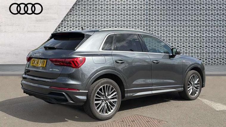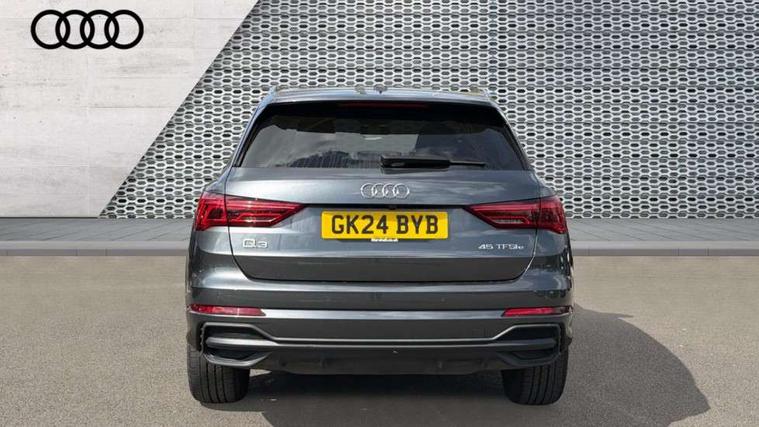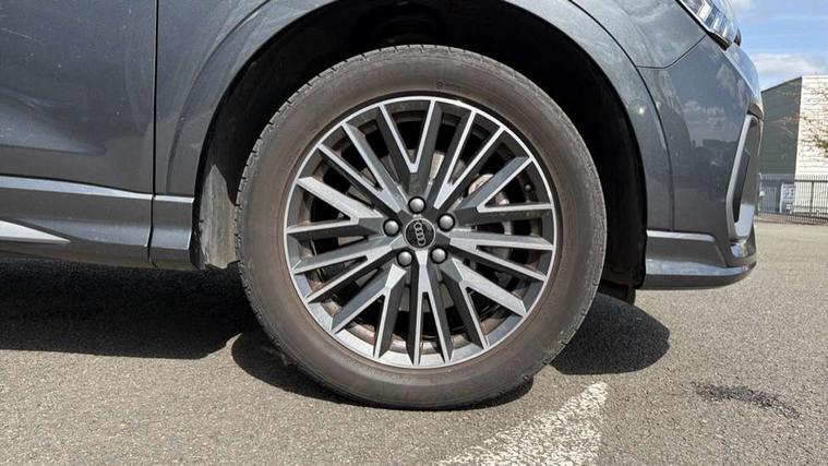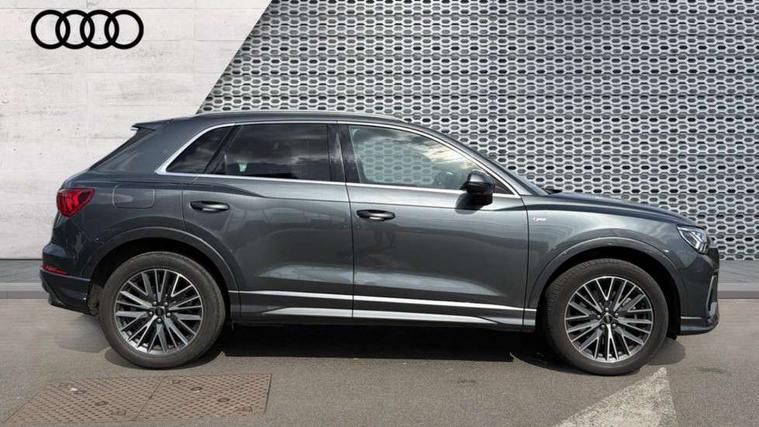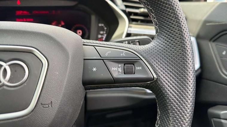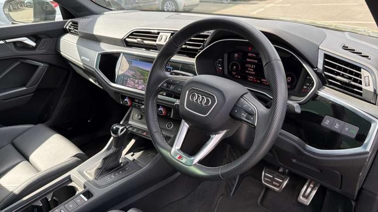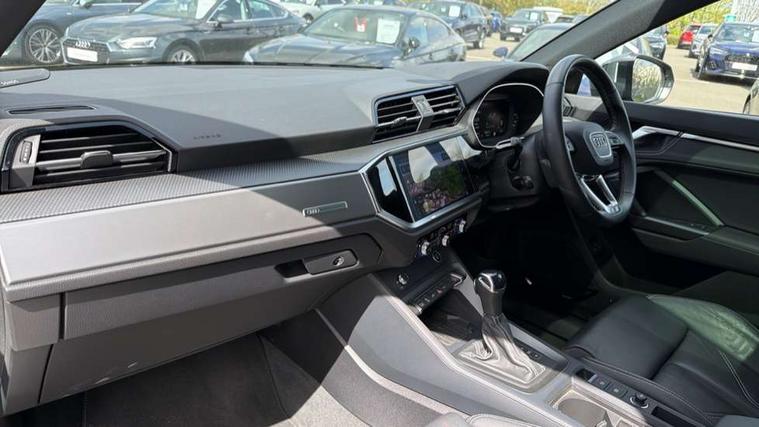 Amazon alexa Integration, Audi drive select, Audi lane departure warning, Audi Virtual Cockpit - 10.25" display, Bluetooth interface, Camera based traffic sign recognition, Legal emergency call, MMI Navigation Plus with high resolution 10.1 inch touchscreen colour display, Power operated tailgate, Progressive steering, Service interval indicator, Smartphone interface includes wireless Apple carplay/Android Auto, Start stop system with recuperation, Voice control system with natural language interaction, 3 pin 10 amp domestic charging cable, 3.6 kw On-board charger, Type 2 mode 3 32 amp charging cable, Type 2 socket for AC charging, 2 USB-C ports with charge and data functions, 6 passive loudspeakers, DAB digital radio module, Acoustic windscreen, Aluminium roof rails, Aluminium window trim, Anthracite black radiator grille, Auto dimming frameless rear view mirror, Body colour front spoiler blade, Body coloured bumpers, Electrically folding, adjustable and heated door mirrors with integrated LED side indicators and kerb view function for passenger side, Front and rear electric windows, Front fog lights, Front side air inlets in matt platinum grey, Grille vertical bars in aluminium silver/Matt, High gloss black finish B and C pillars, LED Dynamic rear indicators, LED headlights with LED daytime running lights, LED rear lights, LED third brake light, Privacy glass dark tinted rear and rear-side windows (from B-pillar backwards), Rain and light sensors, Rear diffuser grille in grained matt black, Rear diffuser strip in matt anthracite black, Rear side wing doors, Rear wiper, S line badges on front wings, S Line front and rear bumpers, Side skirt insert in matt Platinium grey, Variable front intermittent wipers, 12V socket in rear centre console, 3 seat bench in 2nd row, 3 spoke leather multifunction steering wheel features S badging and grips in perforated leather with contrast stitching, 40:20:40 folding with manual adjustment for 60:40 forwards/backwards position and backrest angle, Adjustable rear seat bench/backrest with centre armrest and cupholder, Black cloth headlining, Dual zone electronic climate control, Front and rear black floor mats with contrast stitching in rock grey, Front and rear headrests, Front and rear roof module including reading lights, Front centre armrest, Glove compartment lighting, Height and reach adjustable steering wheel, Illuminated door sill trims with S logo, ISOFIX child seat mounting for front passenger with airbag deactivation and outer rear seat including top tether attachment point for outer rear seats, Luggage compartment light, Manual front seats with height adjustment, Perforated leather gearknob, Single front passenger seat, Stainless steel luggage compartment sill finisher, Stainless steel pedals, Ambient lighting pack - Q3, Non smoking pack - Q3, 3x3 point rear seatbelts, 6 airbags - Driver, front passenger, curtain and side windows, Audi pre-sense front with pedestrain and cyclist recognition, Electrically operated child locks on rear doors, Electromechanical parking brake, Electronic stabilisation control including ABS, ASR and EDL, Front seatbelt reminder, Hill descent control, Hill hold assist, Pre sense basic, Seatbelt monitoring, Tyre pressure warning, Warning triangle and first aid kit, Anti theft alarm, Anti theft wheel bolts, Immobiliser, Remote central locking, Aluminium look interior elements, Dark matt brushed aluminium inlay, Detail dashboard around MMI touch colour display in glass look, black with surround in aluminium look, Leatherette door armrest, Tool kit, Tyre repair kit,